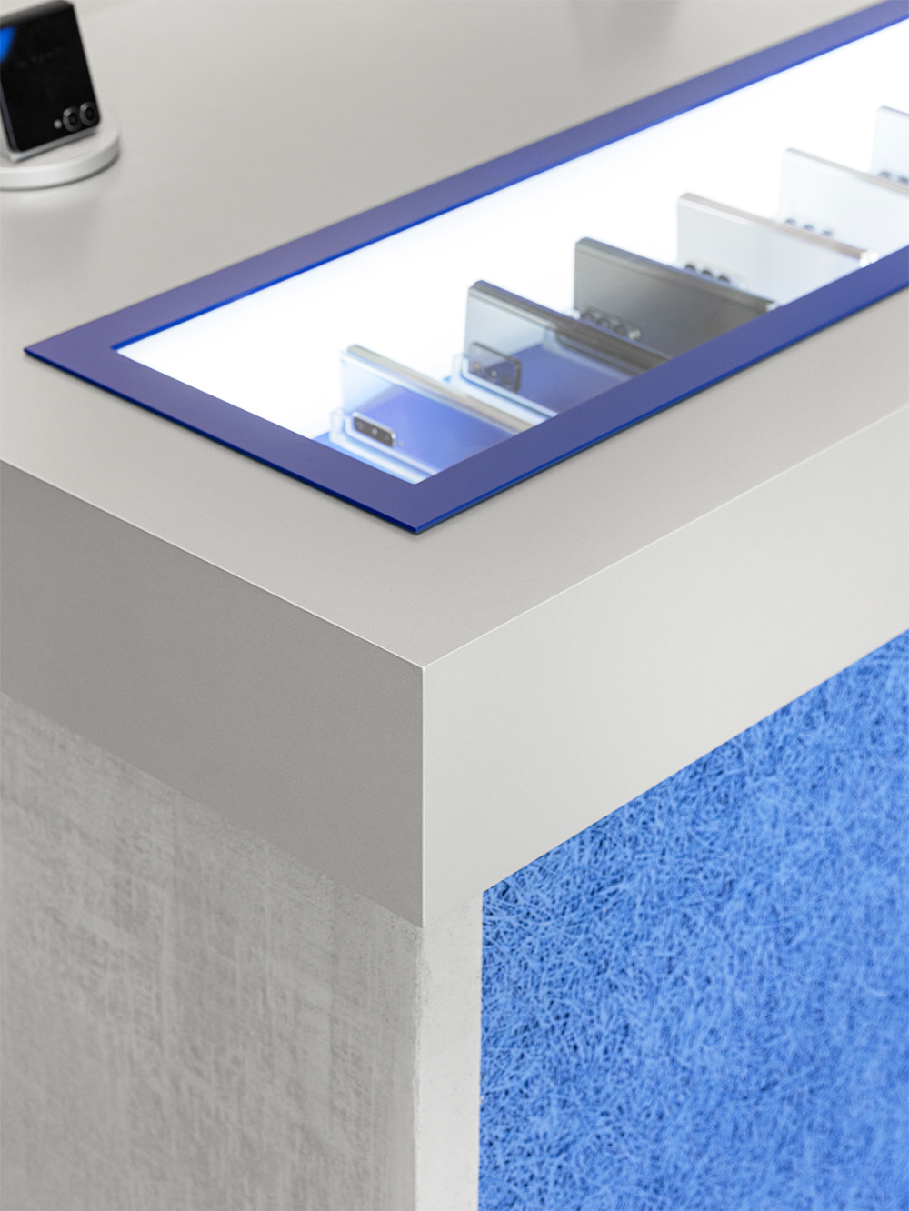 这种色彩规划并非单纯的美学选择,而是基于零售逻辑的精准设计——让访客在无引导的情况下,自动聚焦核心产品。材质与灯光则成为色彩的“调和剂”:蓝色模块采用哑光涂层处理,弱化了高饱和度的刺眼感;金属展架、玻璃展柜等冷材质表面,被蓝色灯光形成的柔和光晕包裹,中和了科技产品固有的“冰冷感”。入口处的品牌标识墙更是将这种策略推向极致——蓝色背光的品牌字样与磨砂玻璃结合,在光影作用下呈现出通透而坚定的视觉效果,既传递了科技品牌的专业属性,又为整个空间奠定了“温暖科技”的基调。