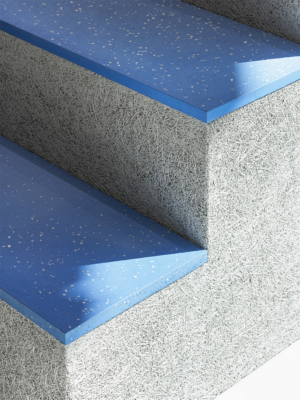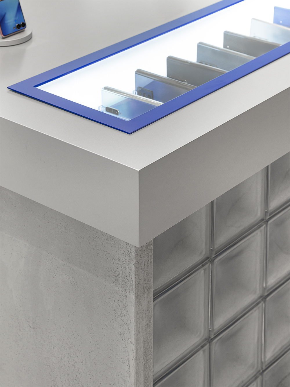 不同于传统电子卖场“金属+玻璃+炫光”的堆砌式设计,本案例以“克制的材质语言”传递科技质感,让产品成为空间的真正主角。材质的组合遵循“基底凸显、细节点睛”的原则,构建出层次分明又不喧宾夺主的视觉效果。基础材质以低饱和度、低存在感为核心:浅灰水磨石地面耐磨且质感温润,白色涂料墙面简洁干净,两者共同构成中性基底,让蓝色体验模块与各类电子产品成为视觉焦点;点睛材质则以“精致感”强化科技属性:玻璃砖隔断采用“透光不透明”的特性,既能划分空间又不阻碍光线流通,形成朦胧的科技氛围;金属收边则以细腻的拉丝工艺处理,避免了粗重金属带来的工业感,仅在细节处传递精致质感。