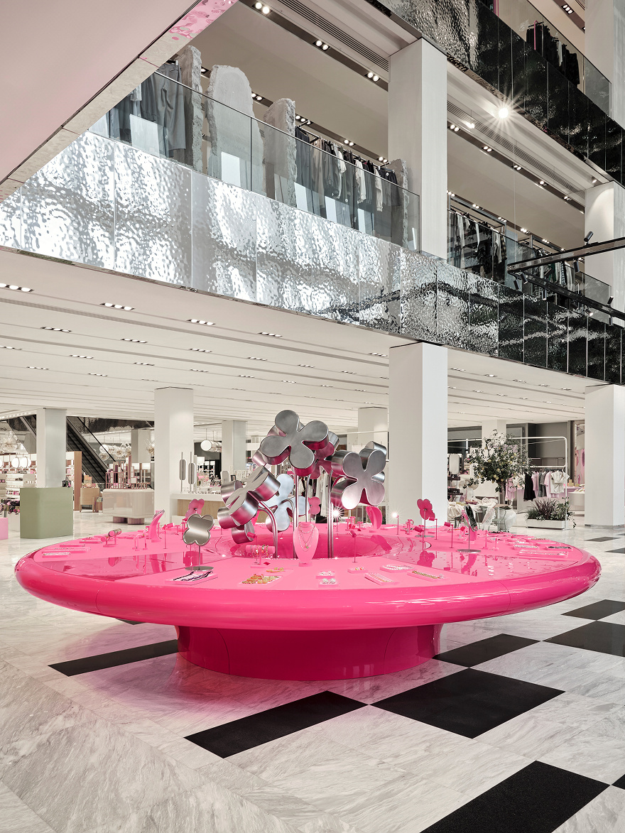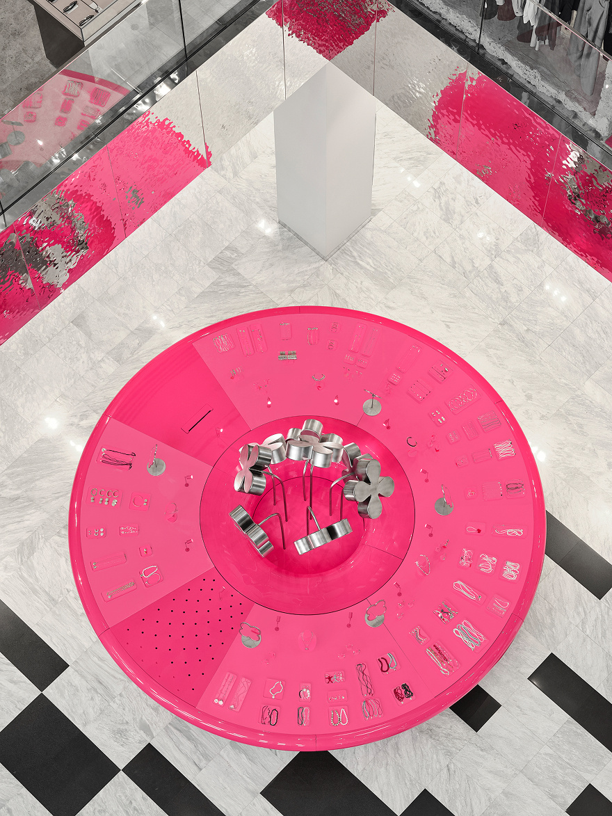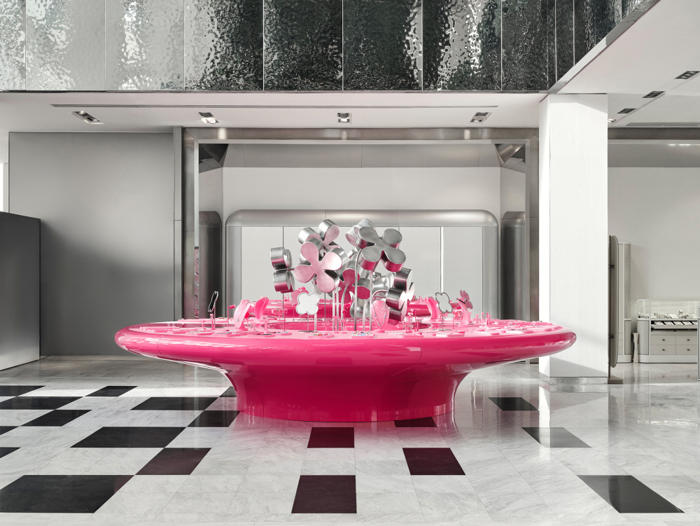 快闪店的核心视觉,由亮粉色巨型中央展台与金属质感装饰共同构建,从远处便能瞬间抓住视线: