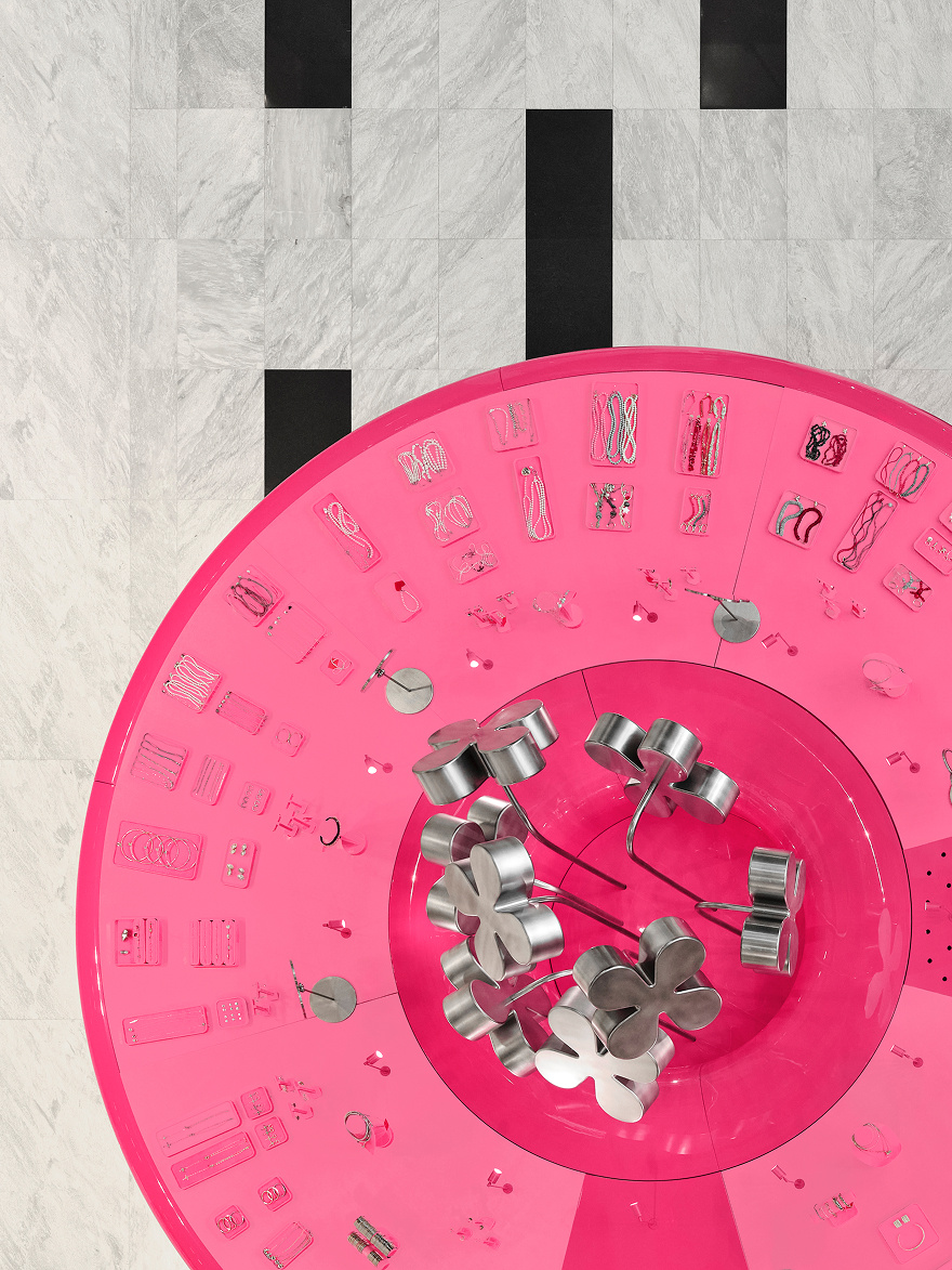 隐藏式的灯光系统嵌入展台与天花板,光线柔和却精准 —— 重点照亮饰品的细节(如金属光泽、宝石切面),让饰品的质感与美感充分展现;同时,灯光也为粉色展台与金属装置 “镀上一层柔光”,进一步强化了空间的超现实氛围,让顾客在挑选时,能更专注于饰品的美感与自身的搭配想象。