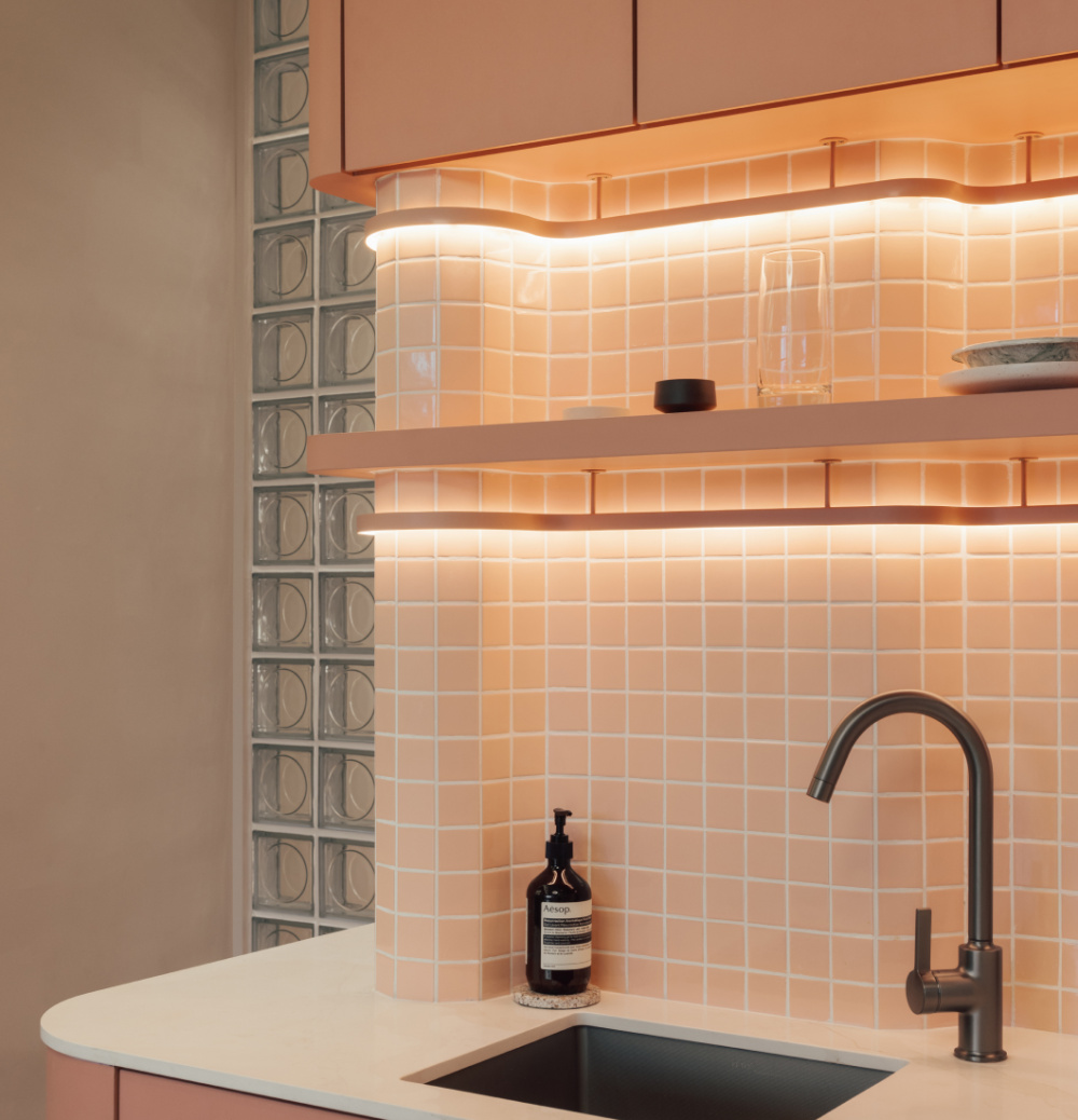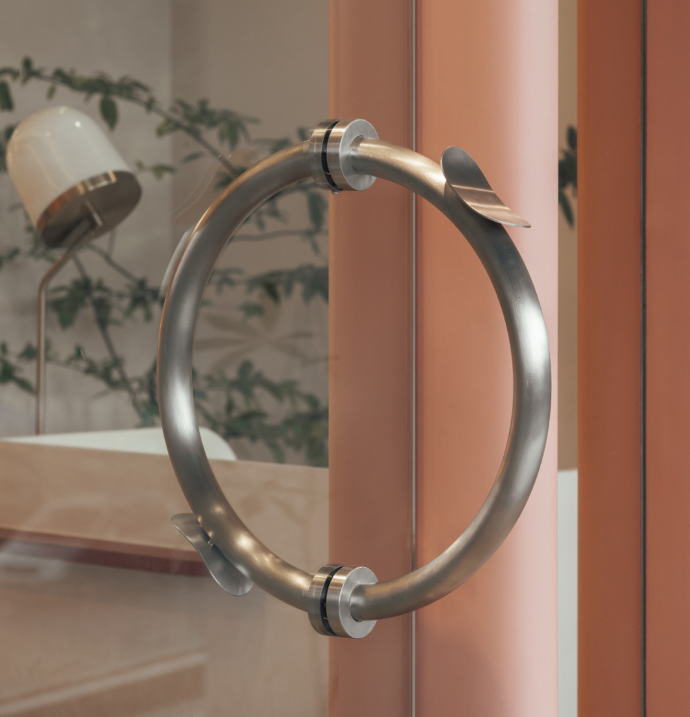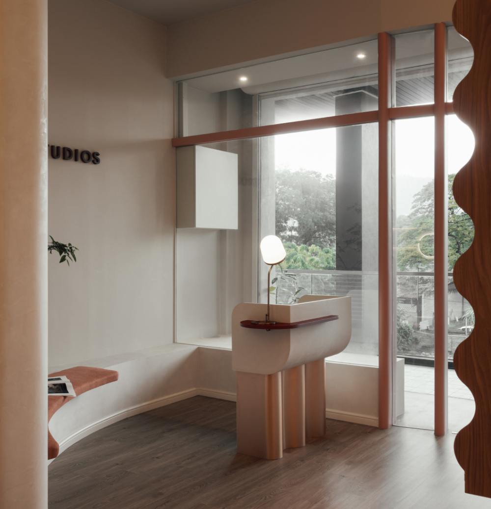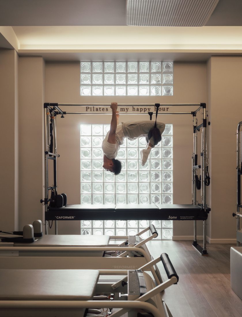 “材质是空间的触觉语言”,工作室拒绝标准化家具,坚持所有家具本地定制,让材质与形态深度服务于品牌定位与运动需求:材质选择:兼顾实用与品牌调性从接待区的肌理墙面到运动区的防滑地面,材质选择均围绕 “耐用性” 与 “品牌质感” 双重标准 —— 运动区地面采用防滑且有弹性的定制材质,适配普拉提器械的移动与用户的肢体接触;等候区家具则选用亲肤的布艺与温润的木质,搭配土粉色调,强化 “松弛感” 的同时,传递品牌 “注重细节与体验” 的内核;家具形态:与品牌身份深度绑定定制家具不再是 “单纯的功能载体”,而是品牌符号的延伸 —— 接待台的弧形边缘、等候区沙发的流线造型,均呼应普拉提运动的 “流动感”;部分家具表面的肌理处理,与品牌 LOGO 的线条元素相呼应,让 “品牌识别” 渗透到空间的每一处触觉体验中,避免了 “运动空间 + 通用家具” 的刻板组合。