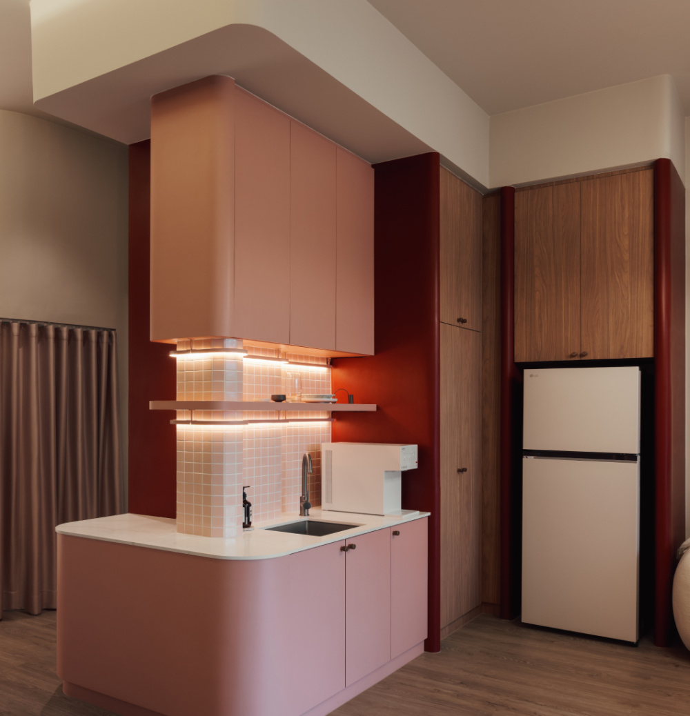 设计团队以色彩为核心语言,用两种截然不同却相互呼应的色调,分别对应普拉提运动的 “动态能量” 与用户的 “心理需求”,让色彩成为空间情绪的直接传递者:酒红色调:注入运动的折衷活力作为象征 “运动能量” 的主色调,浓郁的酒红色被运用在接待区背景墙、器械周边装饰等视觉焦点区域。不同于传统运动空间的高饱和亮色,酒红色自带沉稳的张力,既传递出普拉提运动中 “力量与控制” 的动态感,又避免了过度刺激的视觉疲劳,让 “活力” 更具层次与质感,瞬间抓住用户注意力,强化品牌的记忆点;土粉色调:呼应运动的流动与松弛象征 “心理状态” 的土粉色,以低饱和的柔和质感,覆盖在等候区沙发、墙面局部、地面拼接等区域。这种色调自带温暖、舒缓的属性,恰好呼应普拉提运动 “注重呼吸与身体流动” 的特质,能有效消解用户运动前的紧张感,从视觉层面营造 “身心放松” 的氛围,让空间成为 “运动前心理过渡” 的缓冲带。