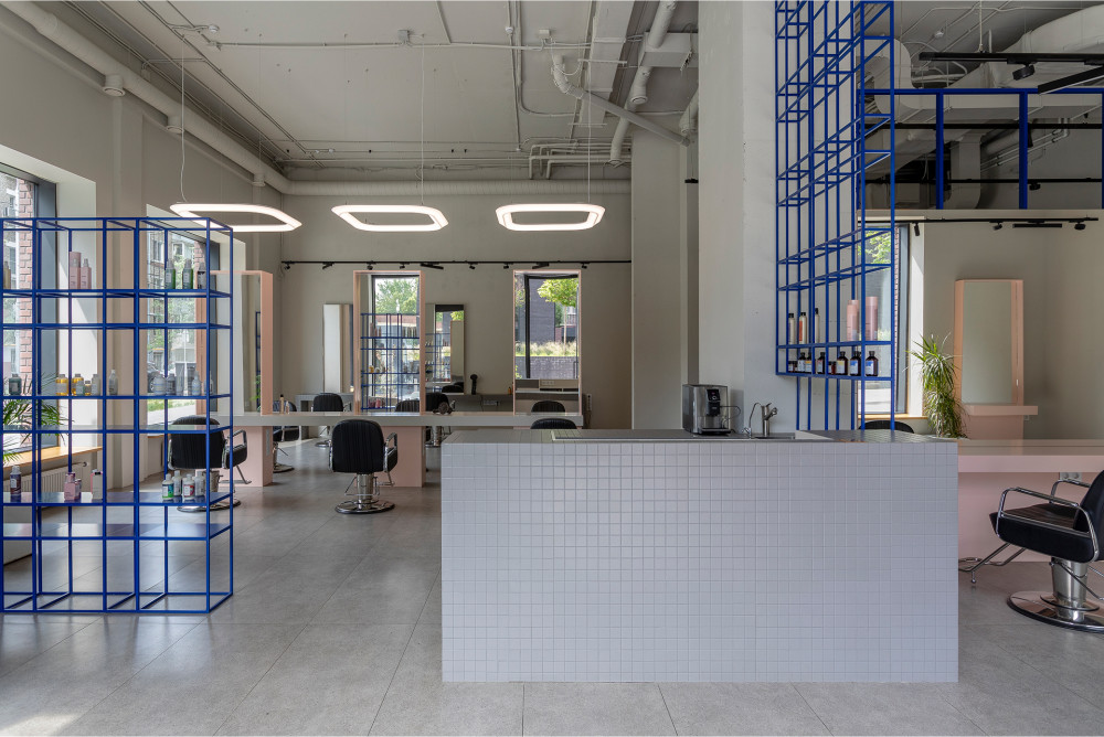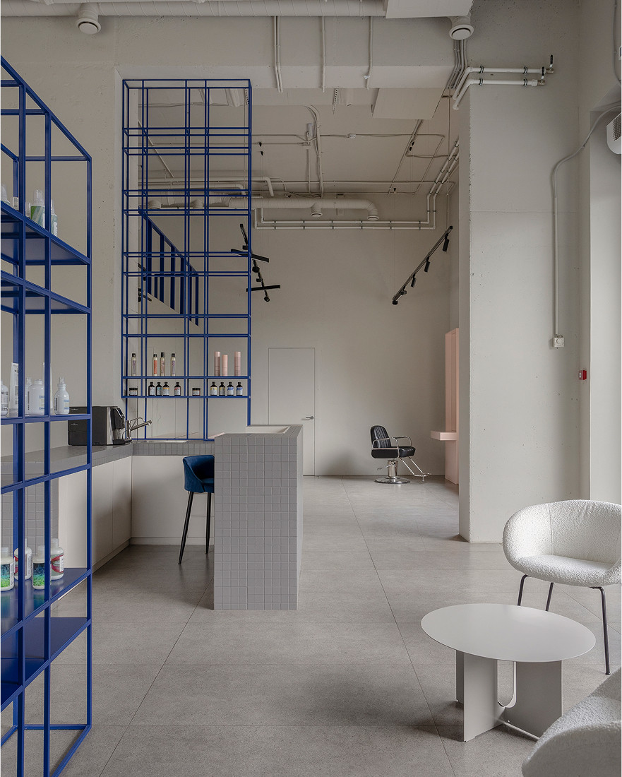 在美发沙龙店空间设计同质化的当下,该理发店以 “轻时尚” 为核心,跳出传统美发店 “浮夸奢华” 或 “单调刻板” 的窠臼。通过克莱因蓝金属架的视觉冲击、裸粉色镜柱的柔和过渡、光影与材质的协同营造,将 “美发” 从单纯的 “造型服务” 升维为 “沉浸式美学体验”,为行业提供了 “功能与艺术平衡” 的设计范本。