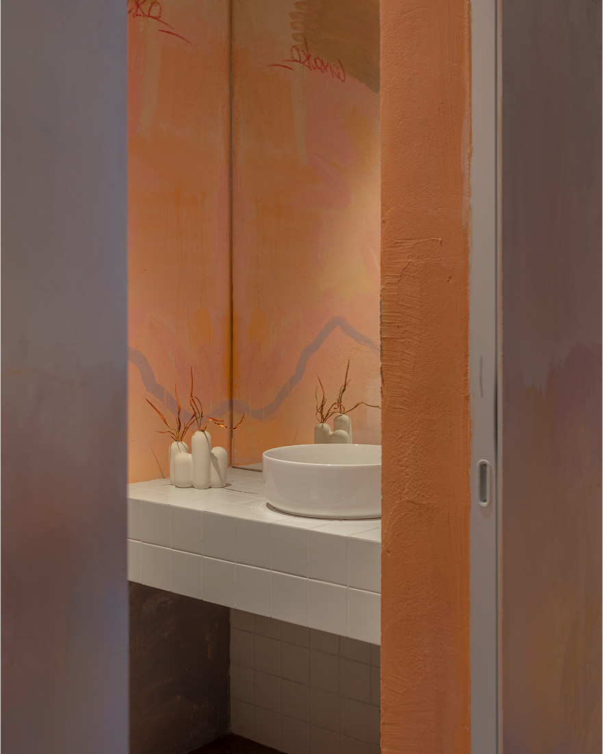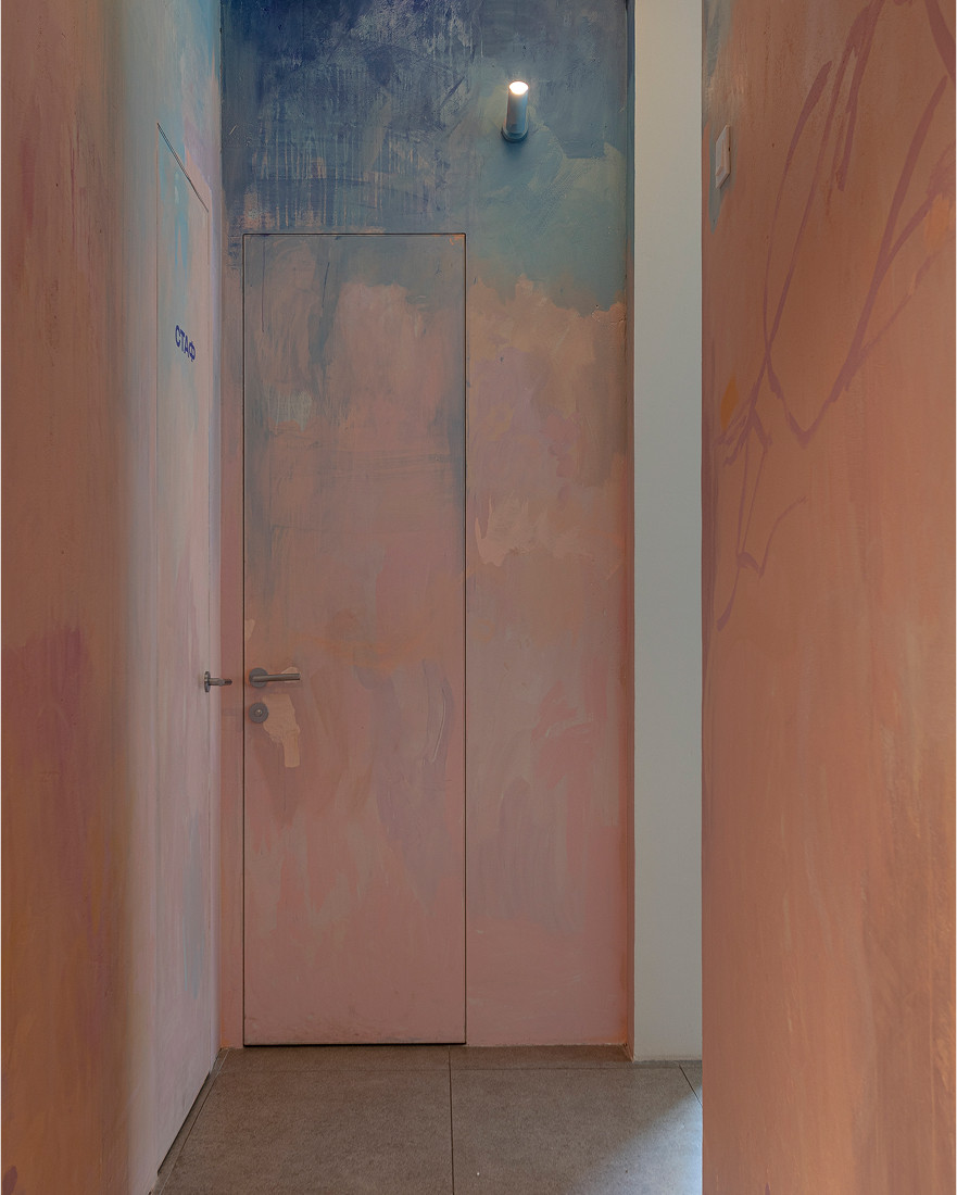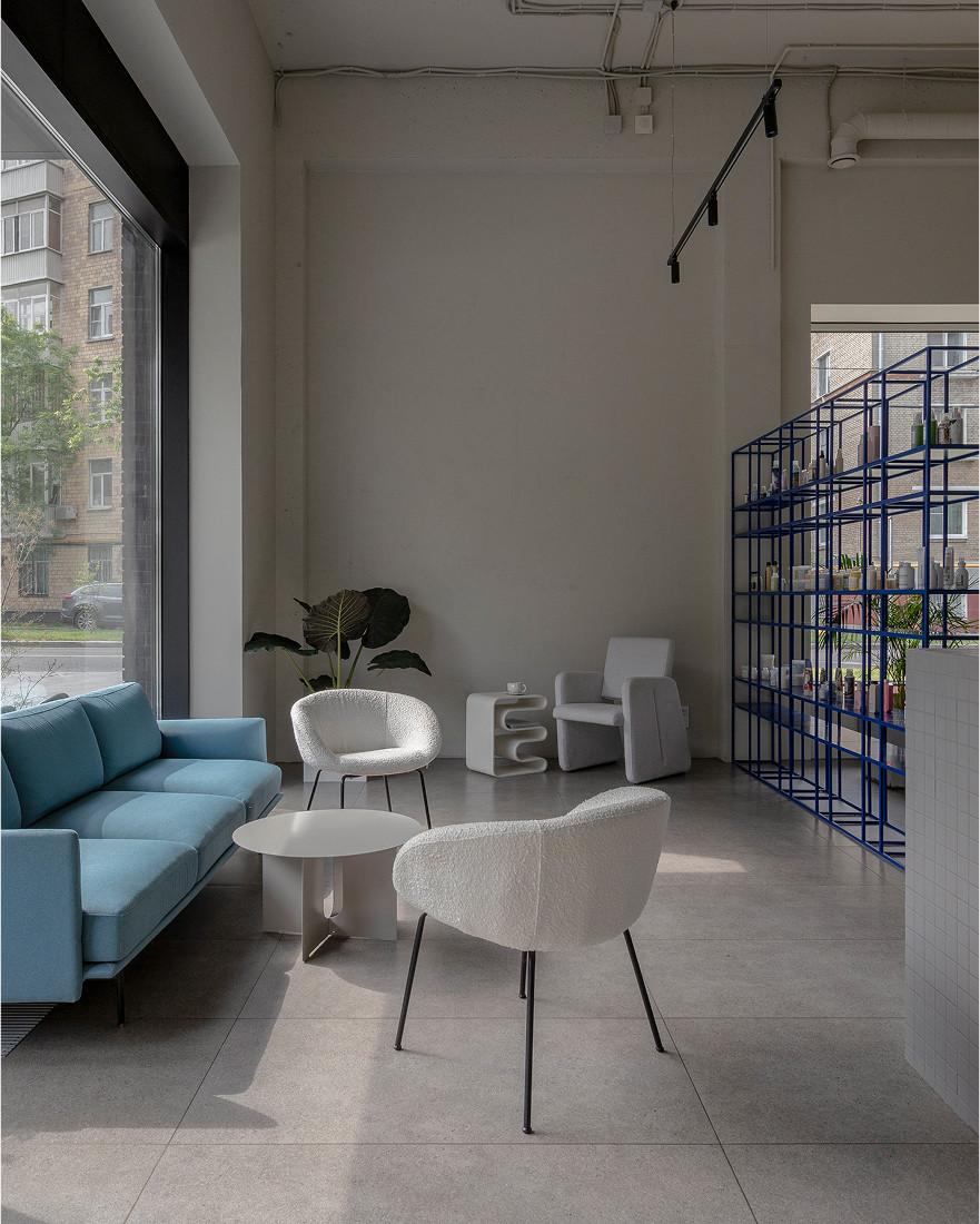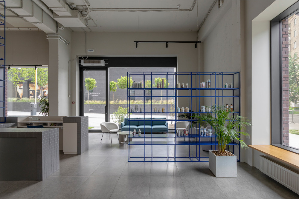 美发空间需同时满足 “社交互动” 与 “个人隐私” 的需求,设计团队通过功能分区的隐性划分与结构元素的引导,实现了 “开放感” 与 “私密性” 的平衡:开放空间的流动性:打破边界,促进互动整体空间以 “大开放” 为基底,舍弃了传统美发店 “隔间式” 的封闭布局,让光线与视线能自由穿透。这种设计既强化了 “空间通透感”,也为顾客间的 “社交互动” 提供了可能 —— 等候区的休闲座椅、理发区的开放式布局,让同行的顾客可轻松交流,甚至陌生顾客也能因 “共享美学空间” 产生话题,无形中增强了品牌的 “社交属性”;分区的隐性划分:结构引导,保障隐私克莱因蓝金属架与裸粉色镜柱,不仅是色彩与艺术元素,更承担了 “隐性分区” 的功能。金属架在入口处形成 “视觉屏障”,既展示产品,又巧妙划分出 “接待区” 与 “理发区” 的边界;镜柱的排列则在理发区内部,通过 “镜面反射” 与 “物理遮挡”,为每位顾客营造出 “专属小空间”,让顾客在享受美发服务时,能拥有相对私密的体验,避免了 “开放空间下的暴露感”。