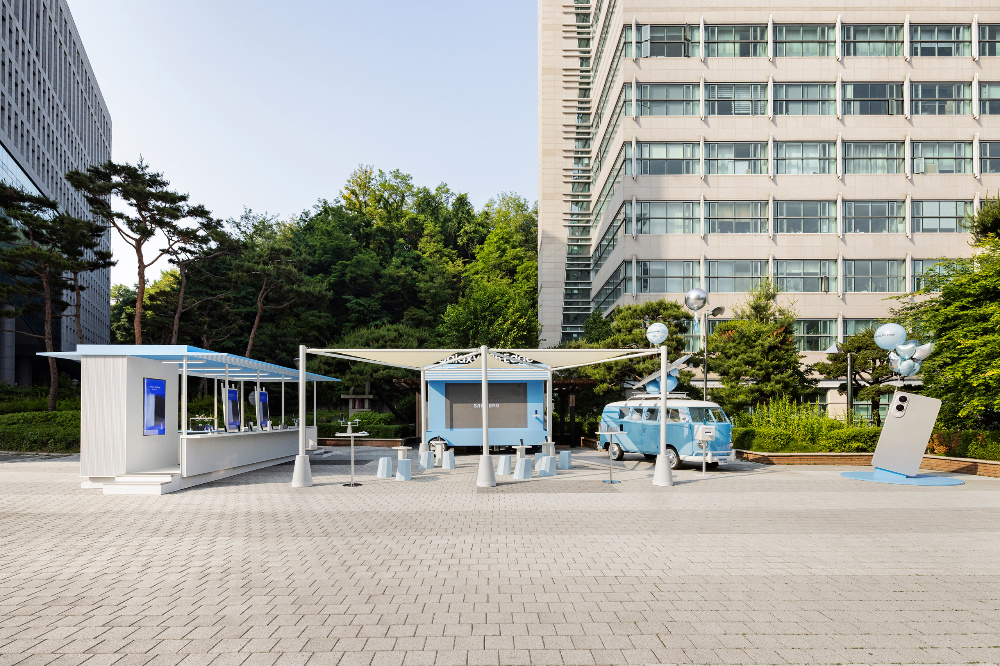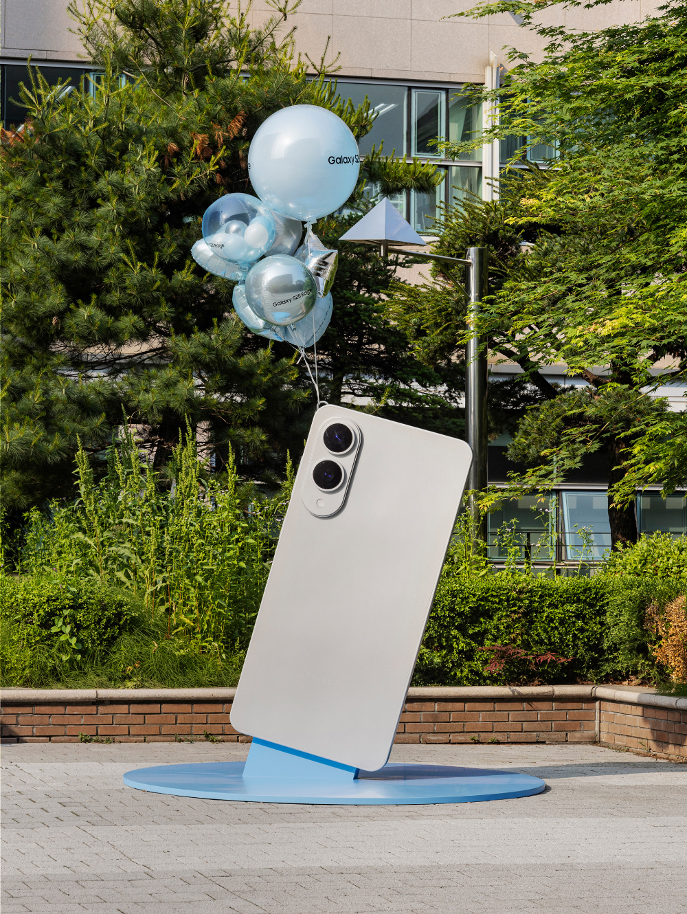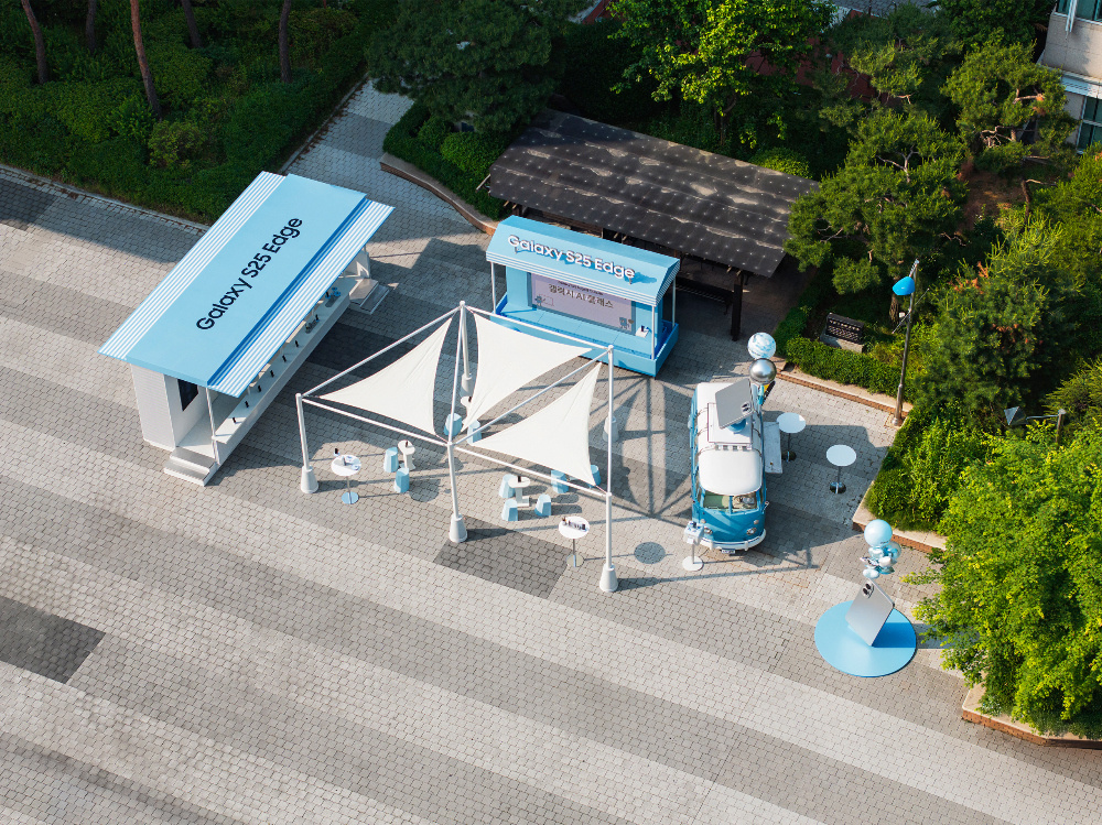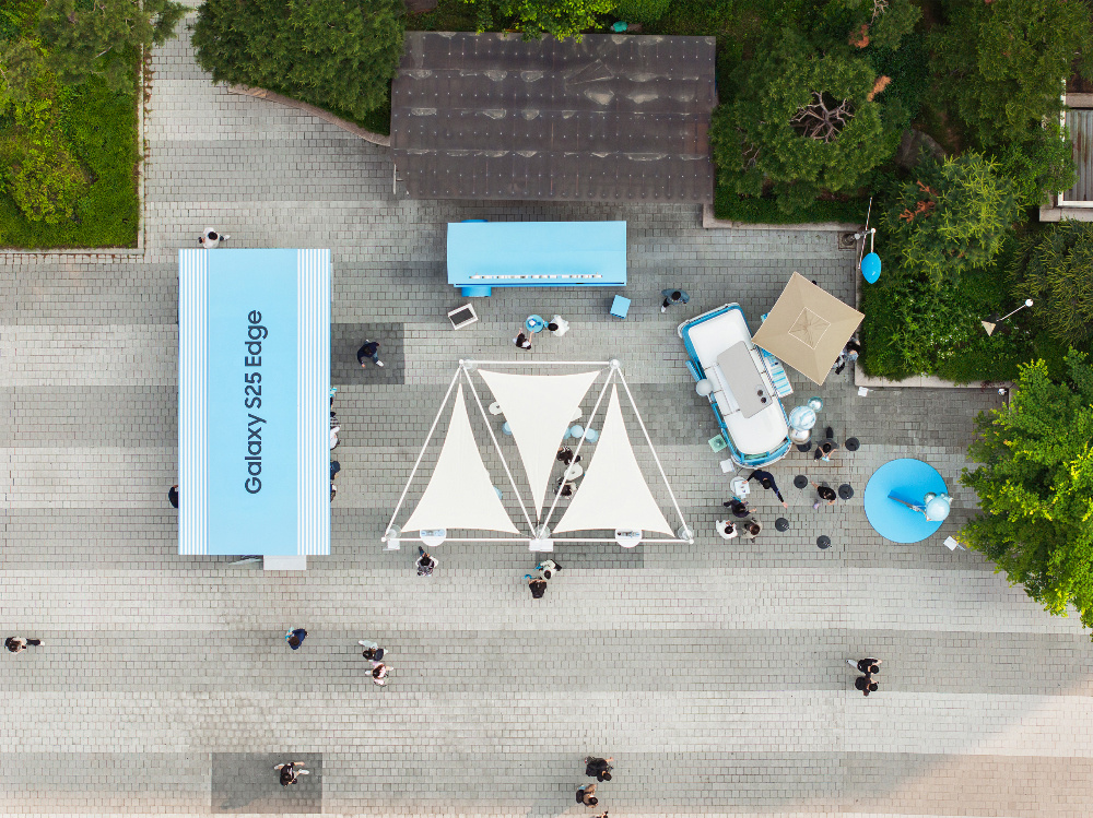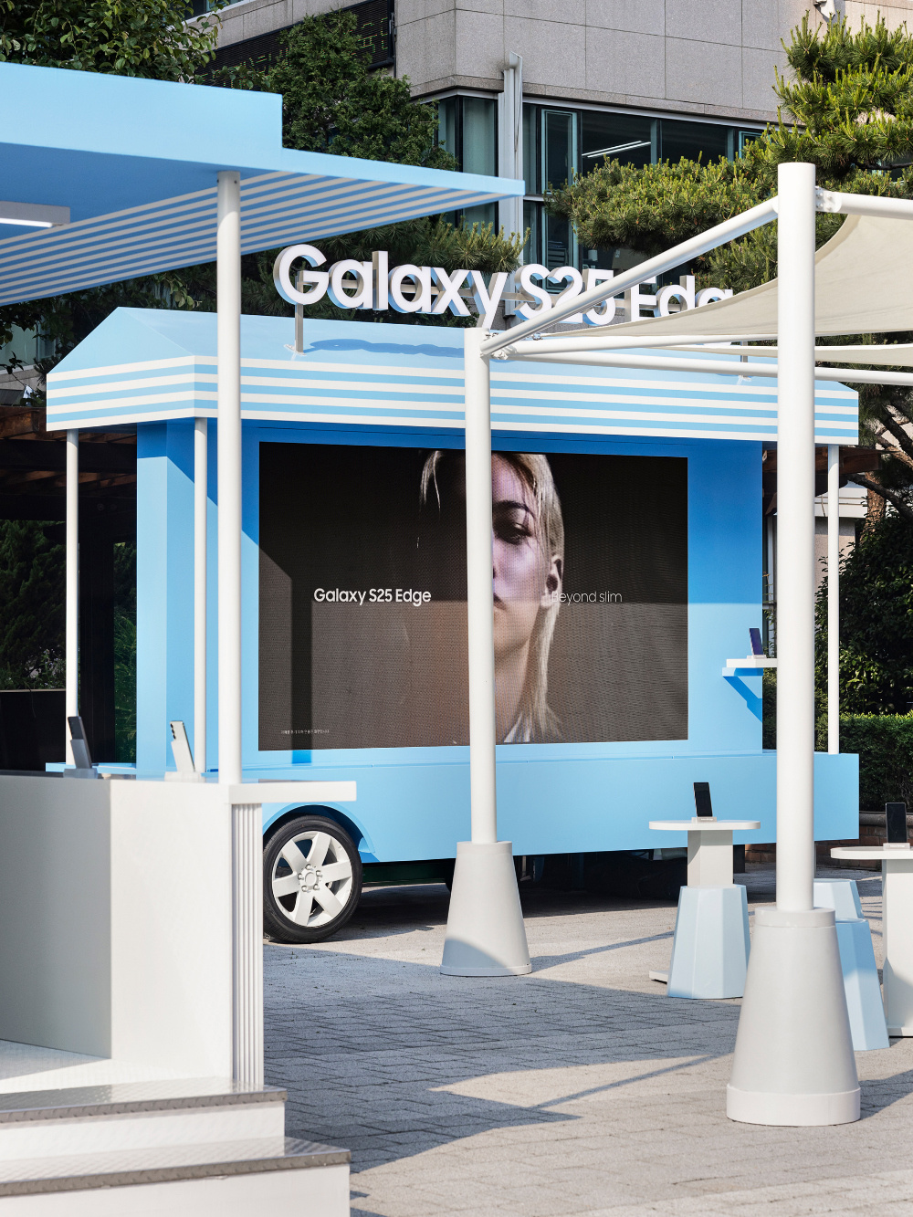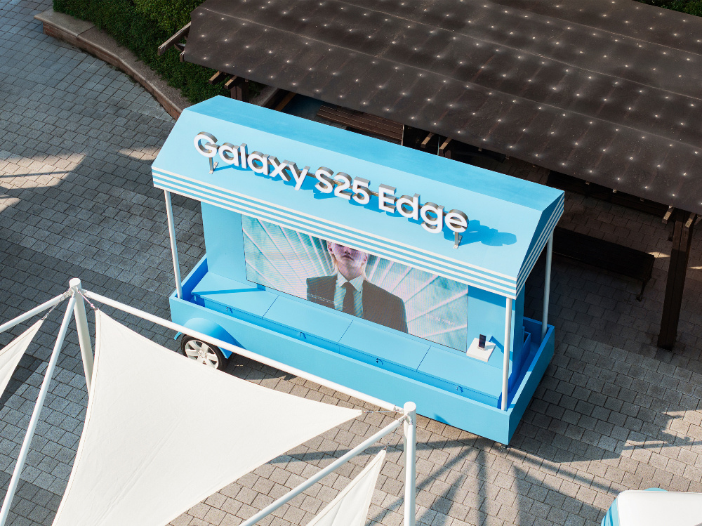 冰蓝作为 Galaxy S25 Edge 的核心视觉符号,被大量应用于移动售卖车、主展示亭、装饰气球等载体。冰蓝的 “冷色调属性” 天然关联 “科技、未来” 的意象,契合手机产品的 “智能科技” 定位;同时,在户外公共空间中,冰蓝又能带来 “视觉清凉感”,缓解夏日广场的燥热感,吸引行人主动靠近,实现 “品牌传播” 与 “体验引流” 的双重作用;