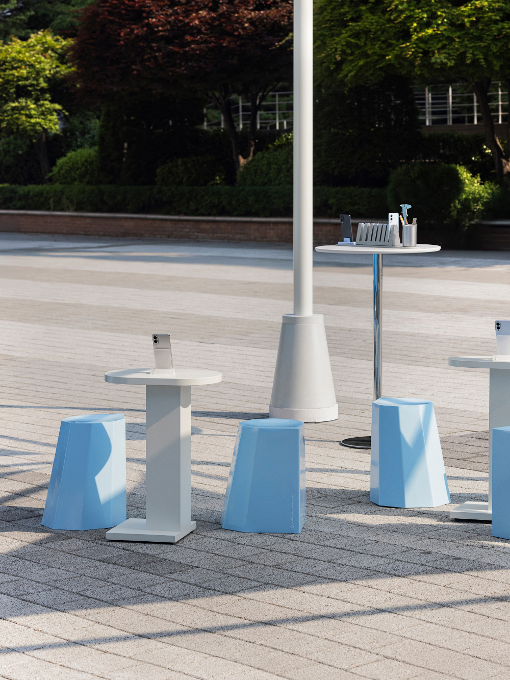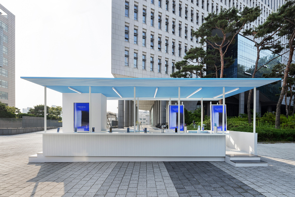 白色展具、遮阳帆、地面铺装等元素,以 “纯净感” 营造出 “简洁、通透” 的空间基底。白色的 “反光性” 增强了空间的明亮度,让冰蓝元素更显突出;同时,白色的 “中性特质” 如同 “画布”,能最大化衬托 Galaxy S25 Edge 的产品质感 —— 当手机陈列于白色展架,产品的 “轻薄、精致” 得以充分展现,实现 “产品特质” 与 “空间氛围” 的无缝衔接。