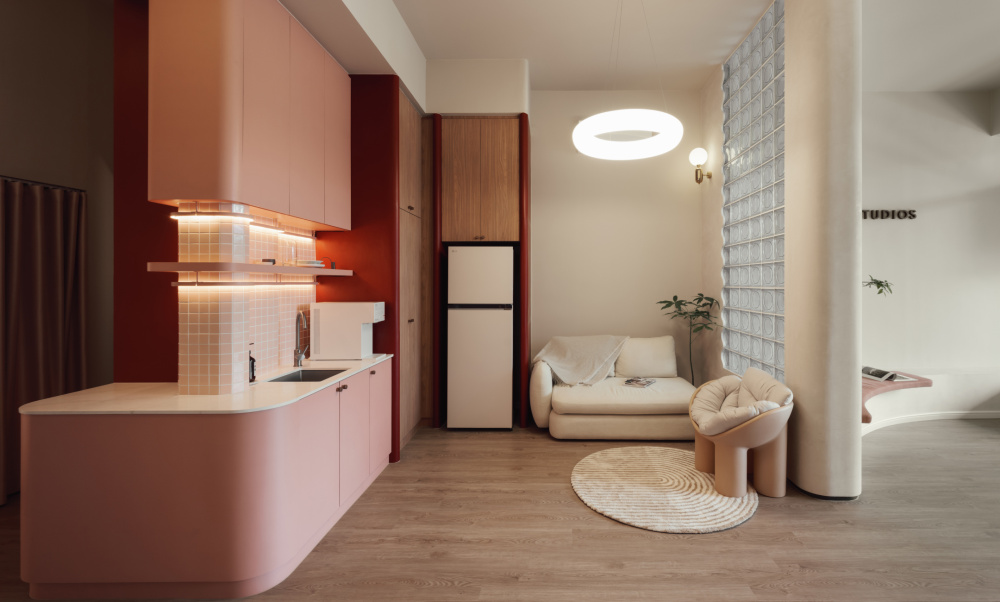 该普拉提兼瑜伽馆设计是两种不同的调色板分别用于象征心理和运动——浓郁的酒红色调注入了活力和折衷的能量,而土粉色调则反映了普拉提的流动性。