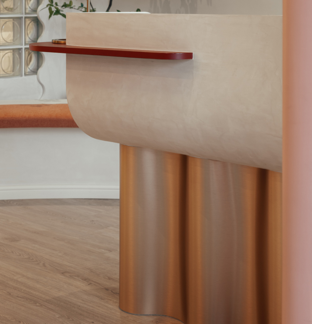 这个普拉提工作室的材料和家具对我们来说就是一切,让所有的家具都可以在当地定制。我们试图通过戏剧性的形式和活力来利用普拉提的美丽和能量,以最好地捕捉品牌的身份。