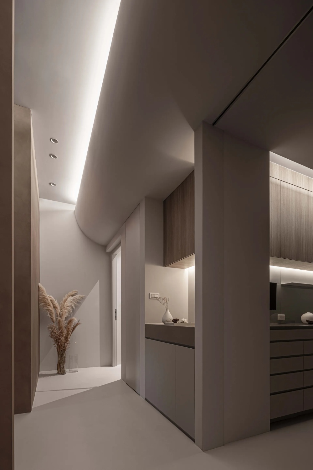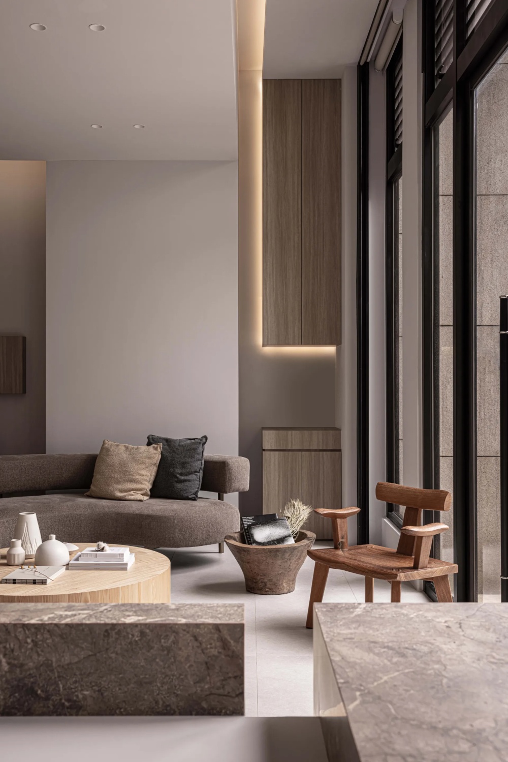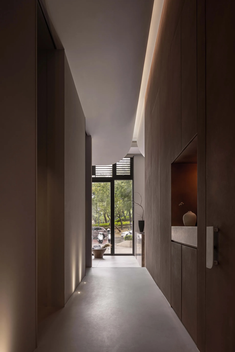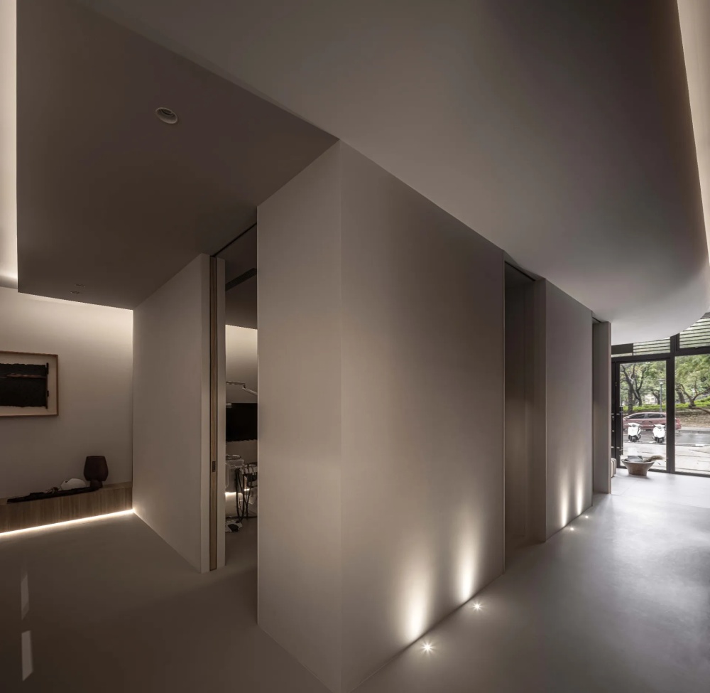 宋昌志用 “内建筑” 思维做室内设计,比如把建筑屋顶概念融入天花:受廊香教堂启发,他在一楼 4.7 米挑高的空间里,加入两个半径 110 公分的弧状天花,用间接光勾勒轮廓。这些弧形像森林里舒展的树梢,间接光则如叶隙间的清透光芒 —— 既解决了挑高空间的尺度难题,又让 “森釉” 的名字有了具象寄托,让身处其中的人,随时能感受到自然的温柔。