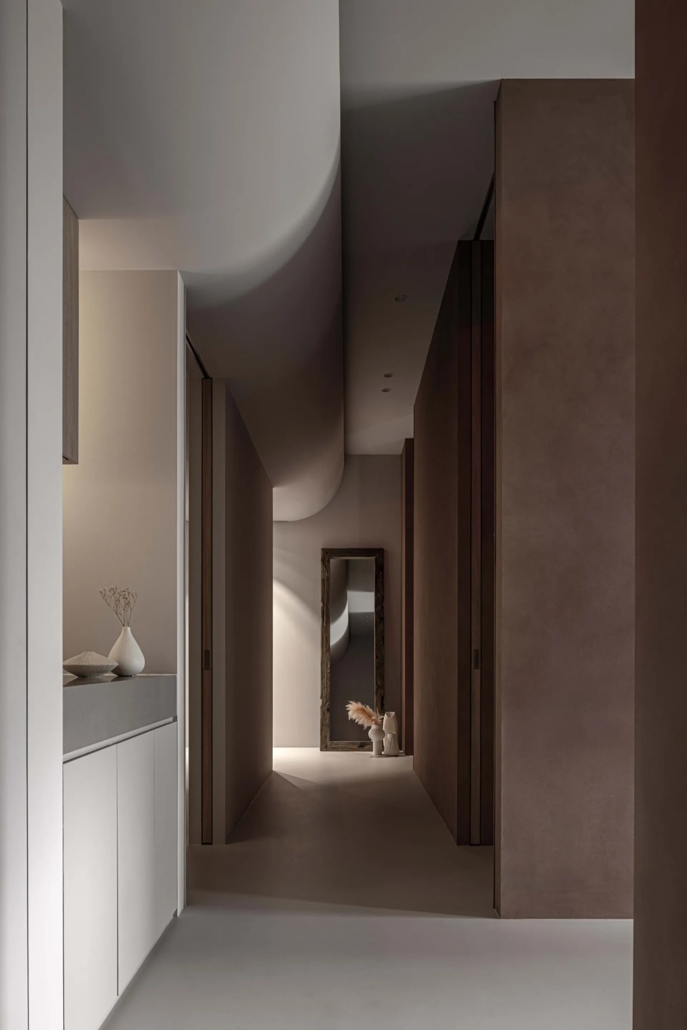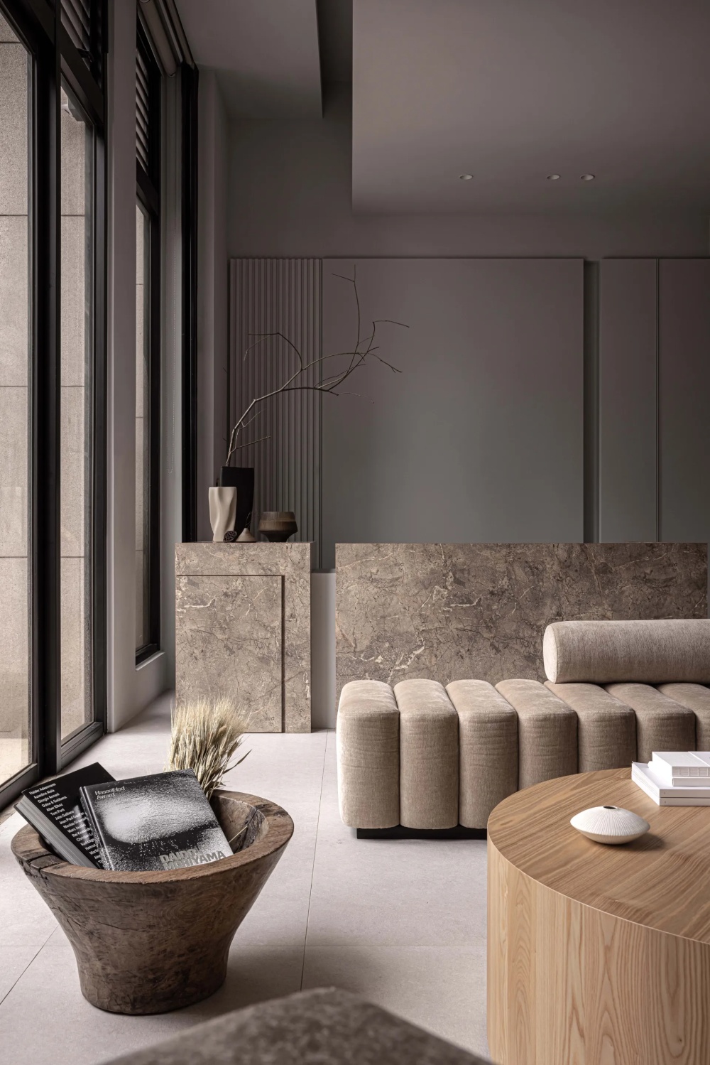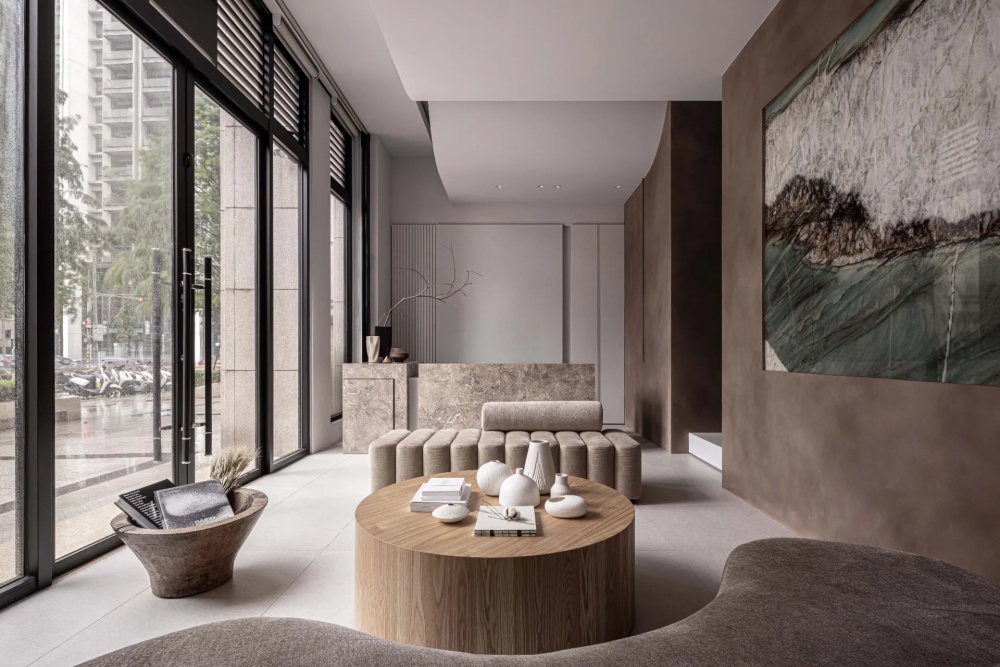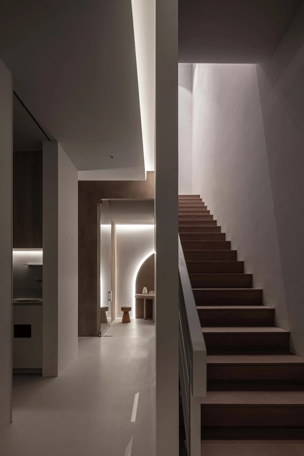 宋昌志用 “内建筑” 思维做室内设计,比如把建筑屋顶概念融入天花:受廊香教堂启发,他在一楼 4.7 米挑高的空间里,加入两个半径 110 公分的弧状天花,用间接光勾勒轮廓。这些弧形像森林里舒展的树梢,间接光则如叶隙间的清透光芒 —— 既解决了挑高空间的尺度难题,又让 “森釉” 的名字有了具象寄托,让身处其中的人,随时能感受到自然的温柔。