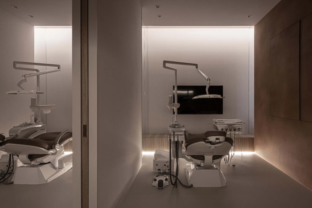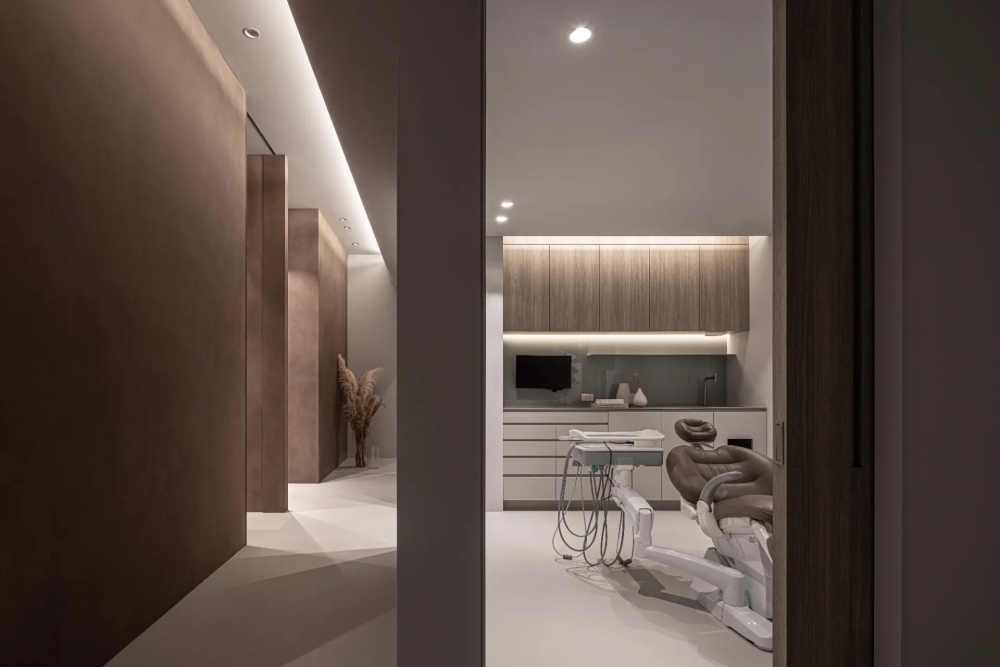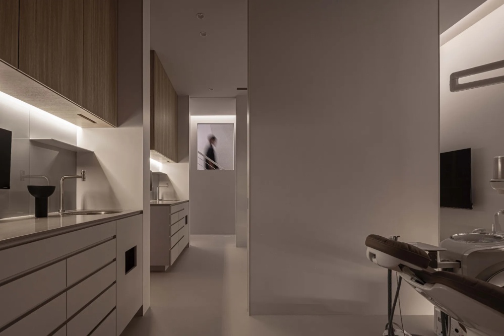 “动线是牙科设计的难点”,宋昌志说。诊所要兼顾患者、医生、助理上下层穿梭不干扰,还要区分干净与用过的器械路线,每个诊间甚至需多出入口方便助理支援 —— 这背后离不开和业主的前期深度沟通。设计师没让格局限制动线,而是尊重人的自由选择:以窗外景观为基础规划空间轴线,让室内走道随机能延伸,周边空间彼此呼应又有序,既解决医疗动线需求,又不让人觉得被 “引导”,反而能自在游走。