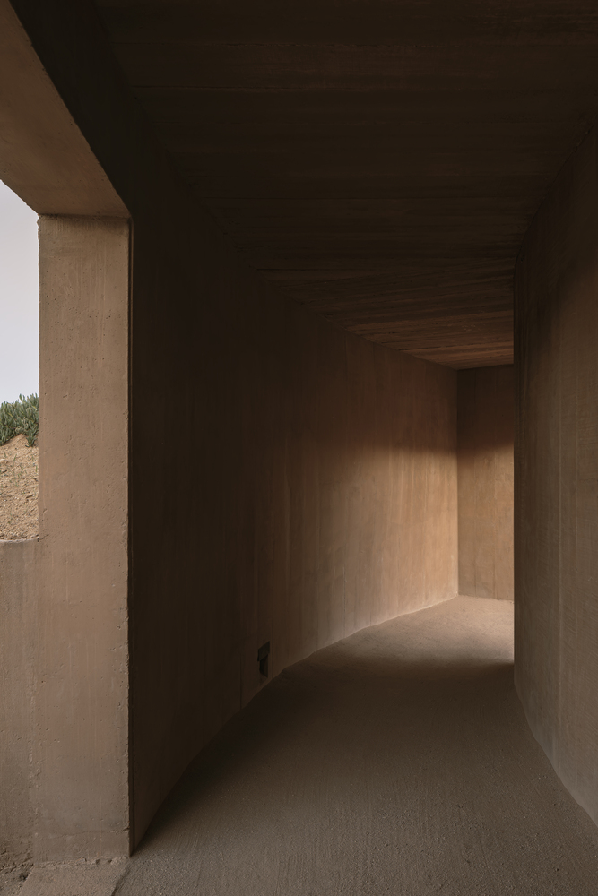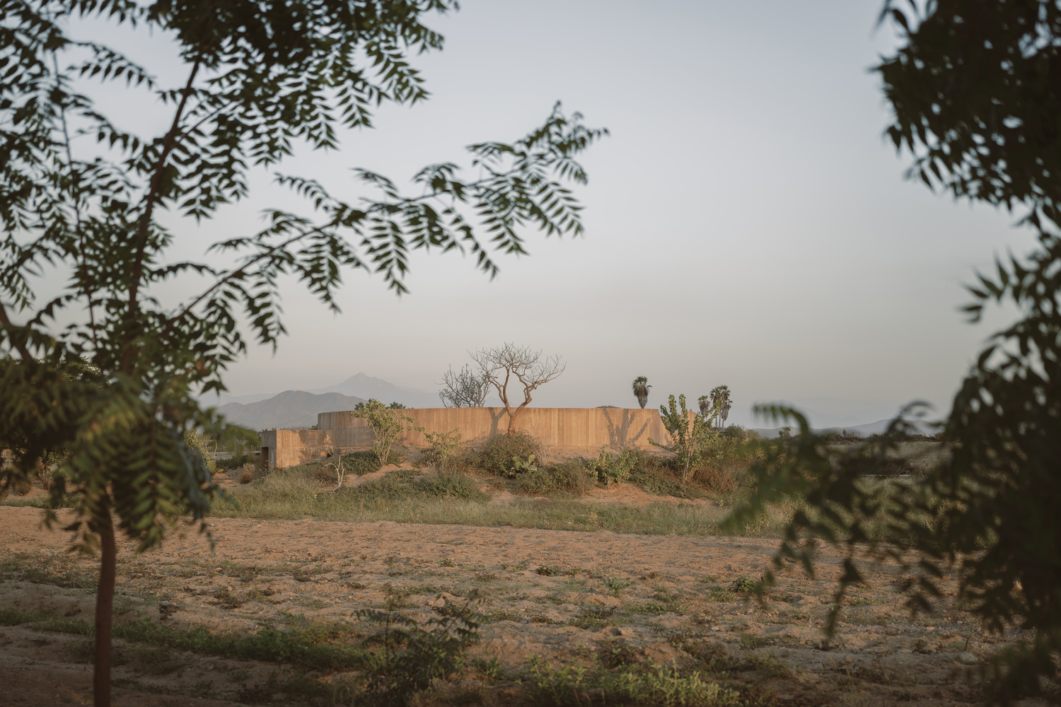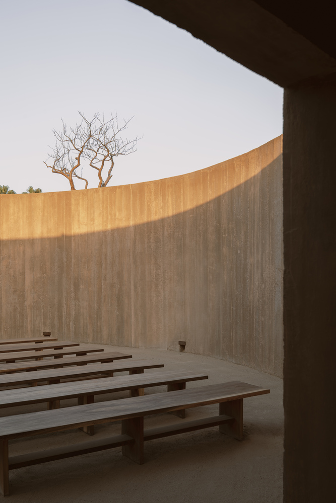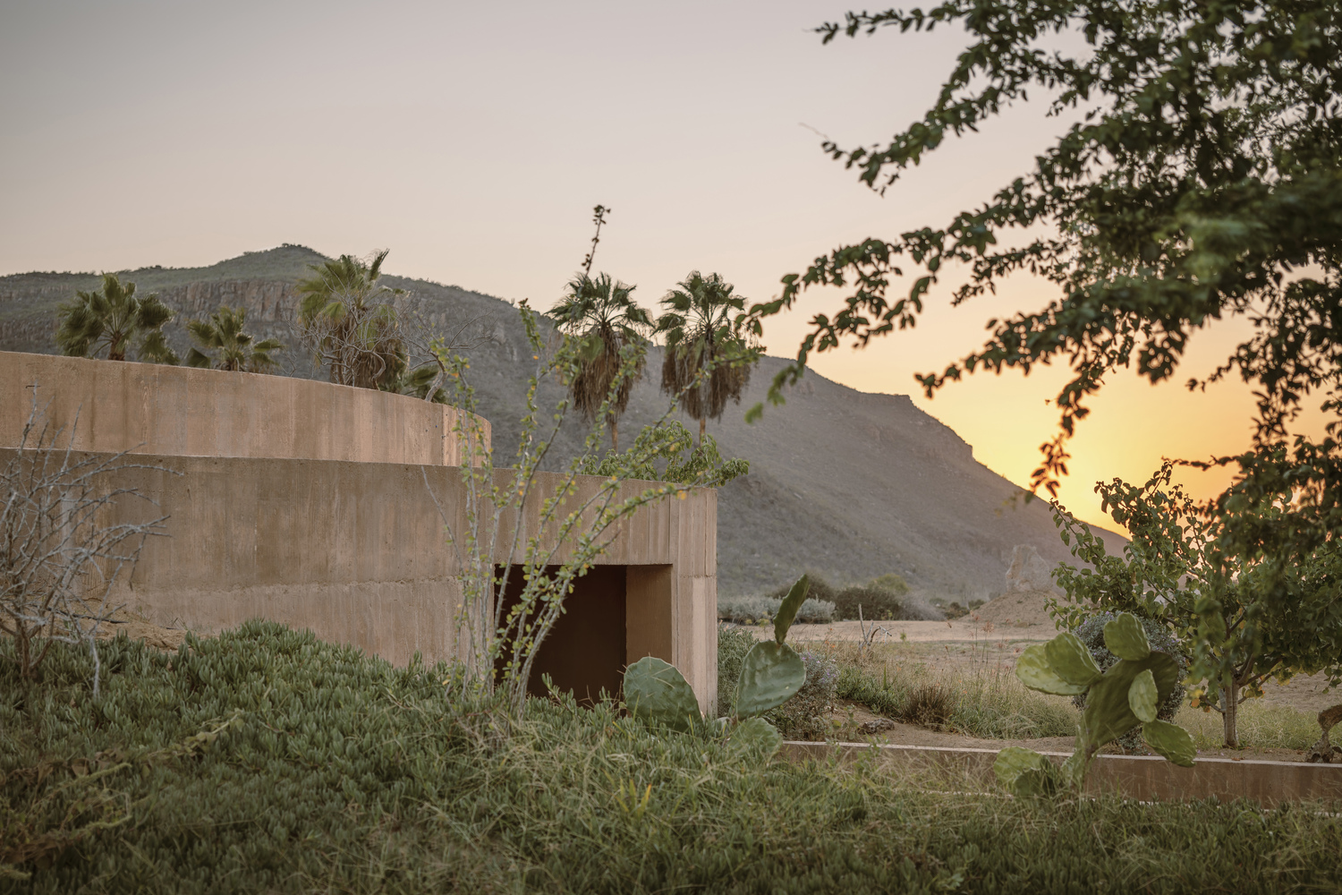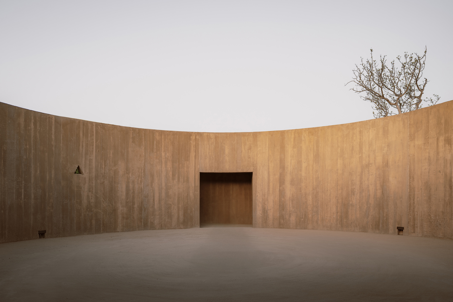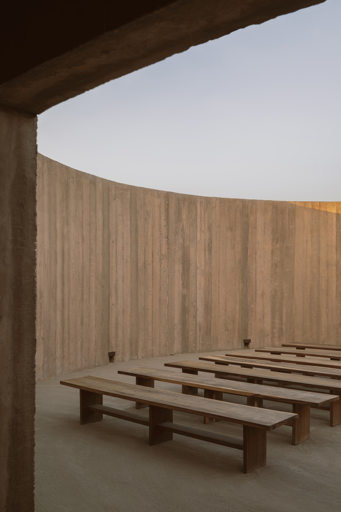 结构的形态精心框选了周边景观:半圆形开口可远眺山脉,而圆形墙体则勾勒出天空的轮廓。建筑沿东西轴线布局,使太阳的移动不仅成为时间流逝的隐喻,也映射着沙漠中光线的瞬息万变。
