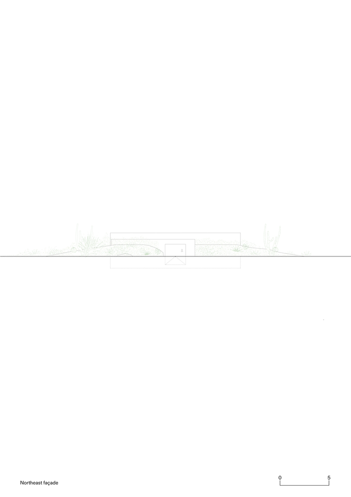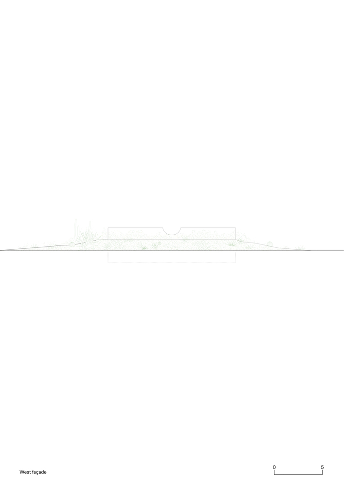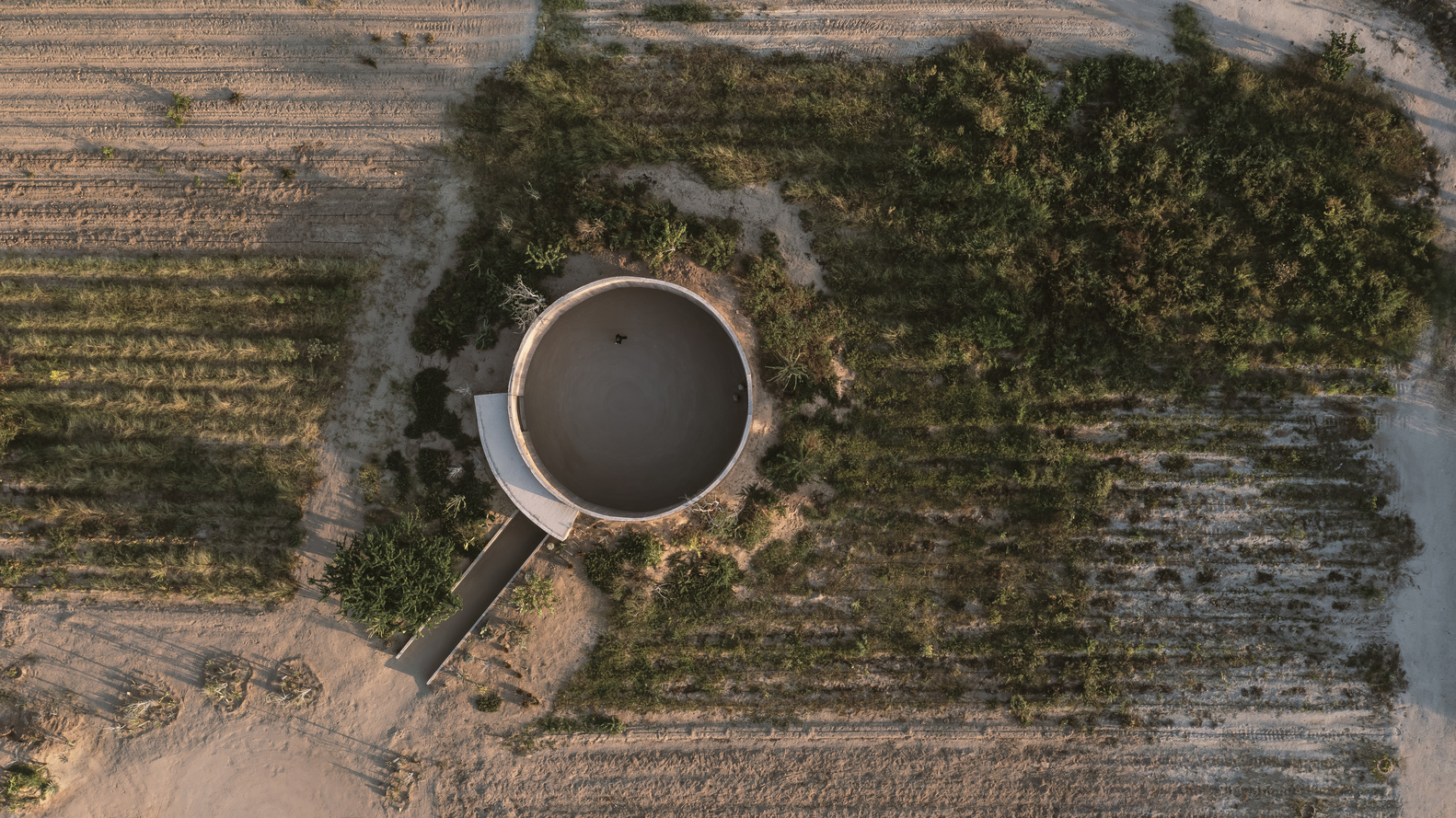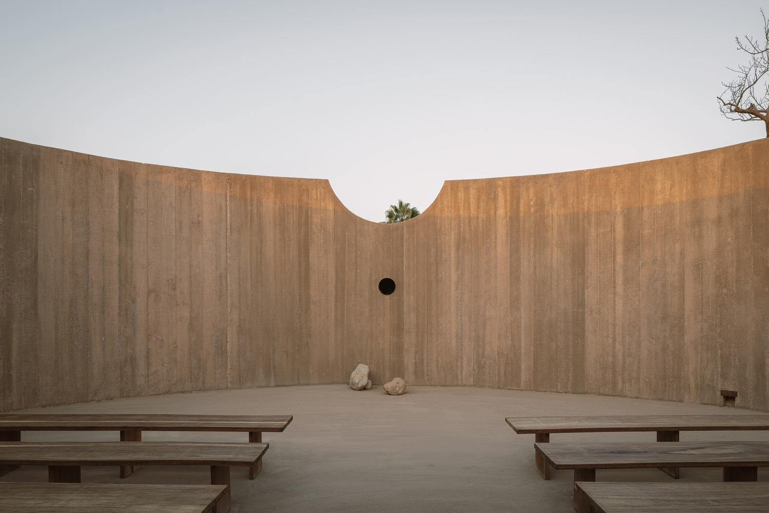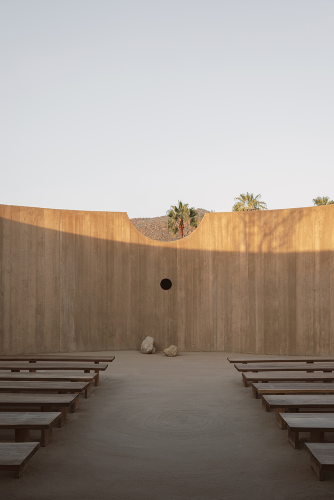 这是一处与南下加利福尼亚沙漠的景观和天空保持紧密对话的世俗仪式空间。圆形围合结构半埋于地下,既象征着与周围景观的融合,同时也以一种低调的姿态介入沙漠环境。