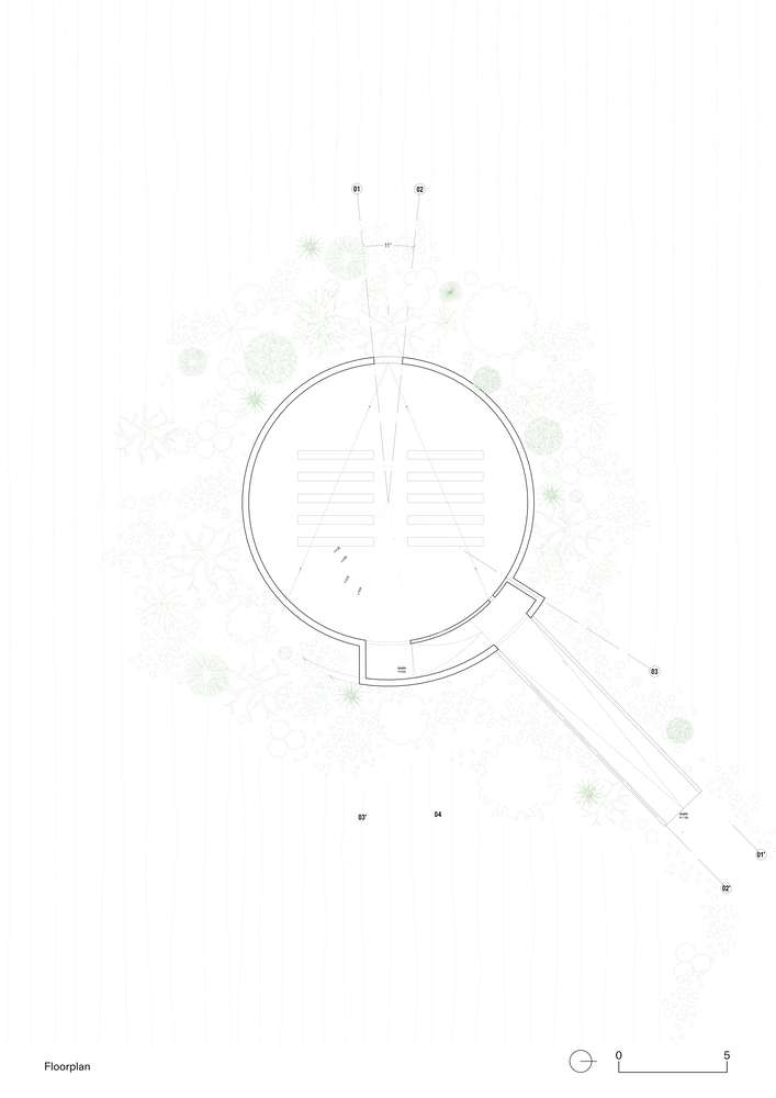 空间主要由混凝土圆环构成,地面裸露天然土壤,顶部以天空为幕,借此强化与大地和宇宙的超验联结。