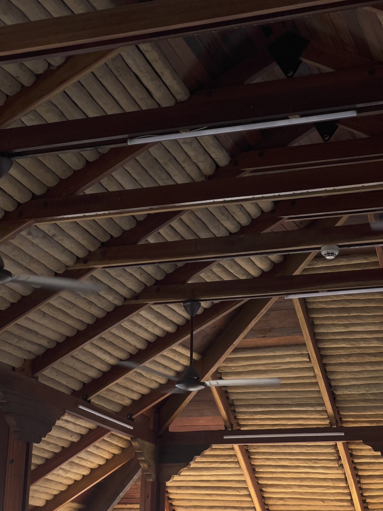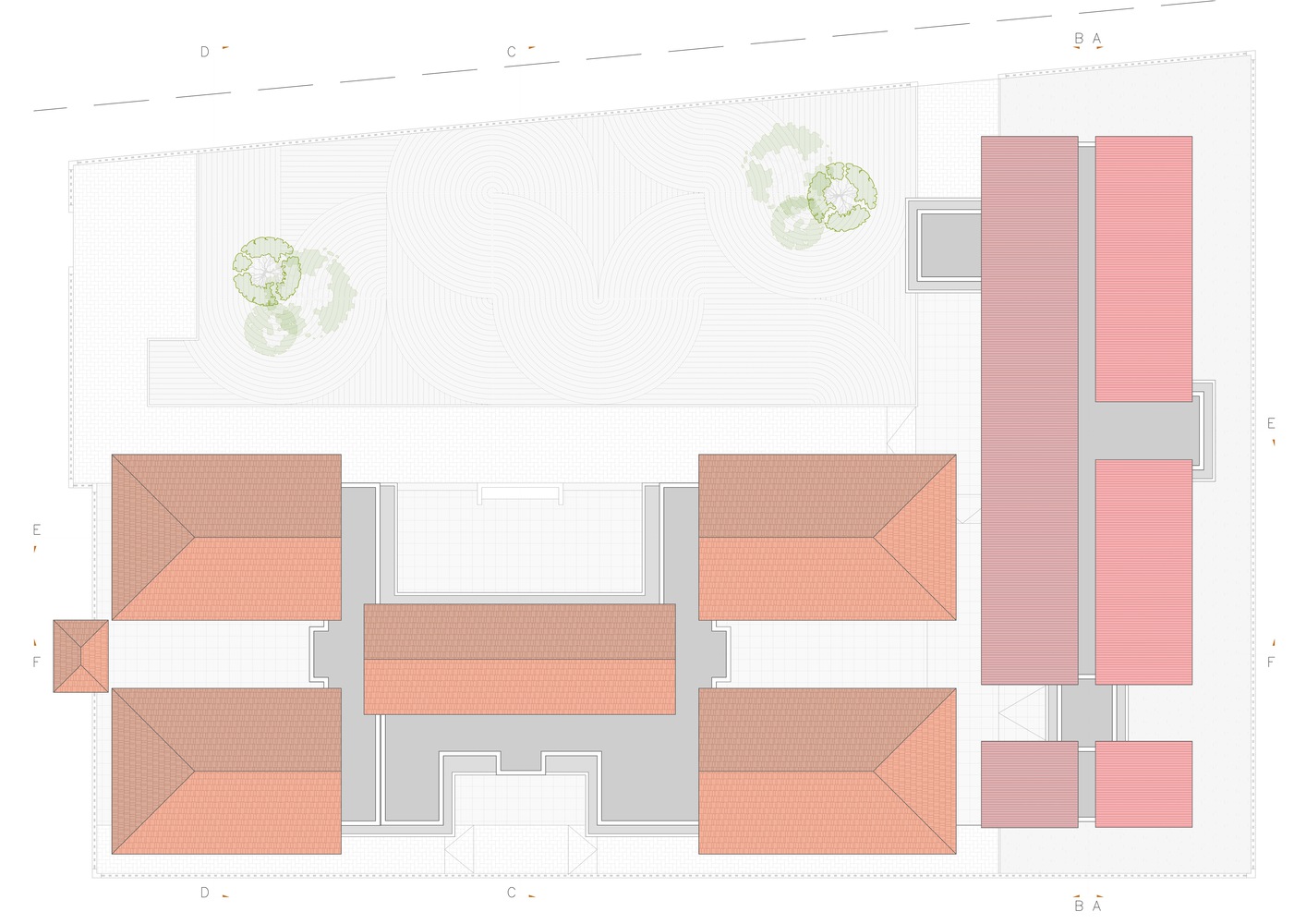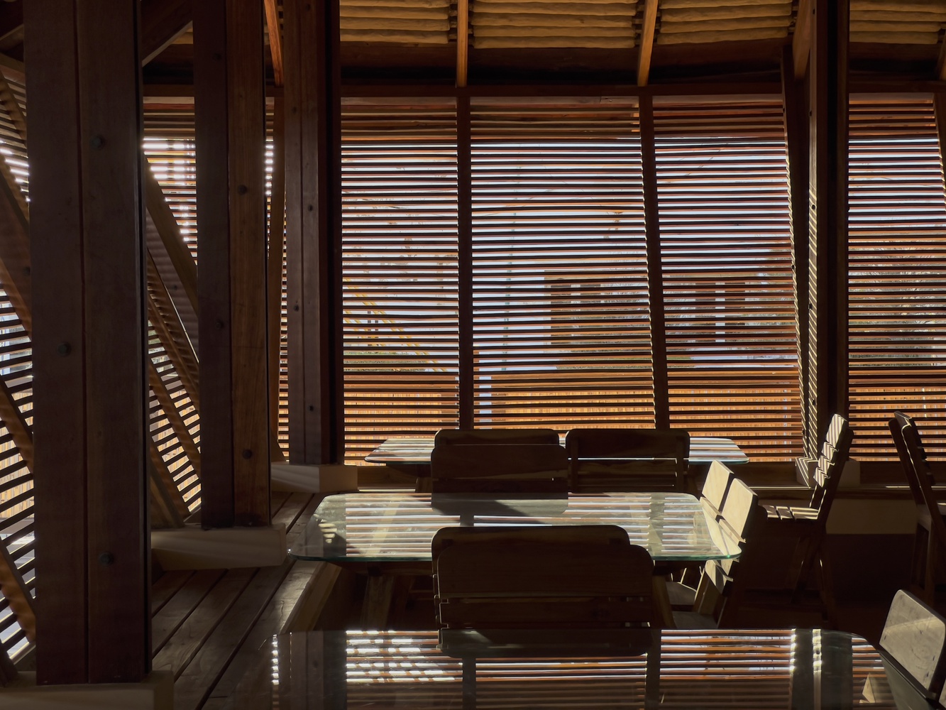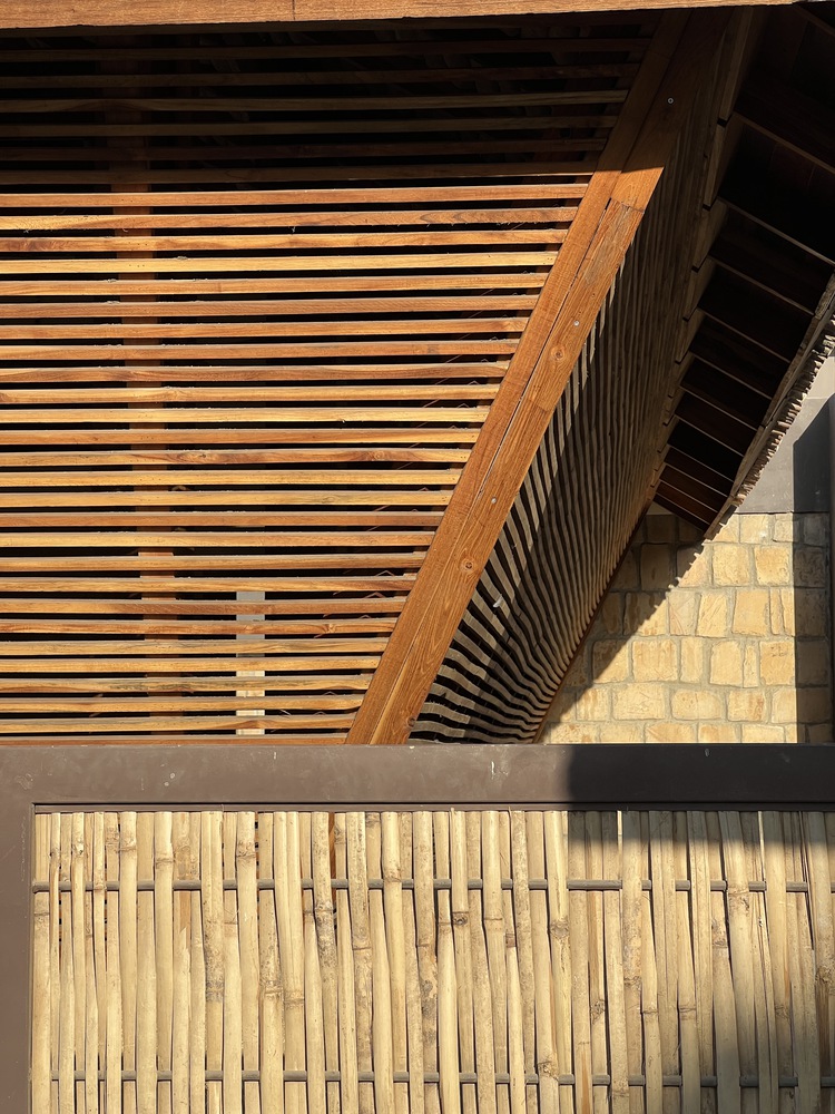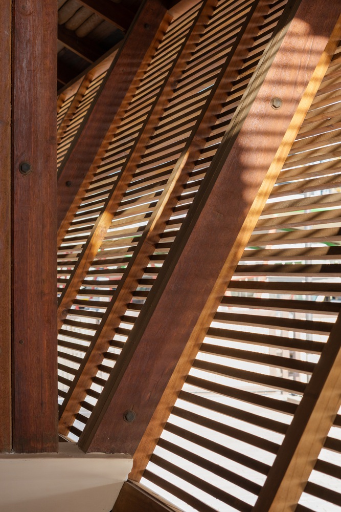 水平木质格栅由当地锯木厂的边角料制成,覆盖在就餐区的外部。这些可渗透的格栅为室内遮挡阳光,促进自然通风,营造出凉爽舒适的环境。