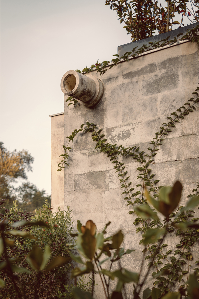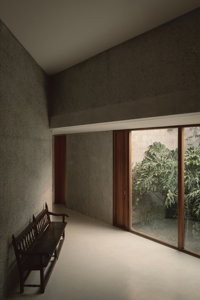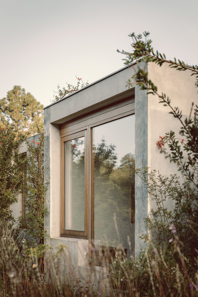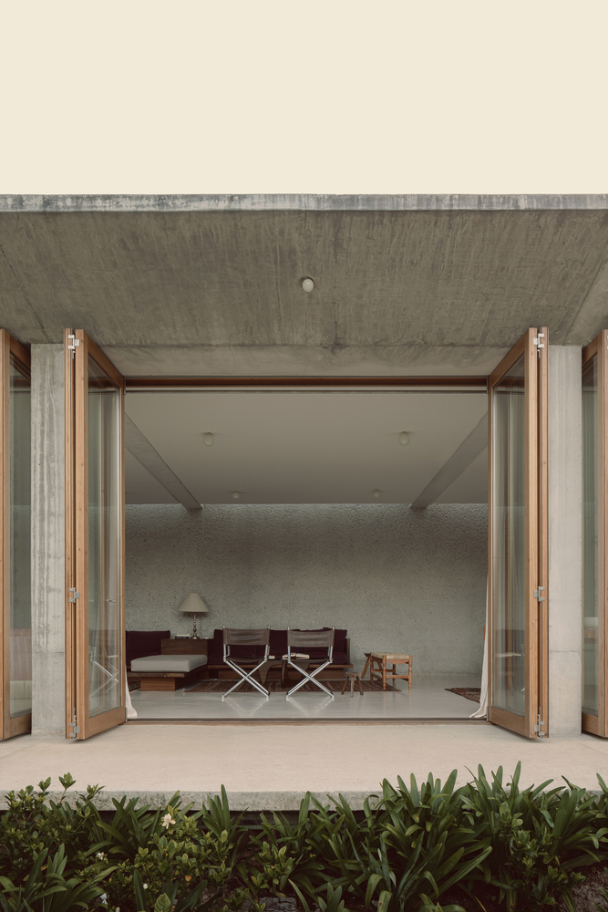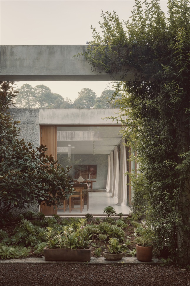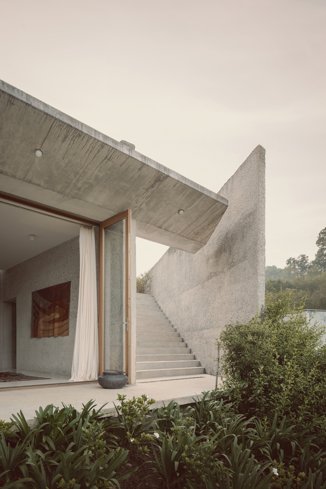 该混凝土别墅设计从高处抵达,沿着两条河流之间的山脊而下。山脊被三道墙体切割,一道迎接着你,另外两道隐藏了建筑的功能:一道后方是起居空间、厨房、闲聊区和休憩的日常;另一道更下方的区域则是卧室与小庭院,窗外树木隐约可见。楼梯叠着楼梯,扭曲的立柱,湿润的混凝土,还有一座花园。