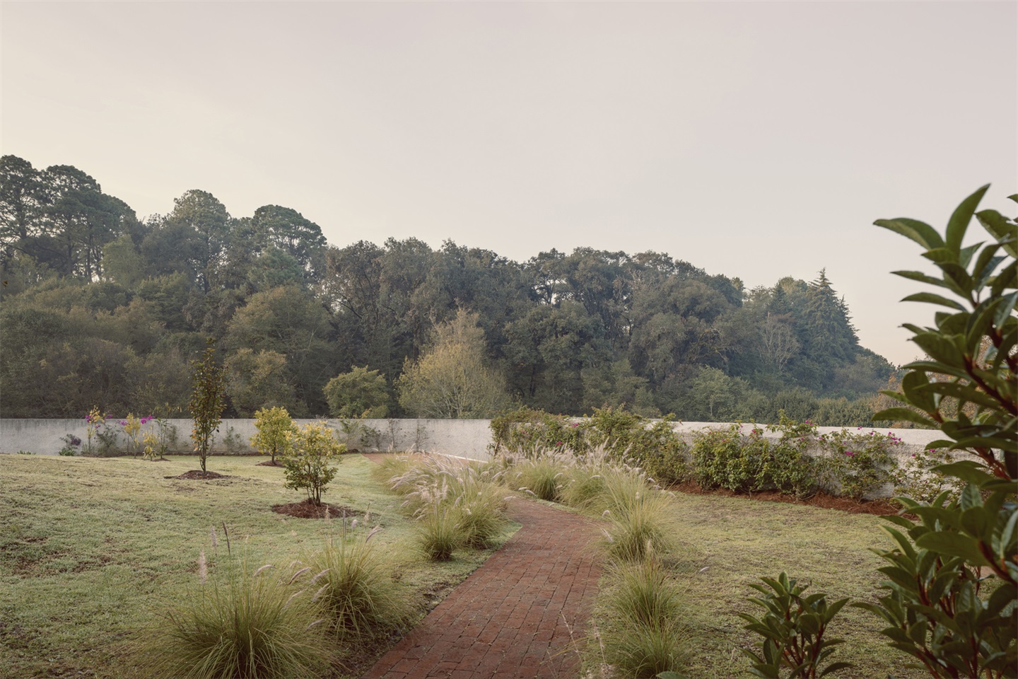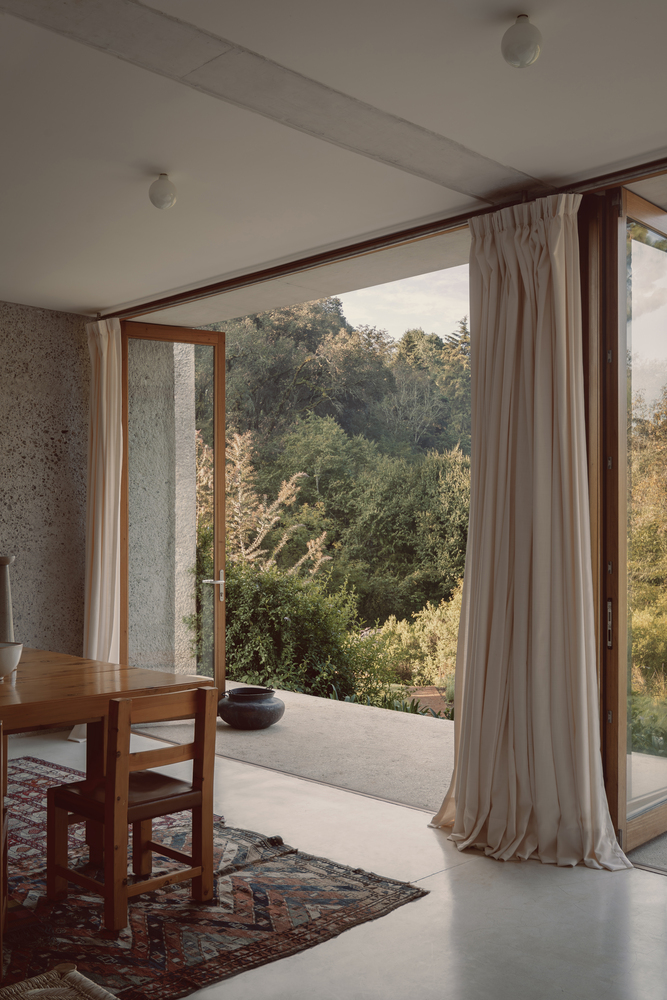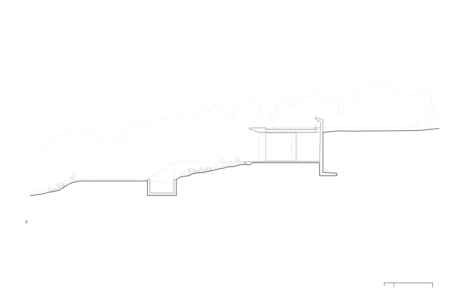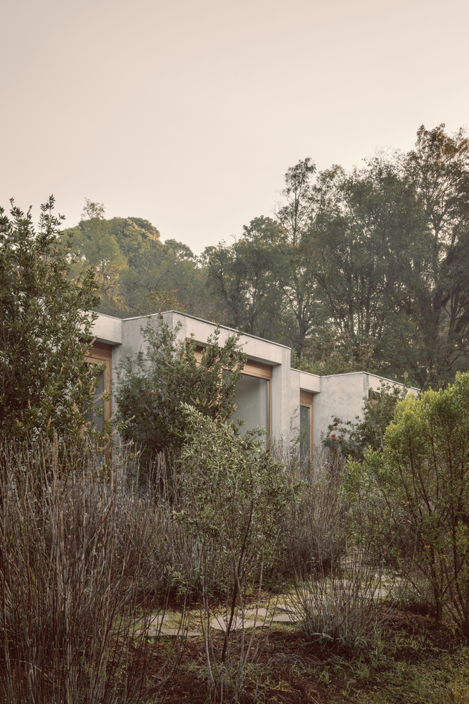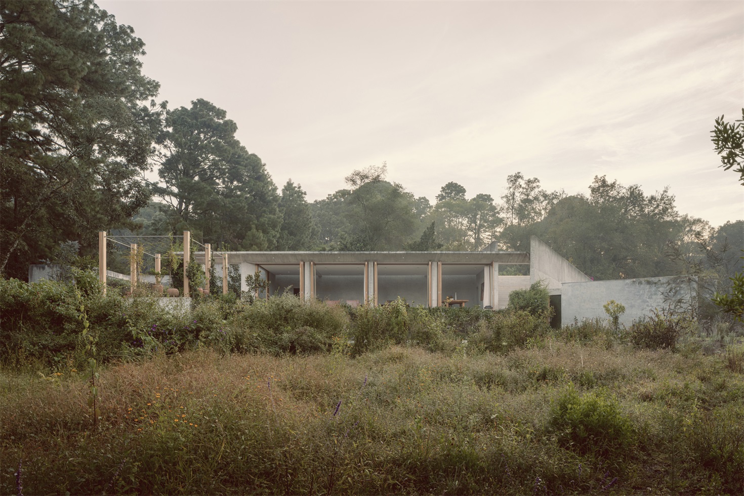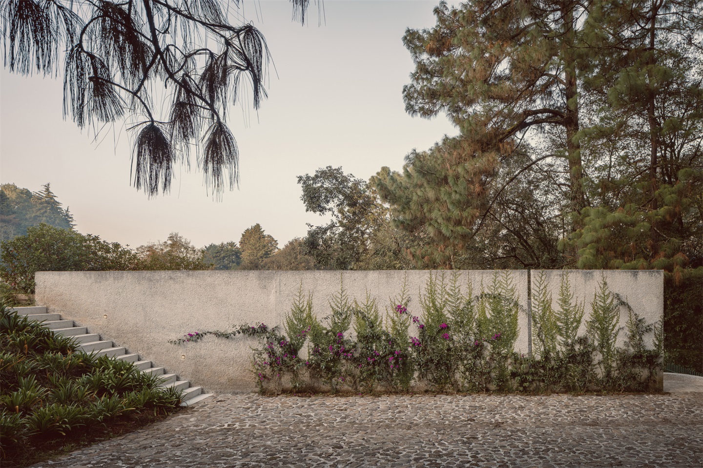 这座住宅位于墨西哥巴耶德布拉沃(Valle de Bravo),坐落在森林中山脊上一片现存的空地上。山脊向西延伸而下,南北两侧均有河流环绕。建筑嵌入斜坡之中,用锤击混凝土挡土墙支撑土地。主起居区呈条形,与山脊垂直,一道五米高的挡土墙切割地面,从上方仅能看到齐腰高的墙体暗示其存在。起居空间向西敞开,西班牙雪松材质的折叠门终日敞开,简约的窗帘随风轻摆。泳池位于斜坡更下方,隐藏在灌木丛后。厨房则隐匿于地下。