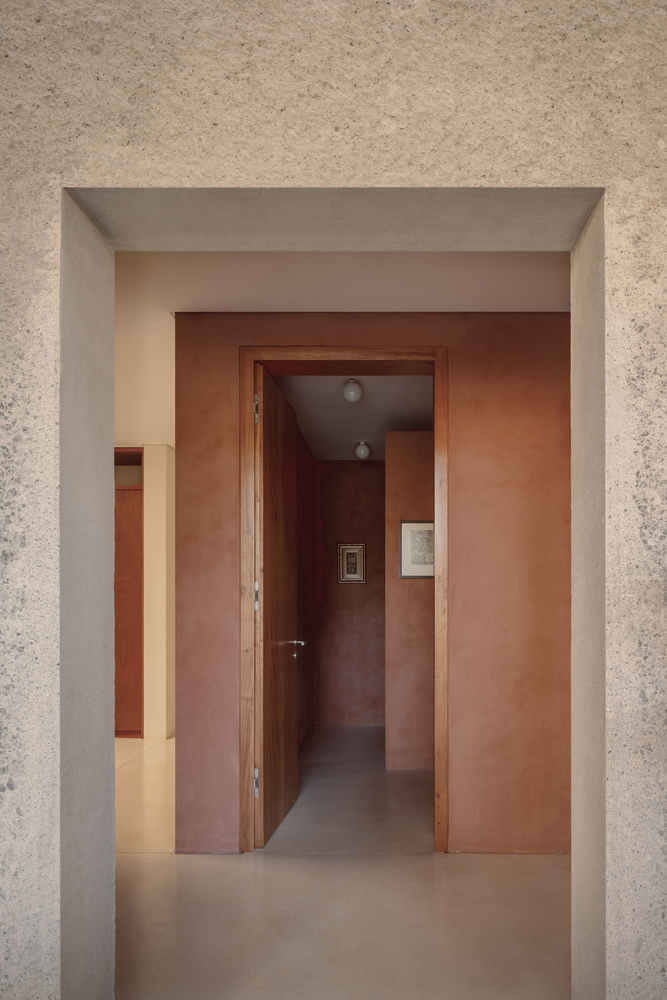 卧室区域沿南坡再向下延伸两米,其挡土墙更深。从上方看,齐腰高度的墙体保持一致。房间朝南布置,与斜坡之间由一条走廊分隔,走廊通过小型花园庭院 —— 露天玻璃温室 —— 引入光线。房间由煤渣砖砌成,表面覆有一层薄混凝土;空气潮湿时,砖缝清晰可见。