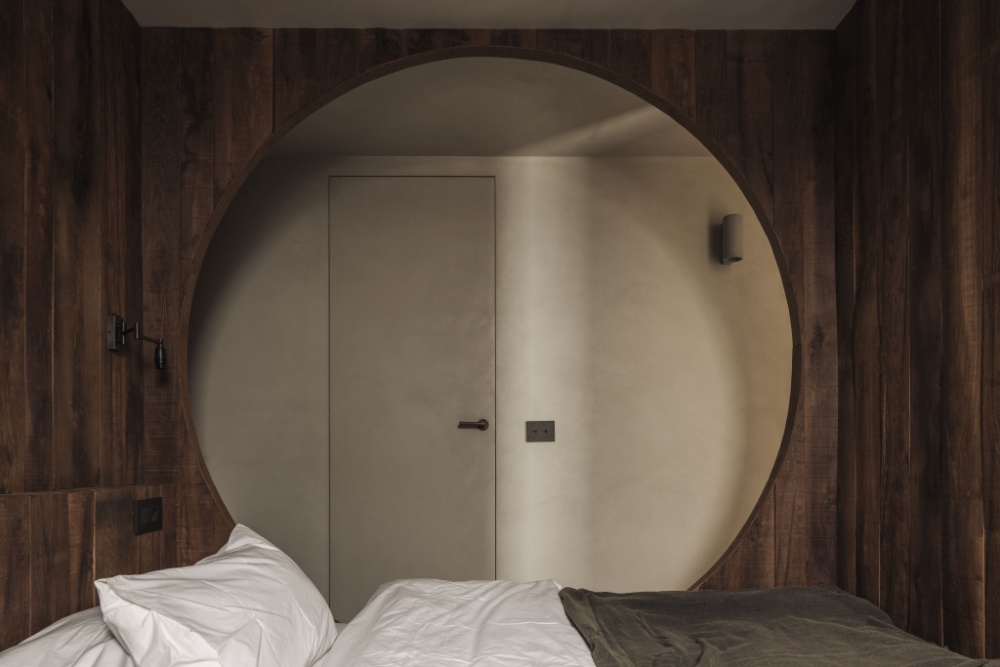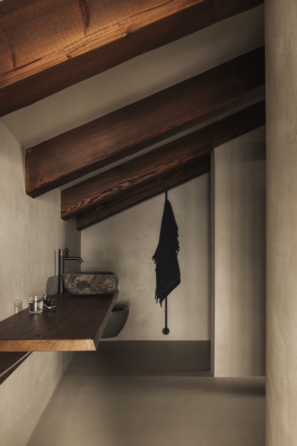 室内空间同样以天然材料为基底,裸露的木质梁柱、原木质感的地板与家具,搭配石材台面、亚麻织物等自然材质,构建出层次丰富的触觉体验。这些材料在岁月的打磨中会逐渐呈现出更温润的质感,让空间始终保持与自然的 “呼吸感”,仿佛居住者与山野之间没有物理的隔阂,只有沉浸式的自然拥抱。Maison Osaïn 在设计中巧妙平衡了 “精致感” 与 “私密性”,让蒙塔尼亚之家既经得起细节品味,又能成为居住者逃离喧嚣的专属港湾。建筑的细节处理尽显匠心:窗框的线条打磨得细腻流畅,与木材的粗犷纹理形成对比;墙面的肌理保留了手工质感,每一道痕迹都承载着历史的记忆,却又通过现代工艺的优化,避免了老旧建筑的粗糙感,尽显精致的建筑美学。