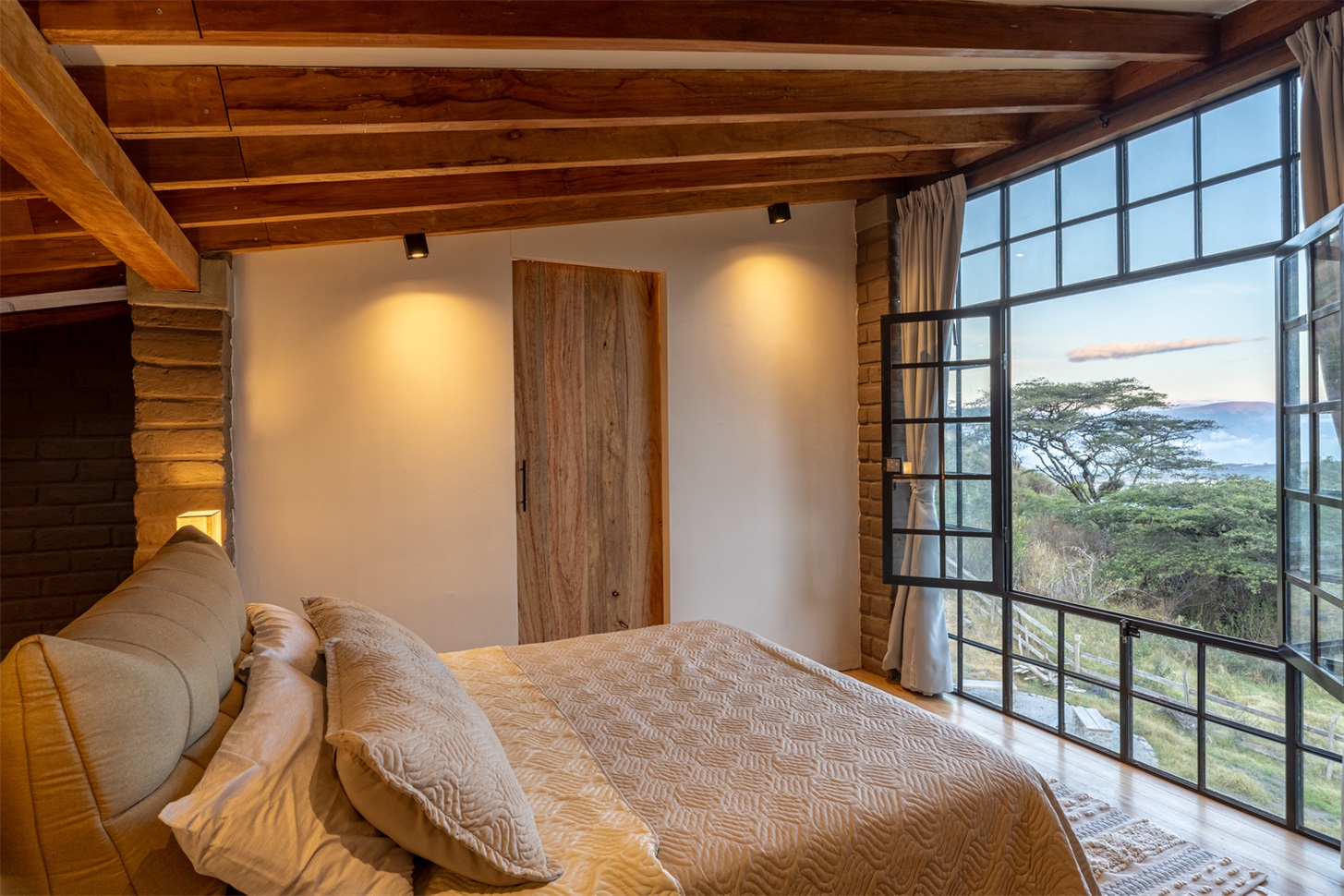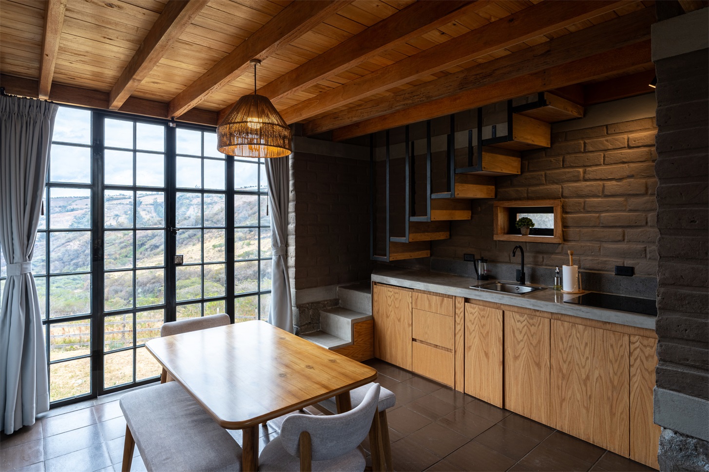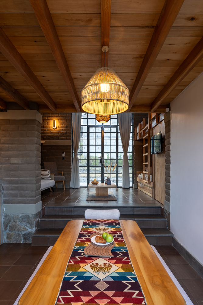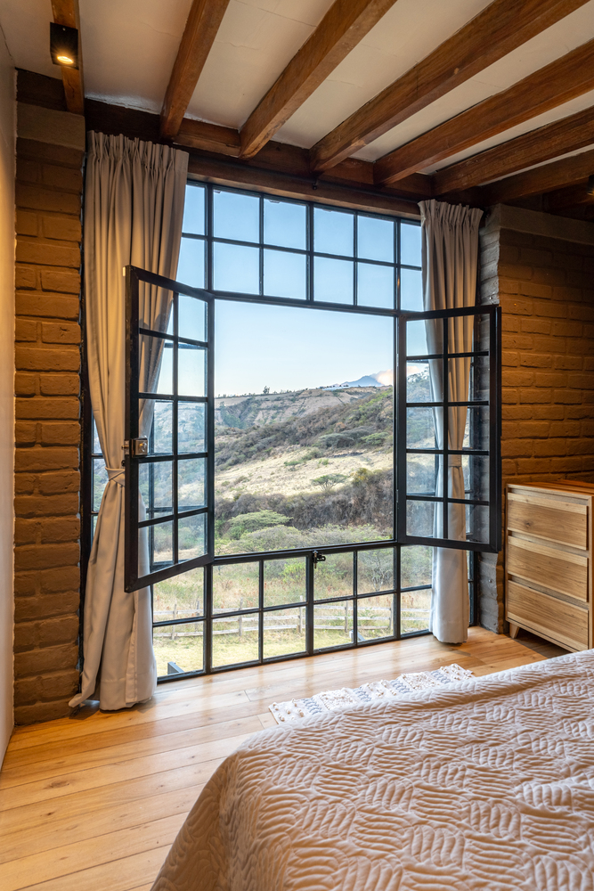 土坯的使用并非对传统的简单模仿,而是以当代语言重新诠释,更新其表现形式。结构简洁干净的线条与大面积窗户结合,使小屋在视觉上向外界开放,将景观融入空间体验的核心。这种视觉连接通过房屋的朝向得到增强,使用者既能欣赏周边的优越景致,自然光也能涌入室内空间,营造明亮宁静的氛围。