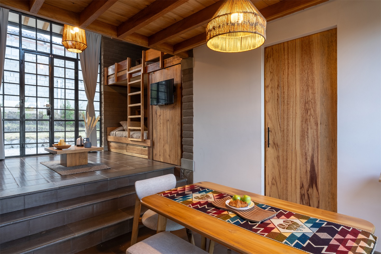 空间概念以功能性方式组织,各区域自然流通衔接。厨房与用餐区整合在同一开放空间内,通过朝向周边地形的大开口促进社交互动,并与户外相连。房间作为温馨的休憩之所,成为人们在温泉度过一天后放松的聚会空间。