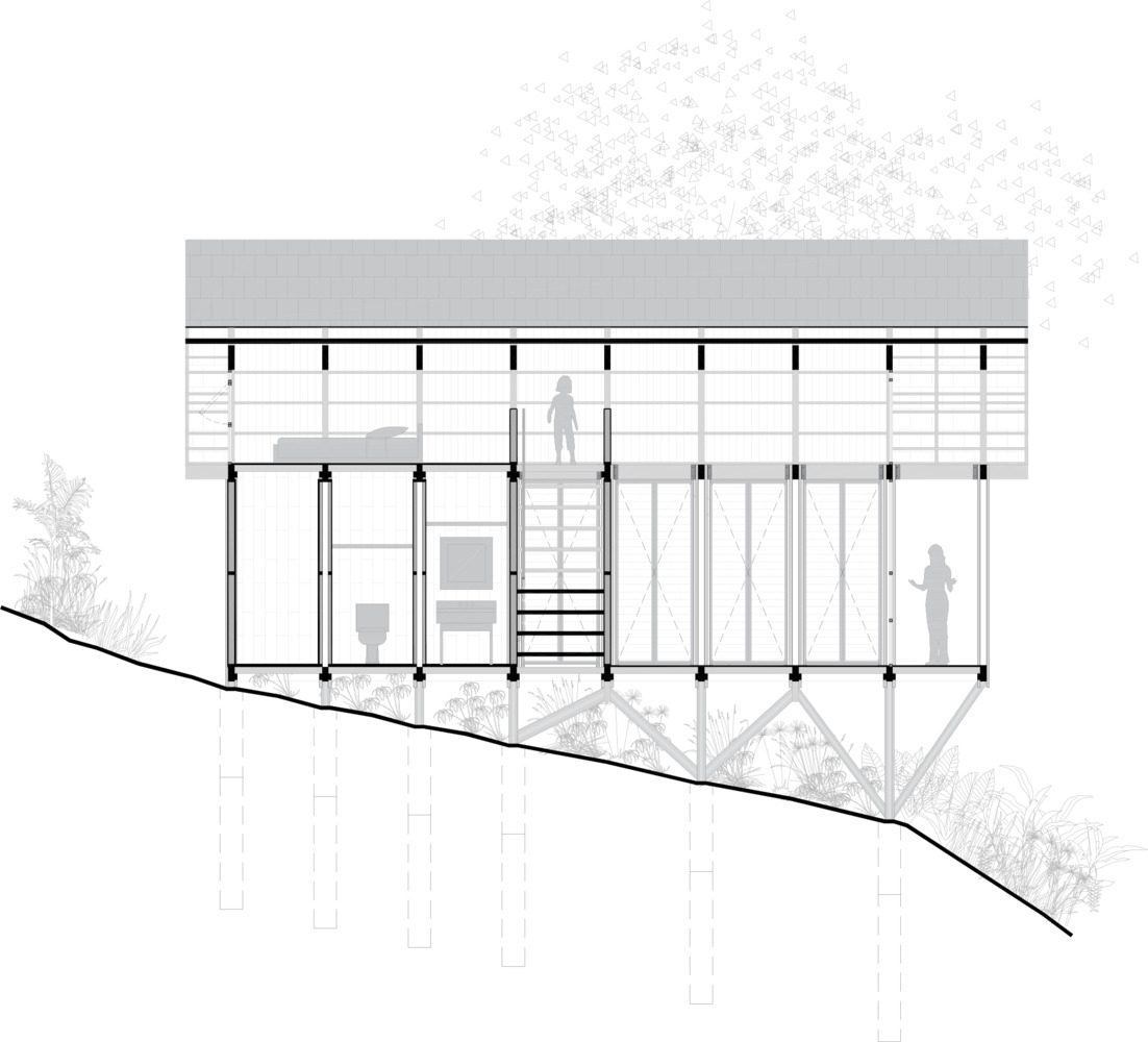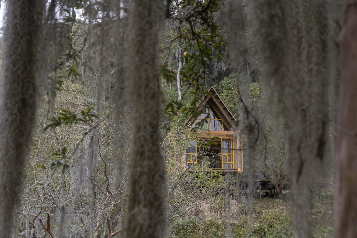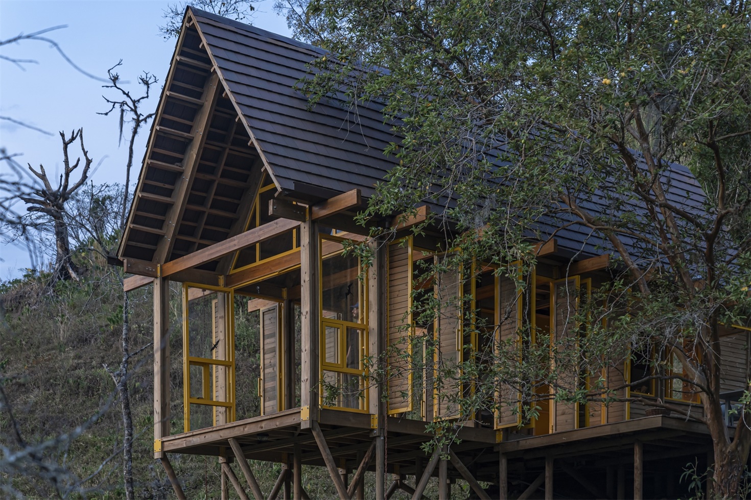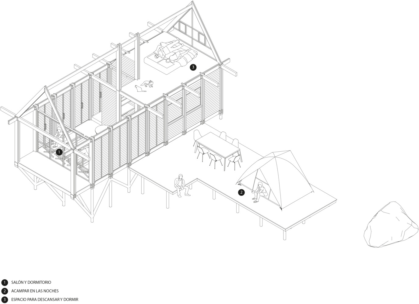 该木屋设计位于数百万年前,一块石头从地心坠落,凭借生命的力量穿过了的布拉沃山。许多年前,殖民时代来临,森林被砍伐,人们为自己勾勒出一片多产的 landscape。咖啡种植和采矿活动开始占据这片土地,生态系统逐渐枯竭。
