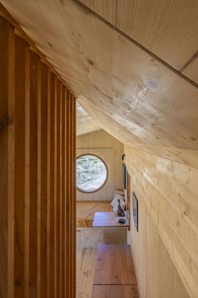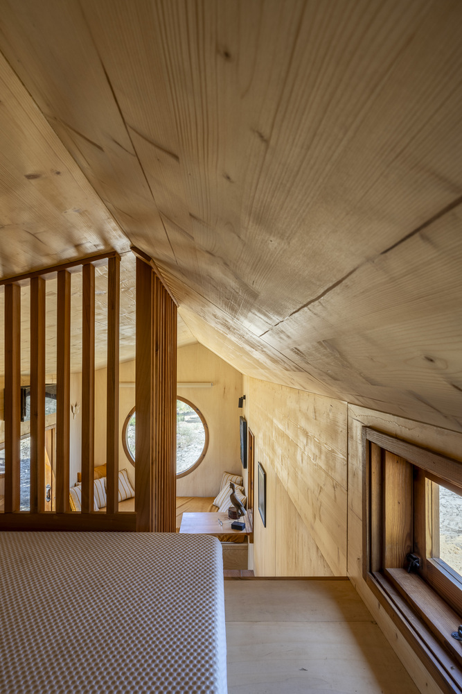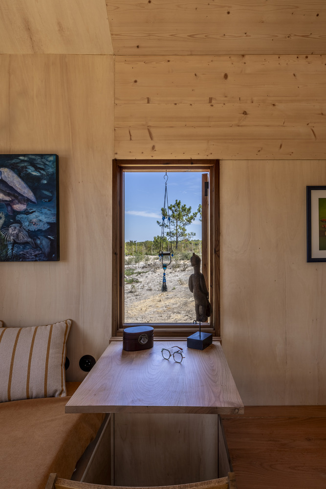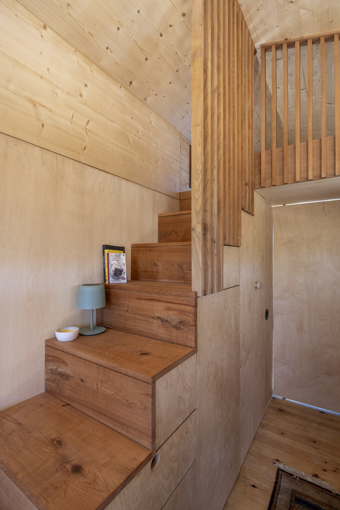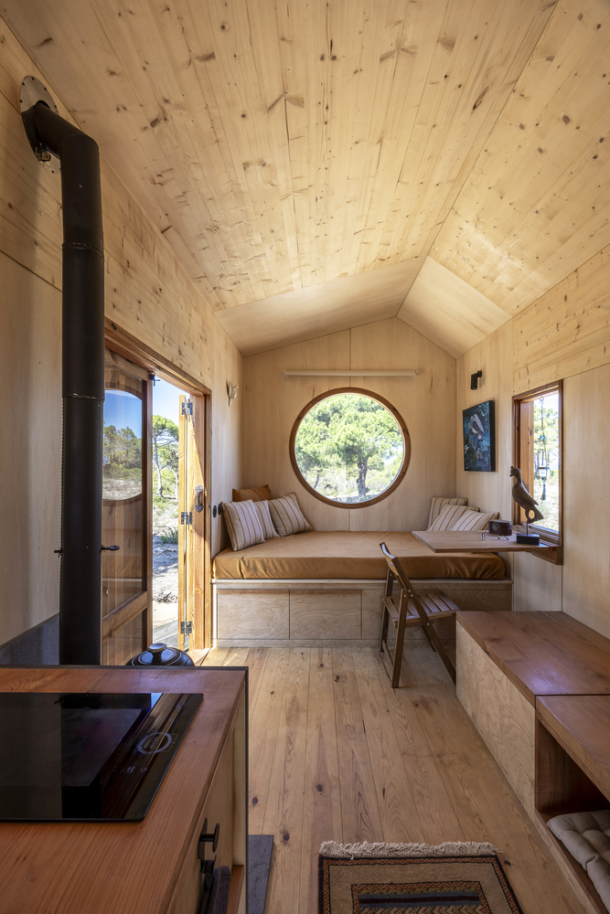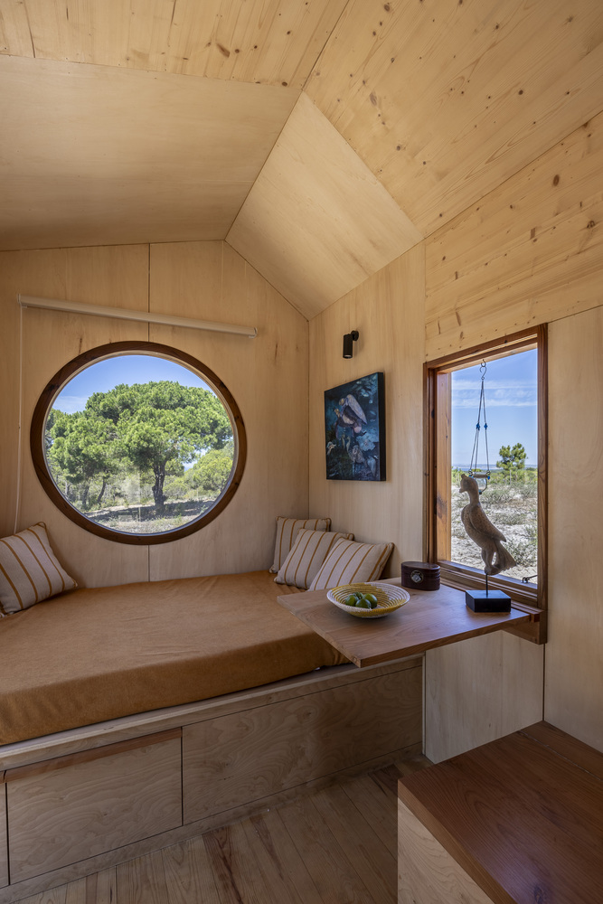其设计旨在营造一个温馨、实用且富有魅力的环境。社交区域分为三个不同的空间:一个带有折叠桌的起居区,非常适合用餐或阅读,正对着一个壁炉。第二个休息区位于一扇宽敞的圆形窗户下方,可欣赏到葡萄牙壮丽的海岸景色,并沐浴在自然光中,在通往楼上卧室的楼梯下方有充足的储物空间。