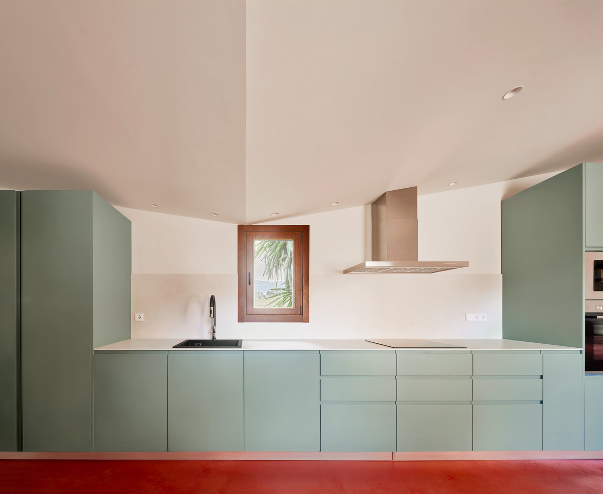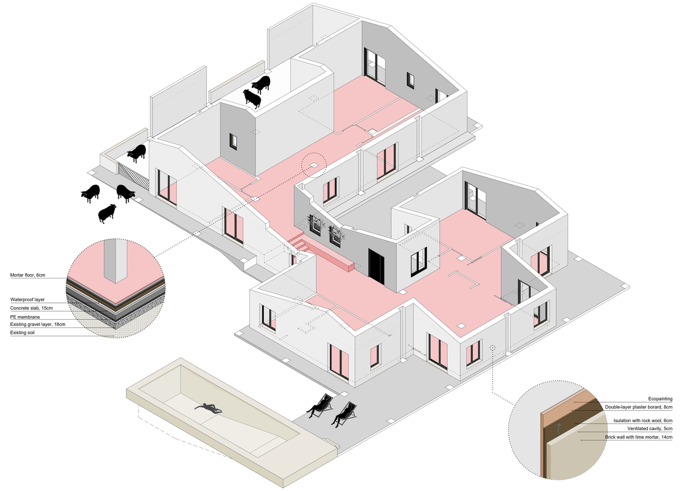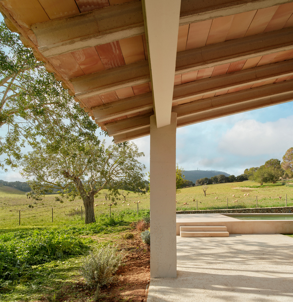 这座住宅如柔软的生命体,占据棚屋屋顶下的空间,在笛卡尔式的混凝土柱海中流动。它将柱子集中于中心并沿周边排布,生成屋檐、露台和门廊;强化其构造美感的同时,通过新的通风砂岩表皮保持隔热的连续性。这种与羊群共处的生活方式,一切皆为 “马略卡岛制造”。