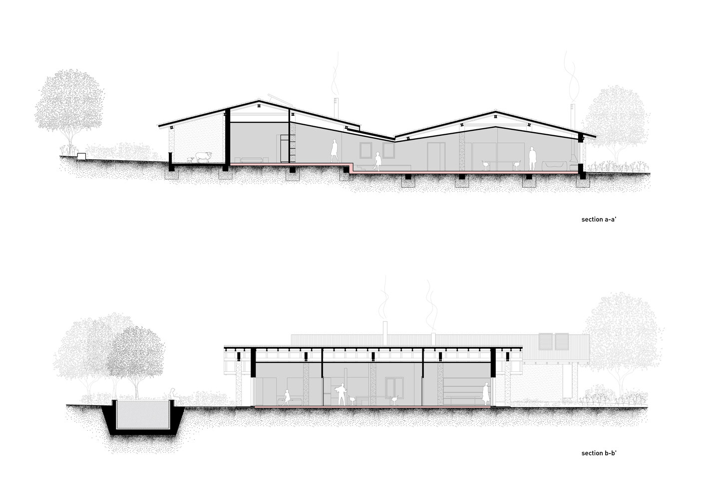 两座棚屋之间的桥梁形成回廊,即住宅的入口庭院。这个入口同时也是厨房;它是让生活成为习惯的 “机器”…… 每日三次…… 如同生命的音叉,聚集、连接、滋养,并偶尔实现更多可能。