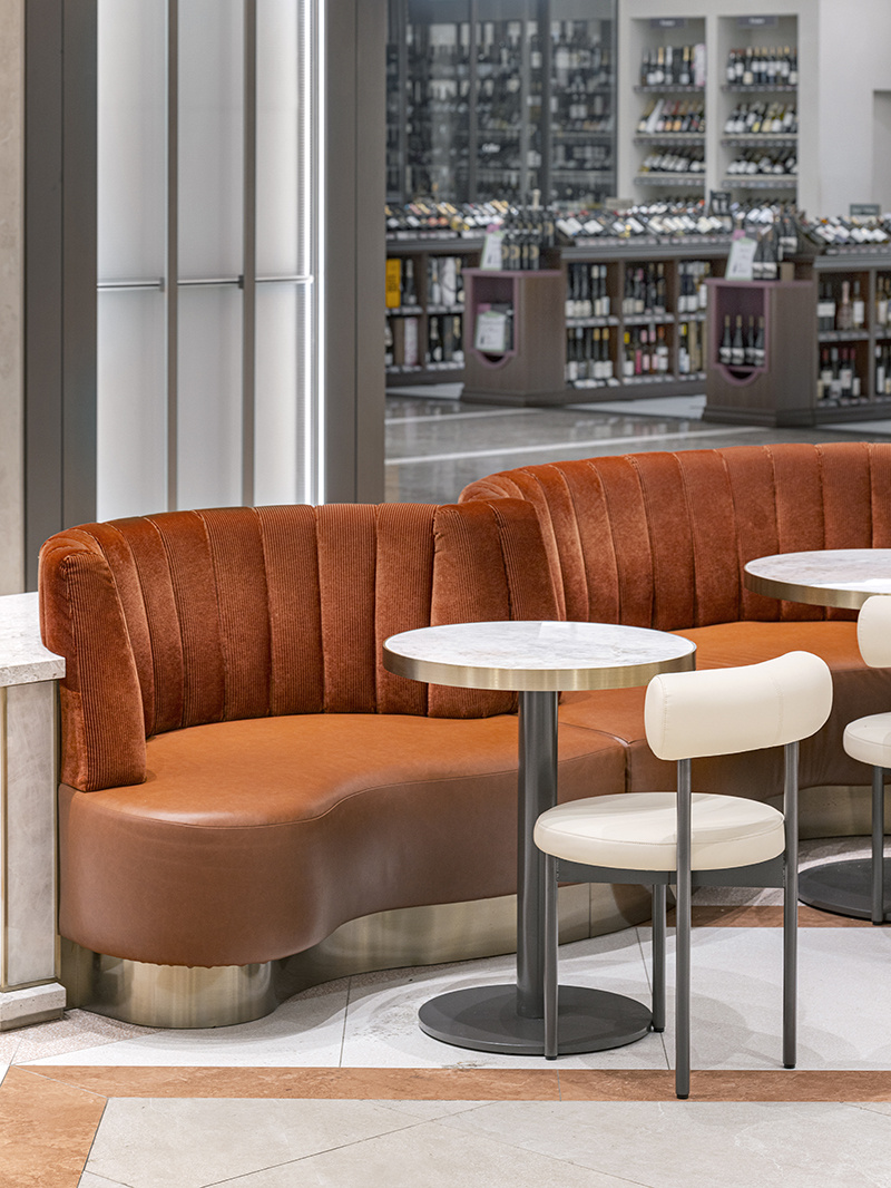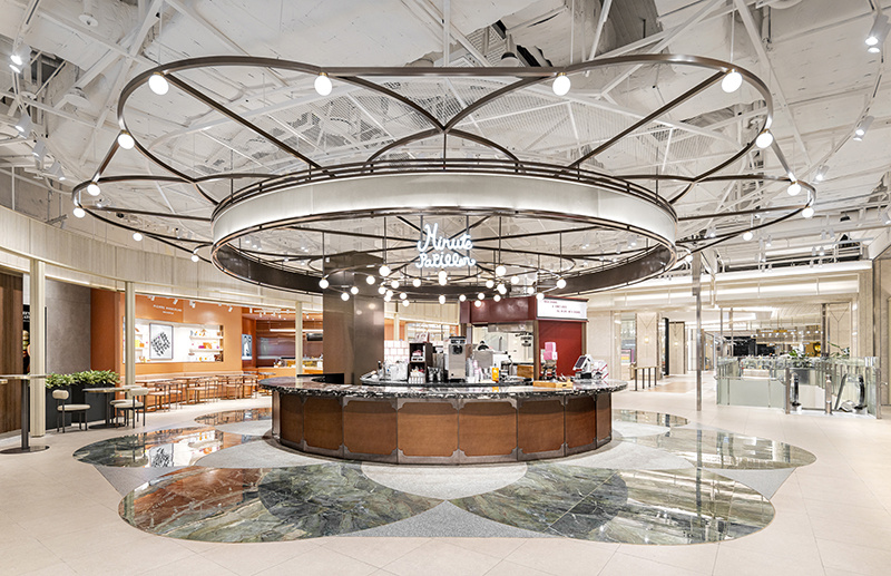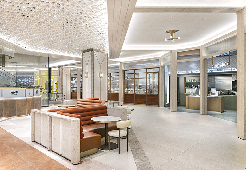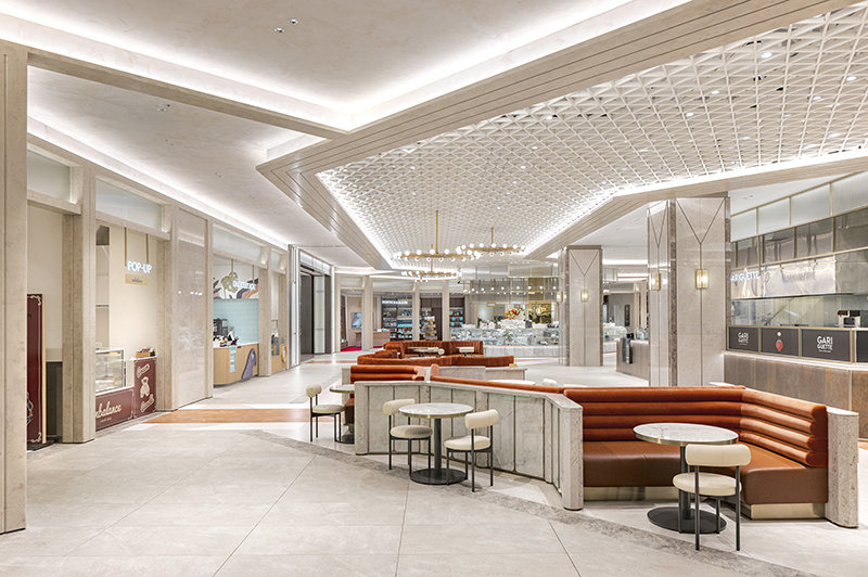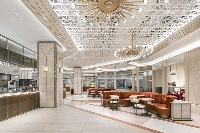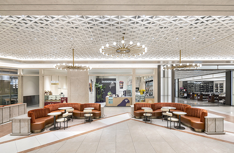 美食区的设计尤为用心,大理石材质的展柜精致高级,仿佛把甜品、美食都变成了 “可品尝的艺术品”;休息区的棕红色沙发,质感细腻,搭配简约的小圆桌,像咖啡馆里的优雅角落,在这里享用美食,不再是匆忙的 “填饱肚子”,而是 “享受美学与味觉的双重愉悦”。