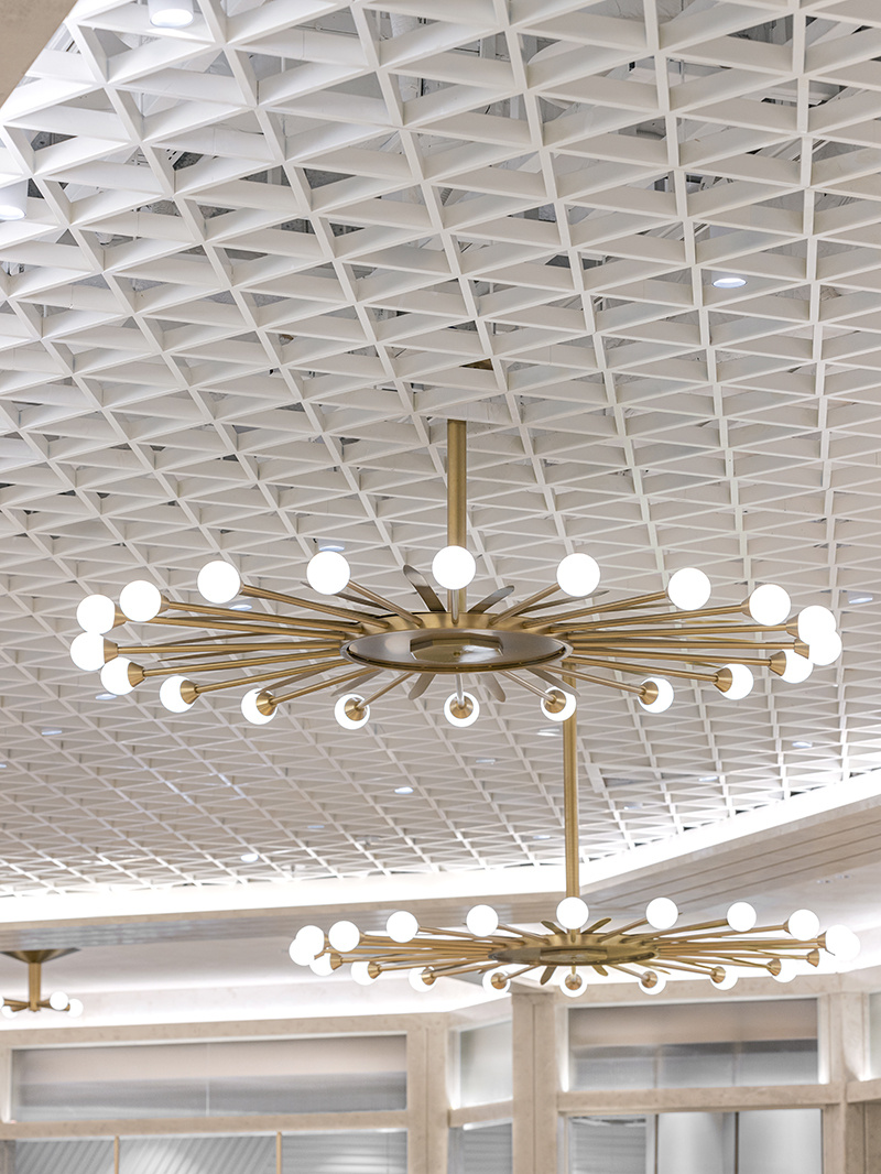 走进超市,最先抓住眼球的就是天花板。几何镂空的设计,像一张精致的 “艺术织网”,光线透过镂空处洒下,在地面投下灵动的光影,随时间流转,光影也悄然变化,仿佛 “流动的艺术装置”。造型独特的吊灯更是点睛之笔,金色的金属支架如绽放的花束,白色灯球似花蕊,悬挂在几何天花板下,既像艺术展厅里的雕塑,又为空间增添了奢华感,让 “抬头看” 成了逛街时的一大乐趣,仿佛每一次抬头,都能邂逅一件 “空中艺术品”。