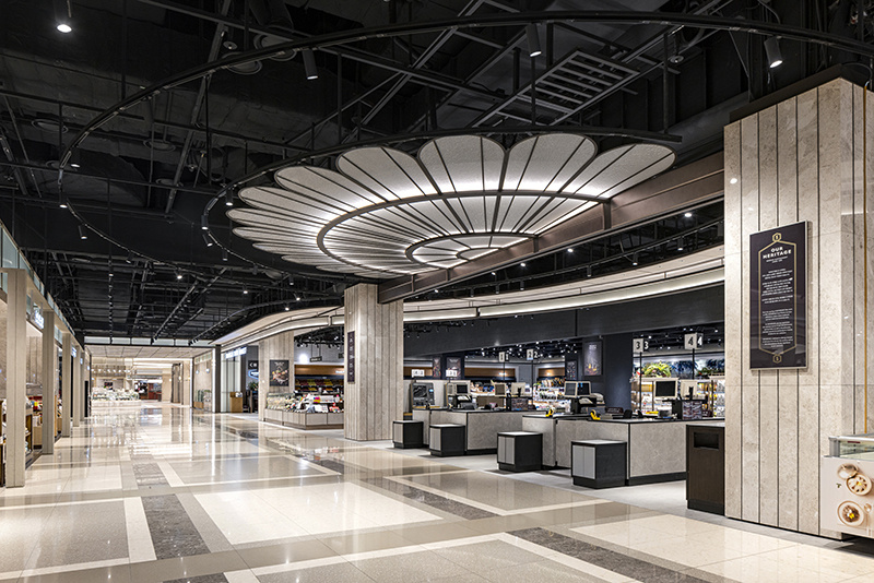 购物区域,深色系的天花板与金属质感的装饰,营造出低调奢华的氛围。独特的花形灯光装置,像一朵巨型艺术之花盛开在空间中,为购物区增添了艺术感,让人们在挑选商品时,也能被艺术氛围包裹,仿佛 “在艺术展厅里挑选生活好物”。
