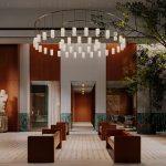 位于空间中央的岛式吧台将整个空间划分为两个色彩区域:沙发、桌椅和瓷砖采用鲜艳的红色,而墙壁和对面的座位区则涂成深沉的黑色。猩红色的金属管照明和精致吊灯上的黑红色圆锥形灯具为室内增添了一丝野蛮和前卫的气息。