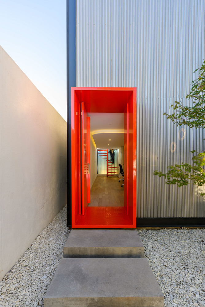 主立面与街道形成可控的对话关系。穿孔金属板如同面纱,调节着室内外的联系,在确保隐私的同时不牺牲自然光。这种穿孔表面不仅提供保护,更成为定义建筑身份的建筑语言。