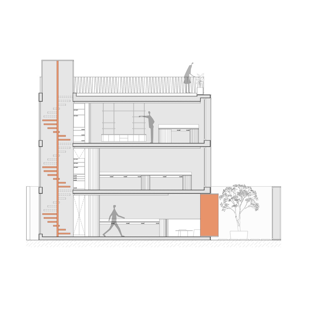 该建筑设计公司办公室设计涉及位于科尔多瓦市塞罗德拉斯罗萨斯(Cerro de las Rosas)城区的一座建筑工作室设计,其距离 “城市女性”(Mujer Urbana)交通枢纽仅几个街区。该建筑体被构想为深窄用地上的雕塑性棱柱体块,以鲜明的特征屹立于场地之上,两侧仅从用地红线后退 50 厘米。