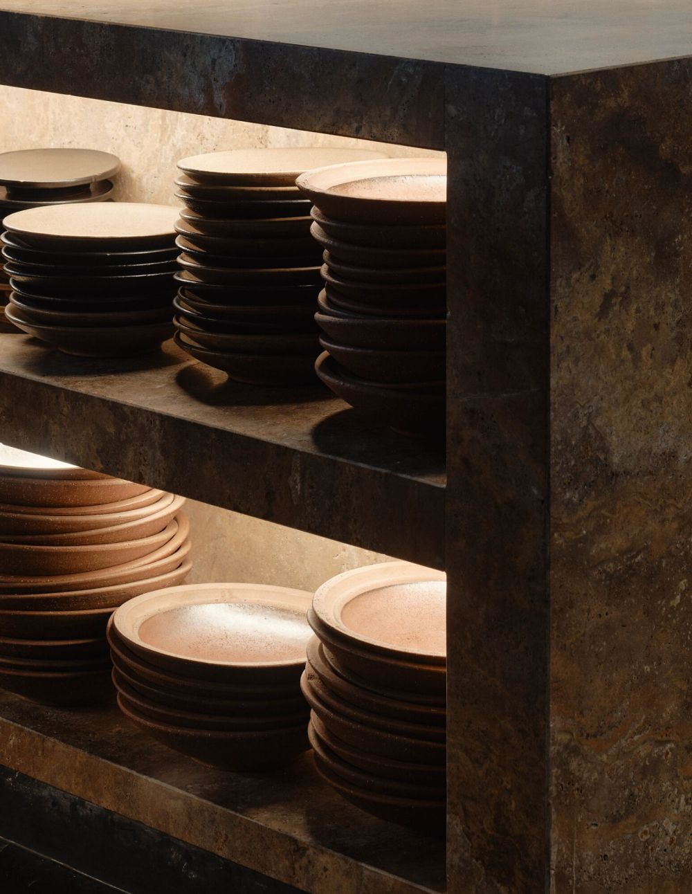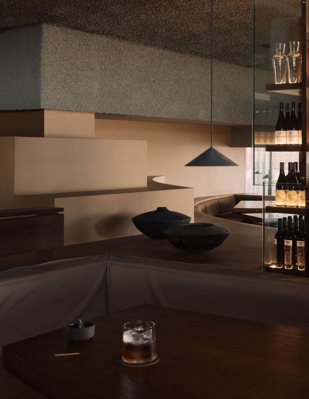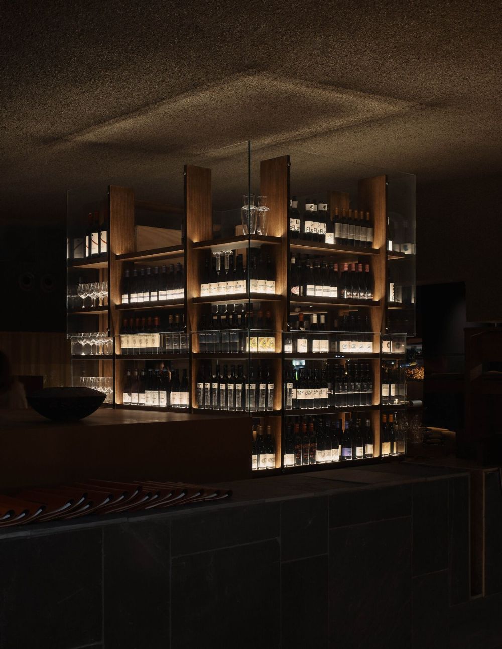 手工陶土与玻璃的温度对比:定制的手工陶土餐具堆叠在开放式展架中,陶土的暖棕色调与粗粝触感,与透明玻璃酒柜的冷冽形成视觉与触觉的双重对比。玻璃酒柜中,酒类与器皿的陈列如艺术装置,既满足功能,又成为空间的视觉焦点,让 “取酒” 的动作都充满仪式感。