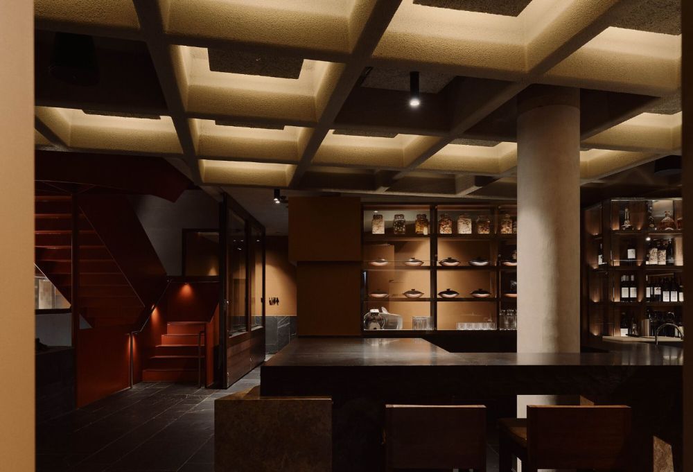格栅天花的光影矩阵:餐厅的天花板采用立体格栅设计,灯光从格栅间隙洒下,在墙面与地面切割出几何光斑。这种光影效果如巴拉甘的建筑立面,让静态的空间拥有了动态的时间感 —— 白日光斑移动,夜晚灯光变幻,空间氛围随时间流转,却始终保持着沉浸式的戏剧张力。局部照明的焦点营造:酒架、餐具展架、开放式厨房区域都设置了局部照明,让每一处 “风味载体”(酒、餐具、烹饪过程)都成为空间的视觉焦点。这种设计如南美料理的 “摆盘艺术”,让食客的注意力自然聚焦于 “食物与空间的对话”,而非窗外的海景。明暗分区的情绪引导:公共用餐区与私密卡座通过光影明暗自然分区。公共区的光线稍显明亮,适合社交互动;卡座区则以柔和的局部照明营造私密感,如南美家庭聚餐的温馨角落。这种分区无需实体隔断,完全通过光影的明暗层次实现,尽显设计的克制与精妙。