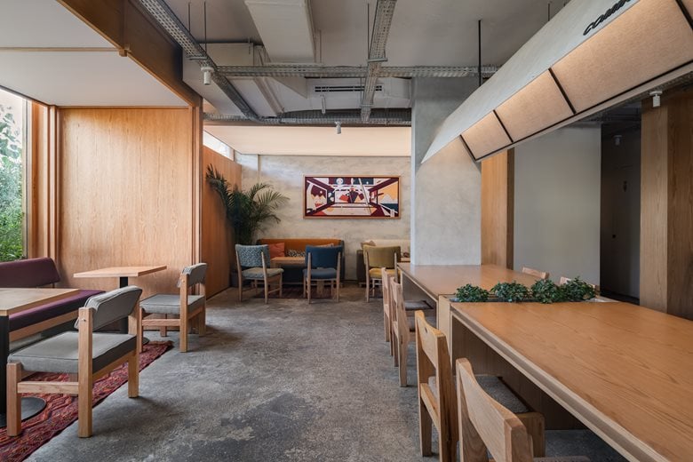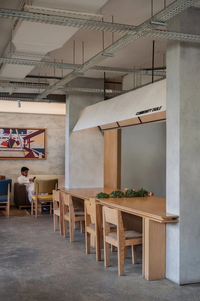 灵活就坐区:靠近建筑立面的全高窗旁,设计了长条坐凳,适合小团体聚会或单人办公;空间中央,一张贯穿式公共长桌与一株鲜活树木搭配,既自然地将就坐区划分为两个独立区域,又增添了空间的生机与互动感;
