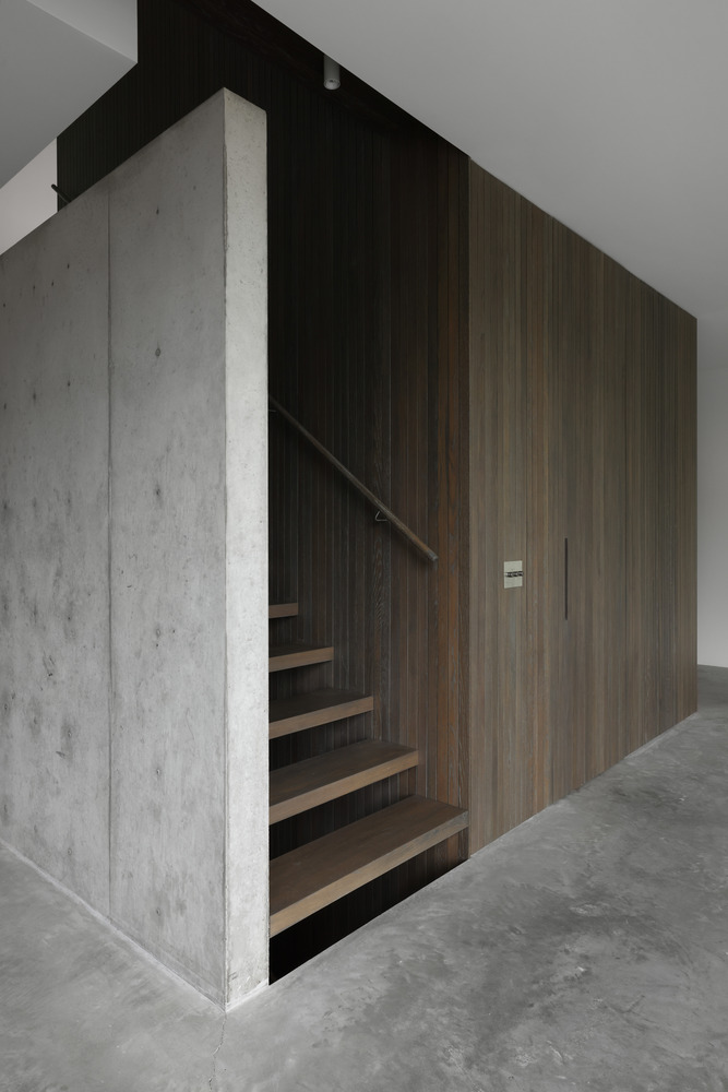 独特的杂色 “贴纸” 标记是工业加工的产物,作为木材乙酰化过程的视觉提醒,这使得它在浸水条件下耐用、稳定且持久。木材被保留自然风化至柔和的灰色调,让人联想到场地保留的铁杉树。房屋的最低层被建造为能够承受这些洪水事件。为防止水损坏,省略了干墙和棉絮绝缘等饰面,机械设备被安置在防水的地堡中。