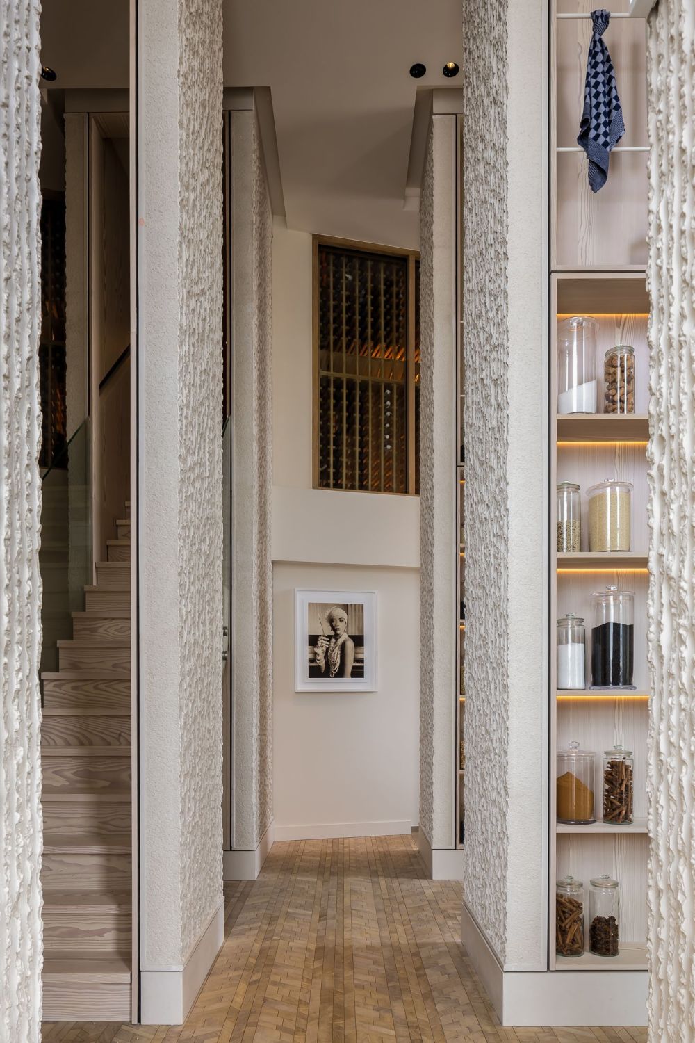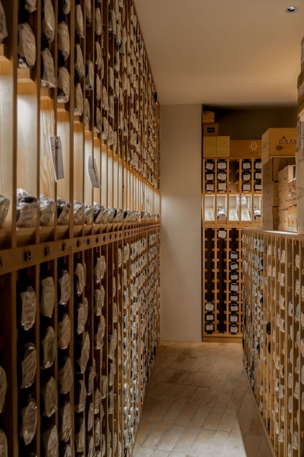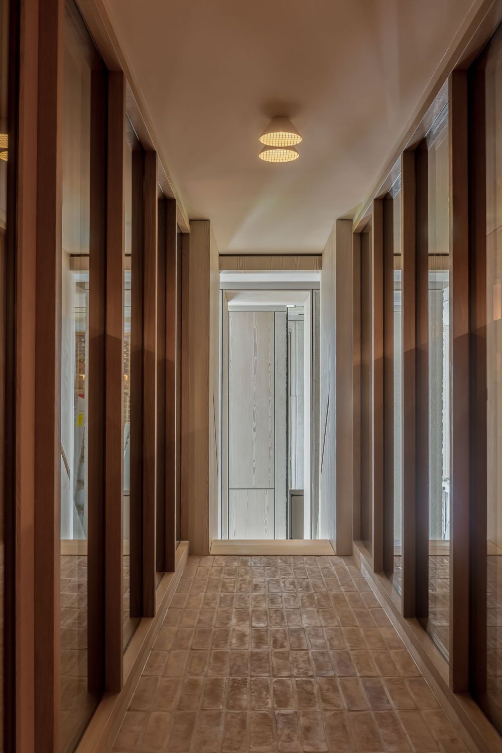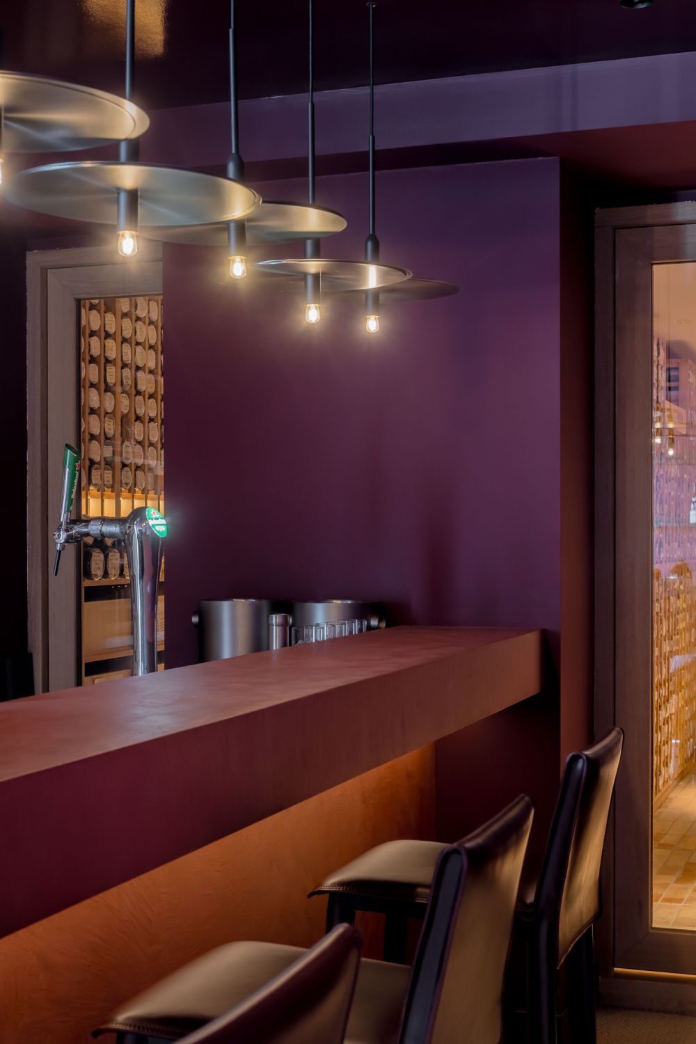 以木质走廊与暖光灯具构建 “情绪缓冲带”,地面的复古瓷砖与木质墙面形成材质对话,消解了外部环境的干扰,让客人从踏入空间的瞬间,便进入 “用餐仪式” 的准备阶段。走廊两侧的镜面设计延伸了空间纵深感,同时通过反射光影,为过渡区注入动态视觉元素。采用 “中心化 + 分散化” 的布局策略。中央区域以圆形餐桌为主,搭配深蓝色与棕色的座椅,形成视觉焦点;边缘区域则通过半私密的卡座设计,满足不同客群的社交需求。天花板的绛红色区块与浅色调墙面形成色彩对比,既界定了空间层次,又为用餐氛围注入了典雅质感。酒吧区与品酒室的设计是空间功能的重要补充。酒吧区以木质吧台与黑色金属吧椅为主,上方的圆形吊灯形成序列感,既满足了酒水服务功能,又成为空间的视觉亮点;品酒室则以满墙的酒架为核心,木质格栅与暖光照明营造出 “藏酒秘境” 的氛围,让品酒体验充满探索的仪式感。