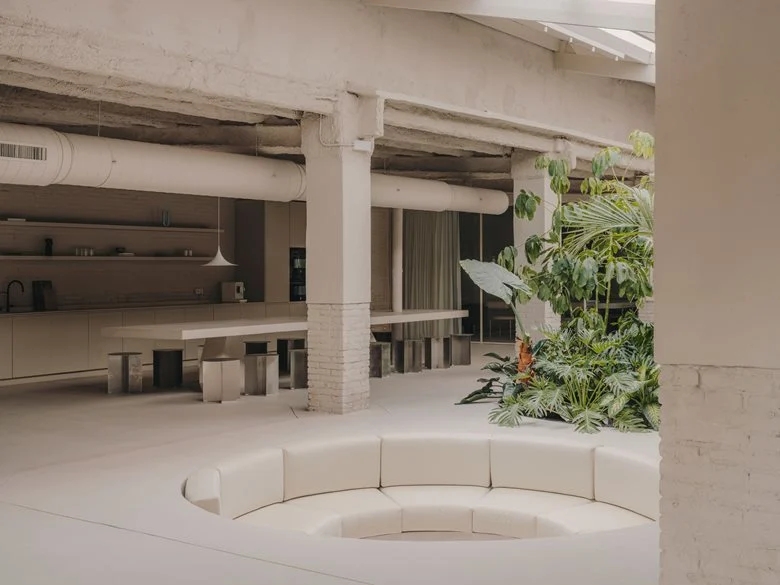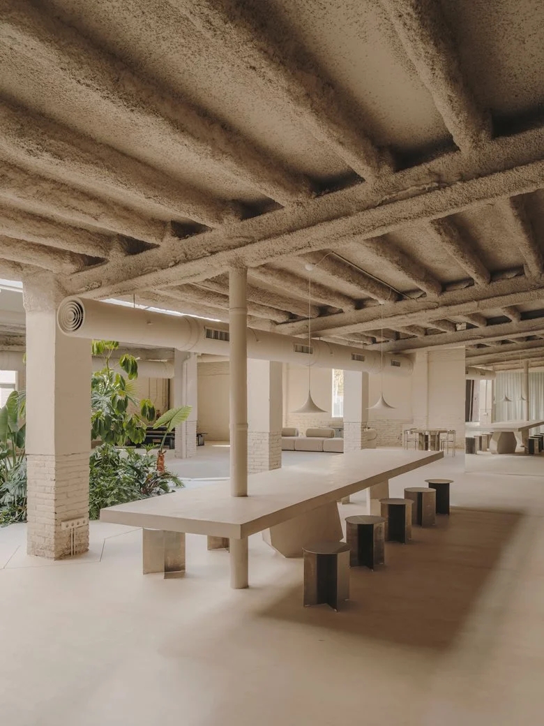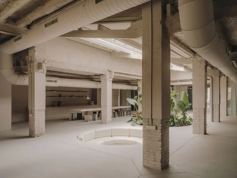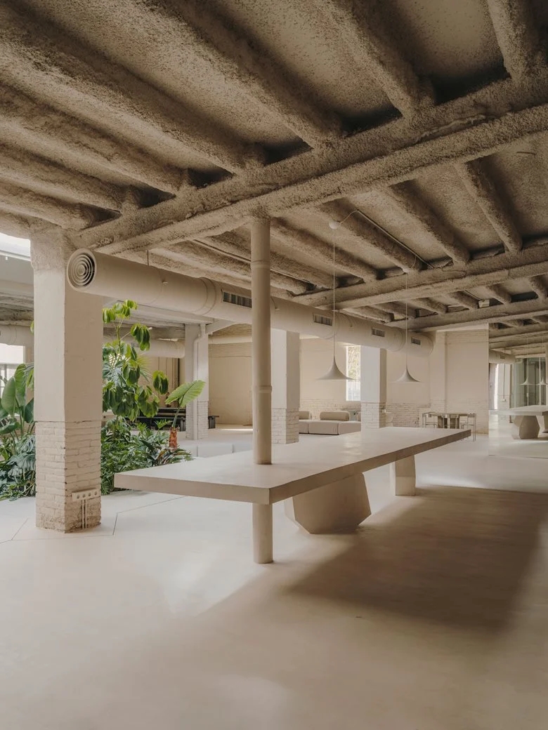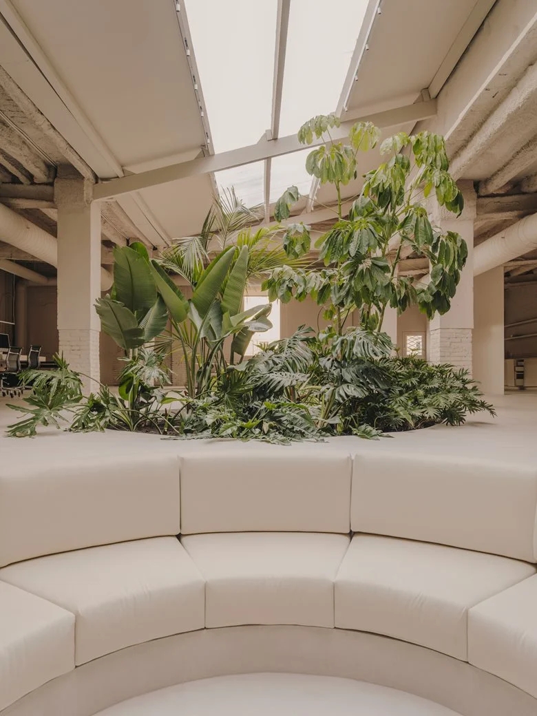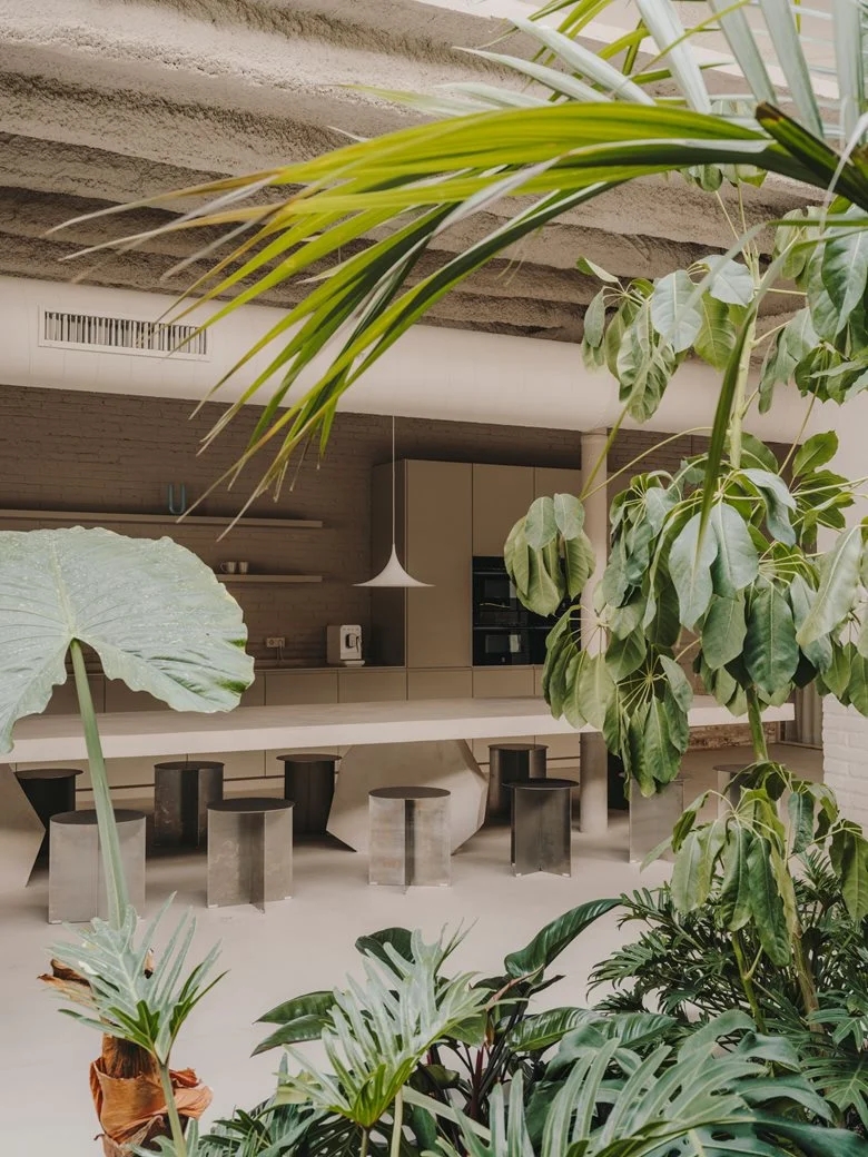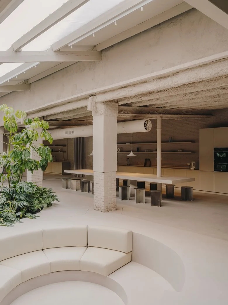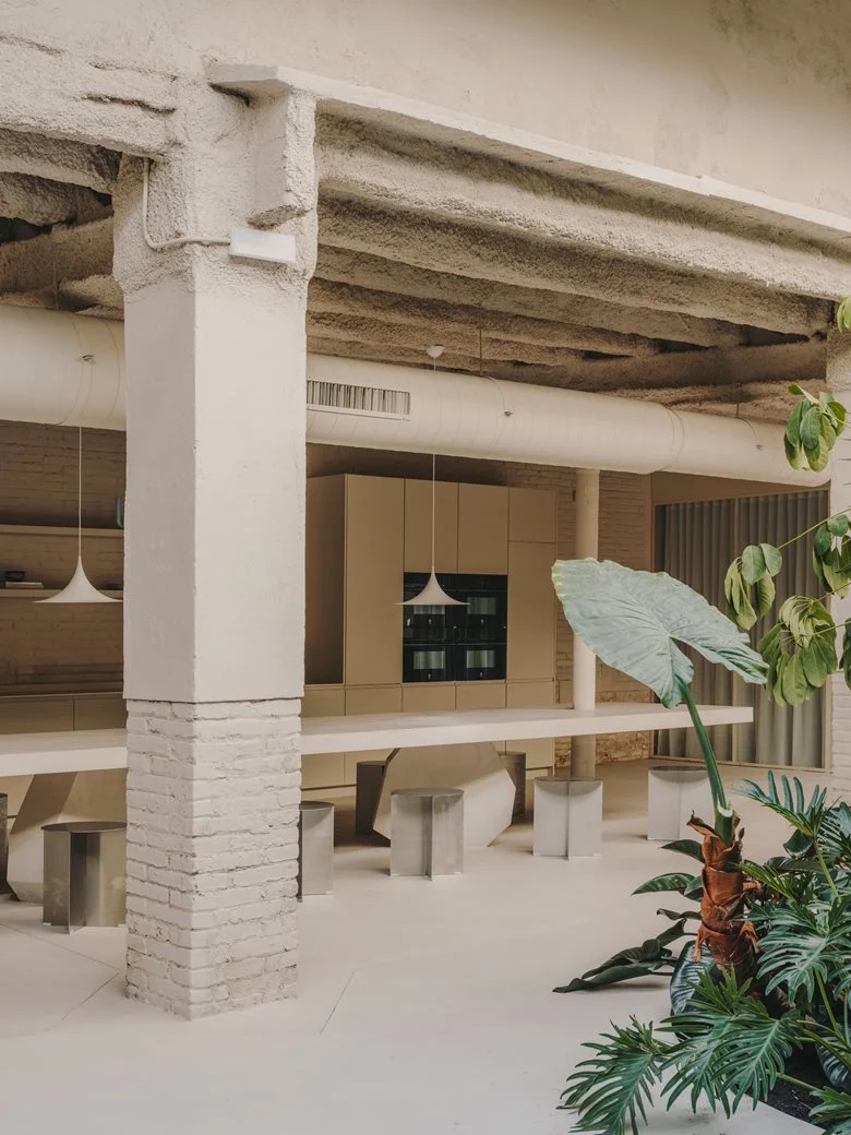 该空间的设计理念是创造一个大型的室内花园,并围绕花园布置不同的区域。赋予空间及其原有体积以价值,并以天顶的方式引入光线,让人联想到罗马房屋的庭院。光线和植被成为项目结构的中心。