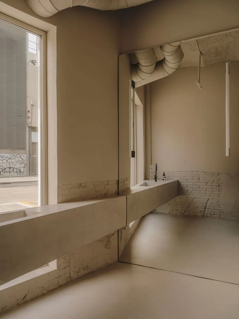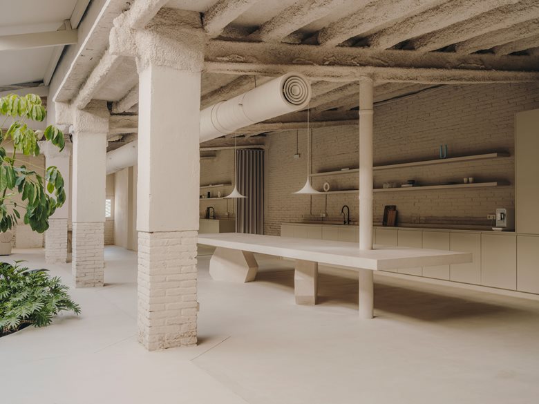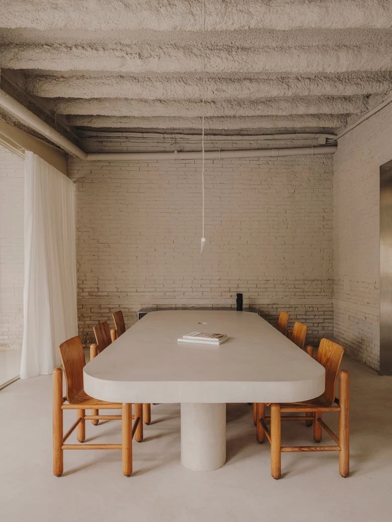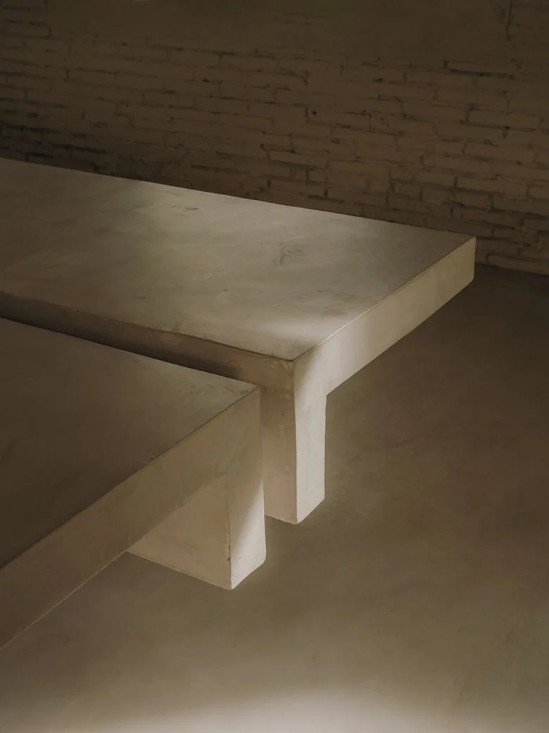 2.工作台 工作区位于左侧,紧邻俯瞰通道的窗户,这样人们可以获得更多的自然光。为解决这一空间问题,我们专门设计了一张大型混凝土桌子。桌子的外壳被设计成一个 16 米长的大型 biga,由两块混凝土块支撑。这是一张雕塑桌,赋予了空间独特的个性。