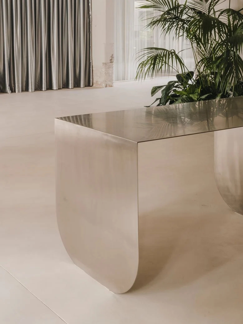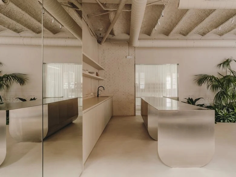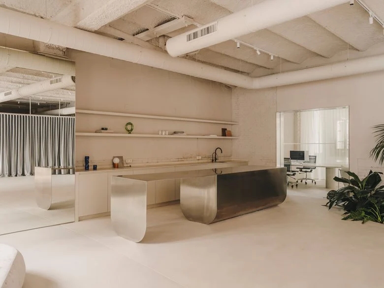 这样,就形成了第一个estrada空间,一个大型不锈钢吧台在这里欢迎您的到来。在这个空间里,模特们第一次到访时会看到一个更私密的工作空间。这是一个定制设计的雕塑作品,在轻与重之间取得平衡,形成一个线条简约的雕塑。在这个空间里,可以通过一组轨道拉上窗帘,为模特提供拍摄空间。