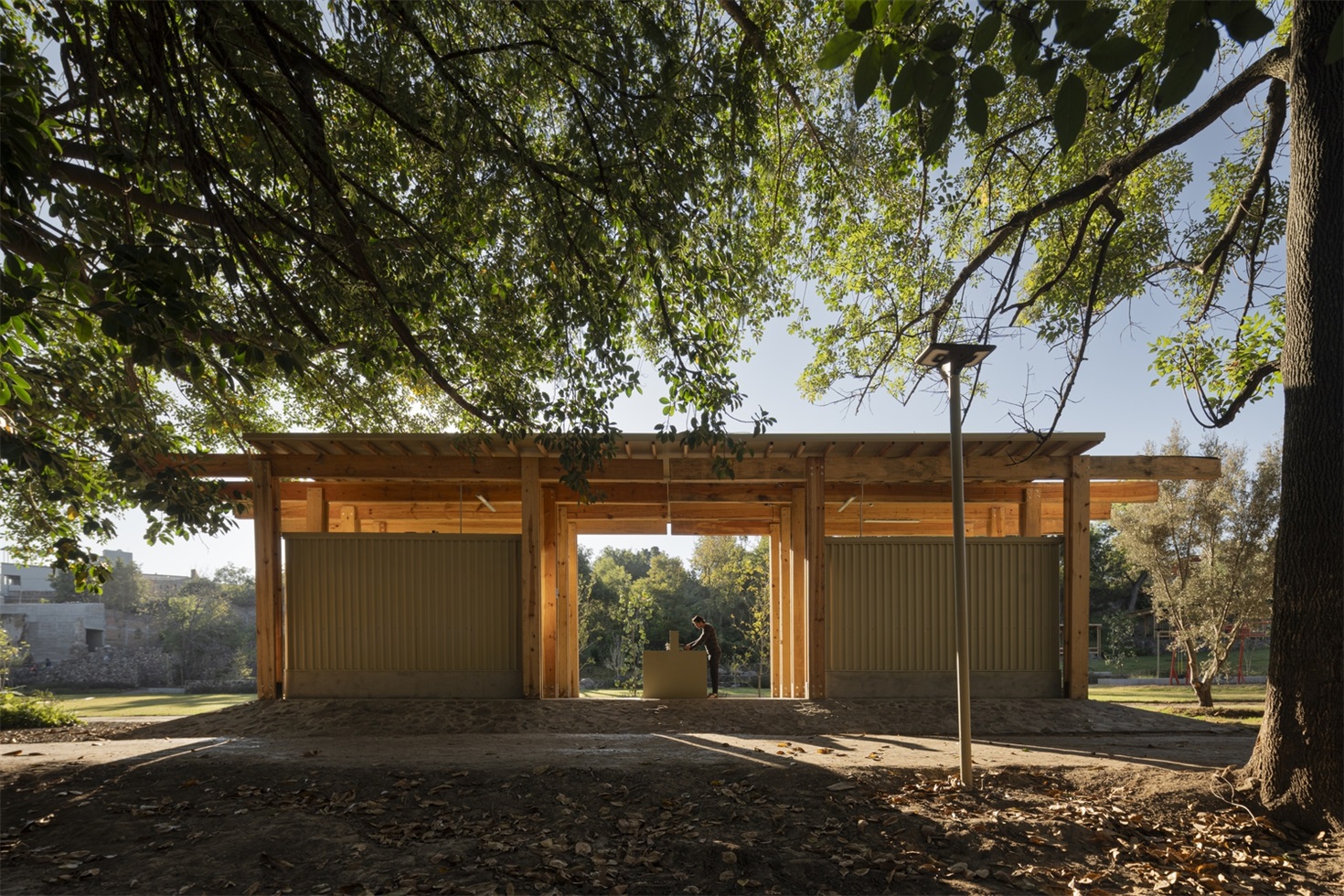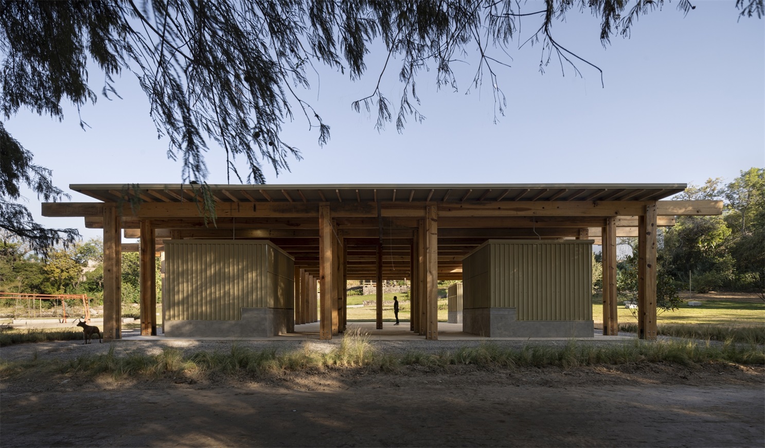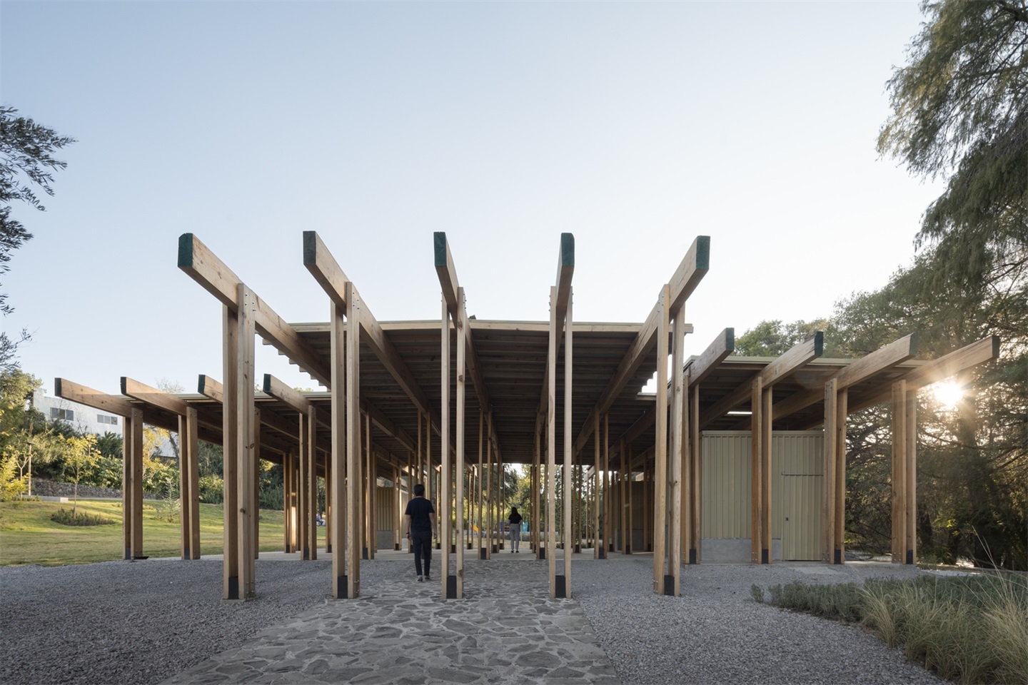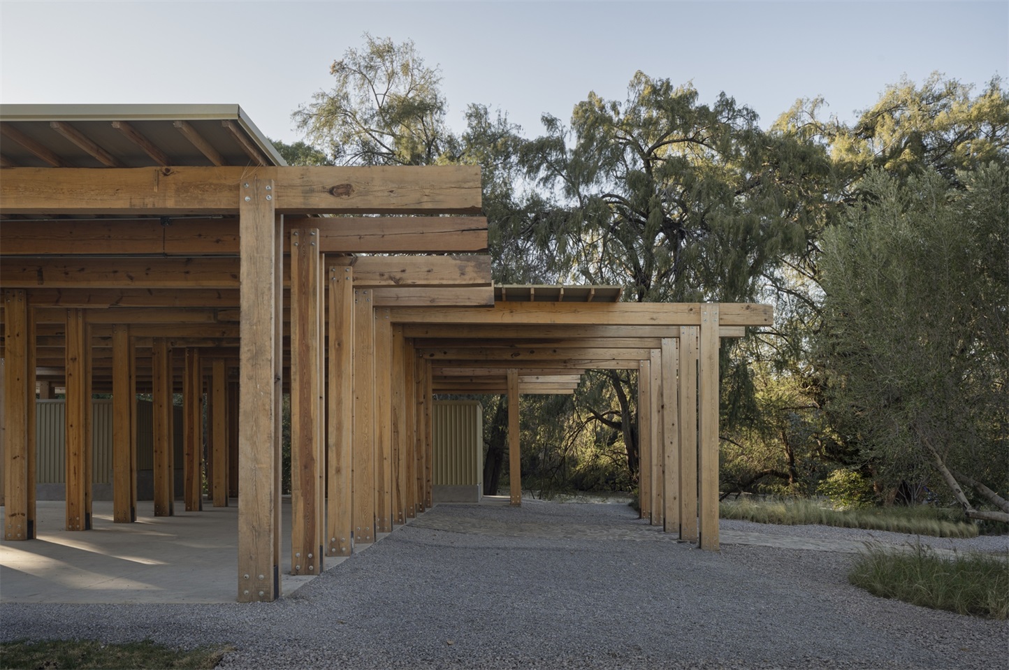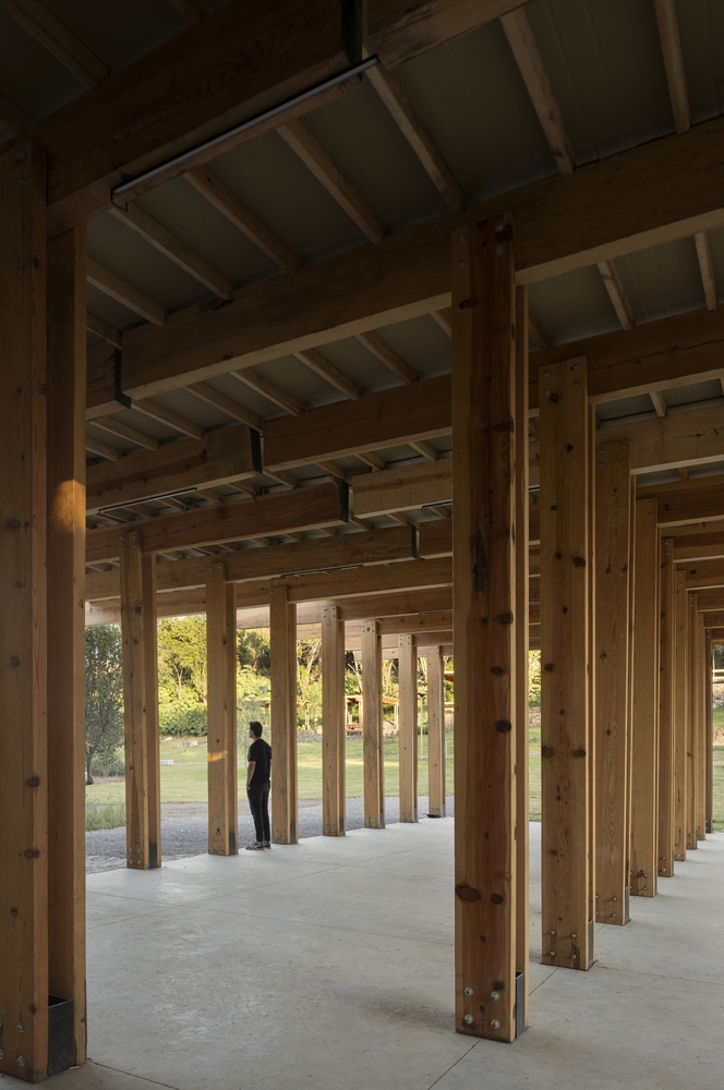 服务亭和餐饮亭采用轻质木结构,由双梁和柱体系构成,形如 “双 T”。在餐饮亭中,这种结构体系的韵律感创造了一系列动态空间,能够举办文化活动和与自然遗产相关的活动。