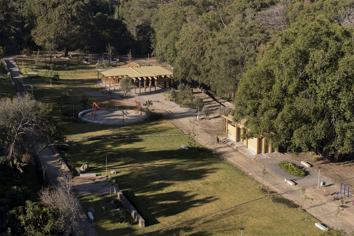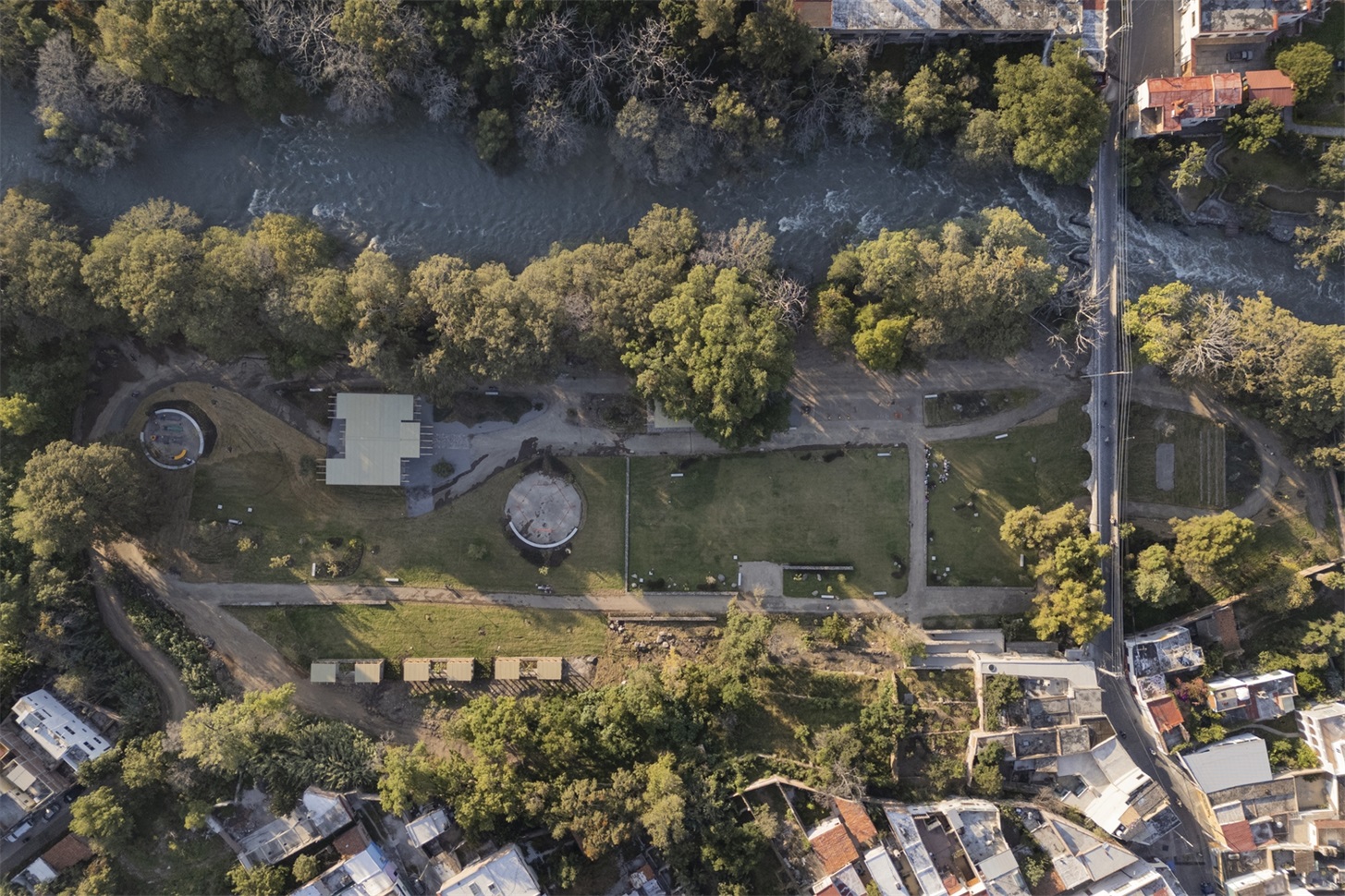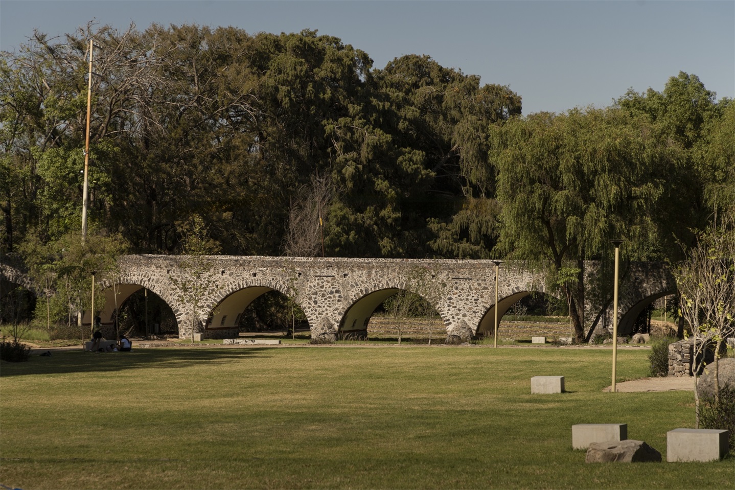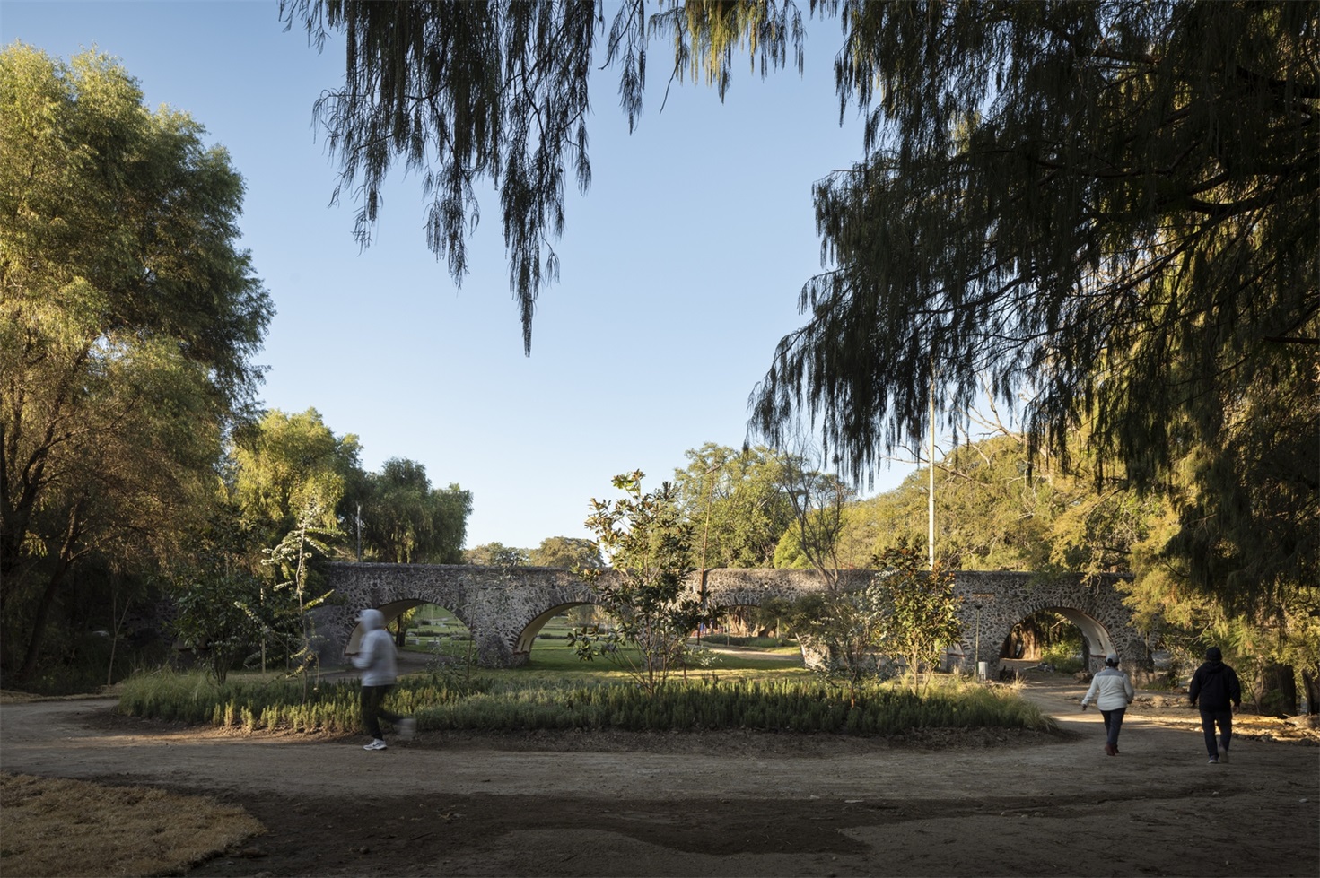公园被划分为三个大型开放式地形平台,逐级下降至桥梁基座,桥梁则作为视觉焦点保留。这些平台可举办大型户外活动。公园周边的路径由改良的特佩塔特(tepetate)土铺成,搭配石墙。
