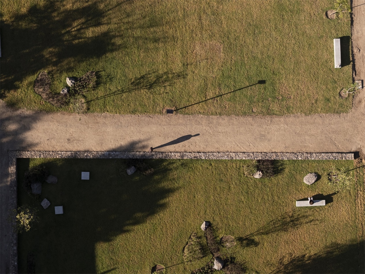 生态公园包含多种改造措施。入口作为一道门槛,由一栋老房子的遗迹与新浇筑的混凝土结构整合而成 —— 新结构在形式上依附于遗迹,以重构其形态。该结构内设有售票处和观景坡道,通过石砌挡土墙引导人流进入公园。