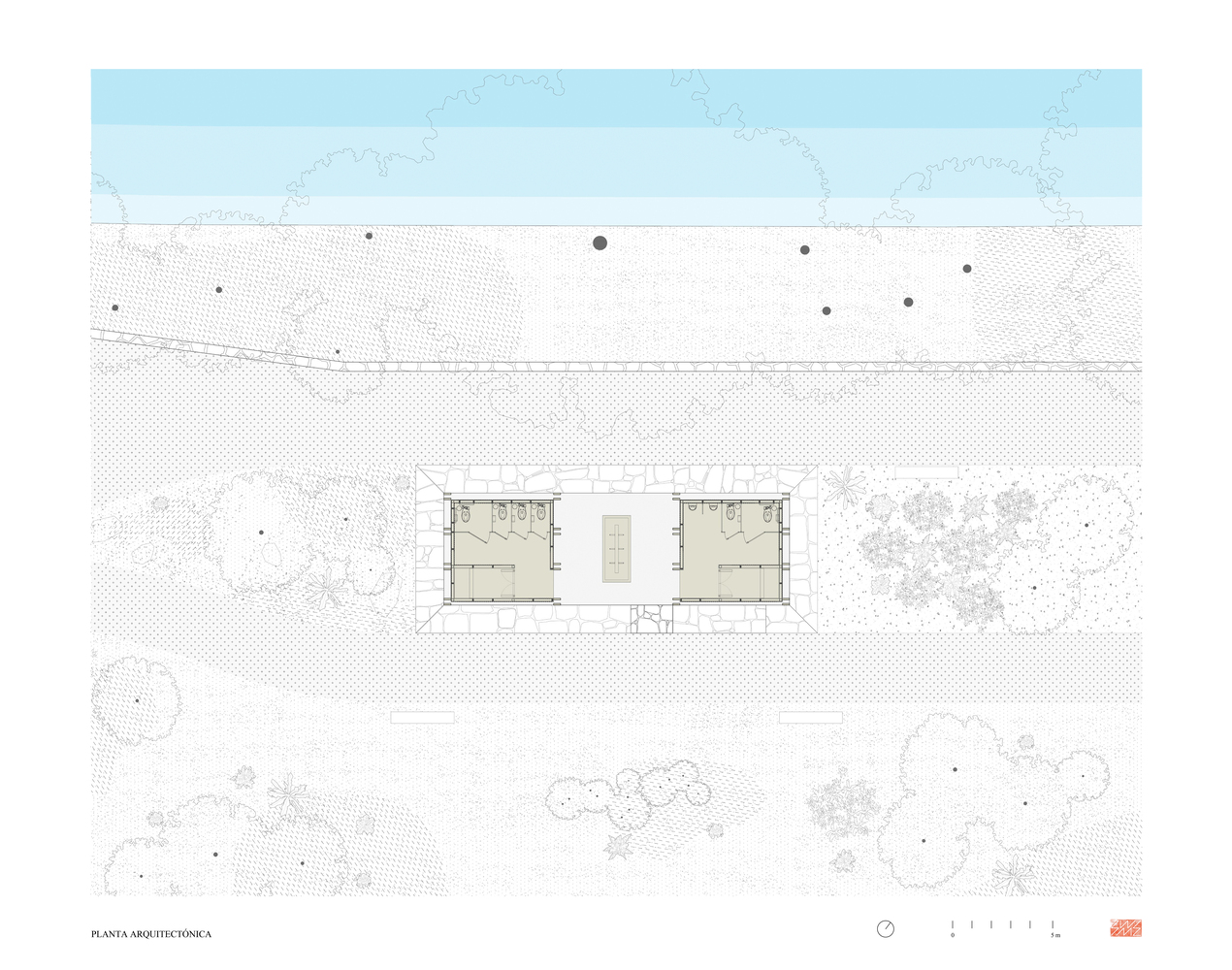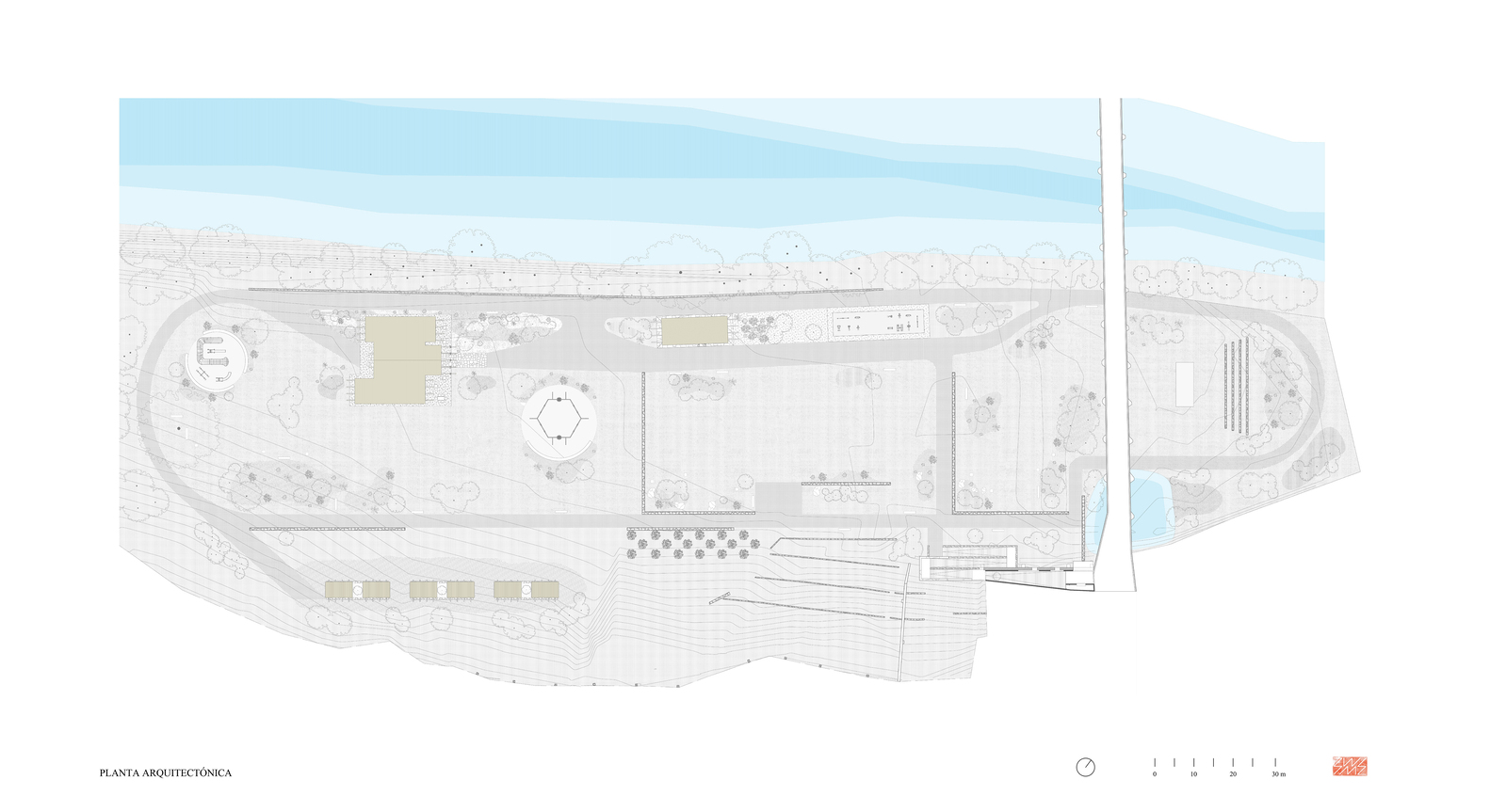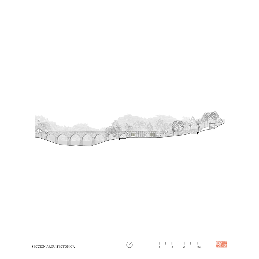 该项目的目标是通过对场地敏感的设计为城市增值:强化现有的景观结构(由果园和河岸沿线的巨大萨比诺树组成),并向公众开放这片生态保护区,同时强调桥梁的遗产价值。