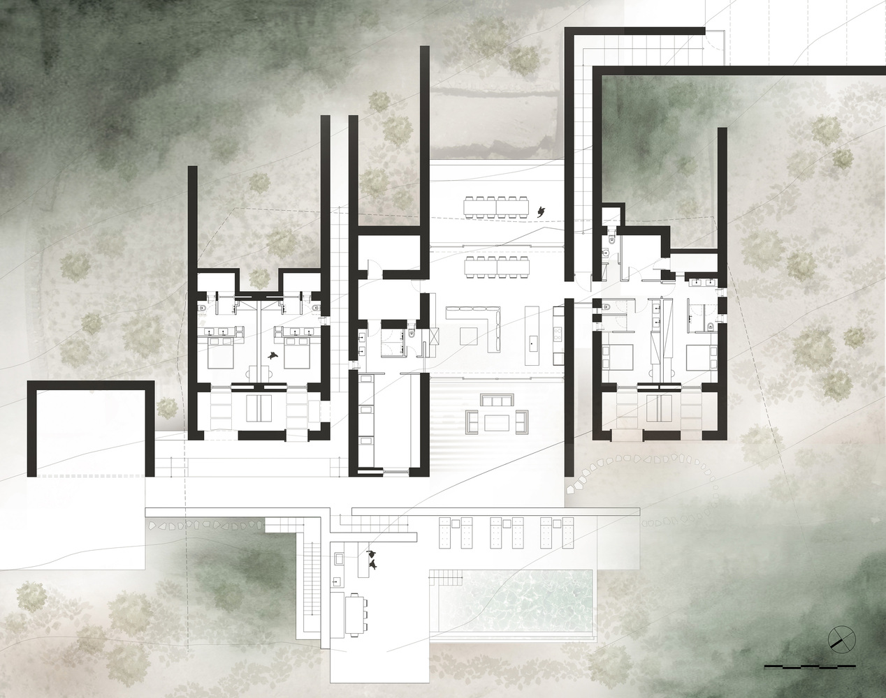 一系列空间变化和连续的场景构成了当代的居住体验。作为物质实体的建筑,在人类活动的移动、流通、路径和空间面前退居次要地位。住宅是自然地形的延续,以最简单的干预形式确立自身的存在:界定人类活动范围的石墙。这些墙壁遍布地块,邀请居住者从不同的入口进入住宅,打破了典型乡村住宅的传统路径。