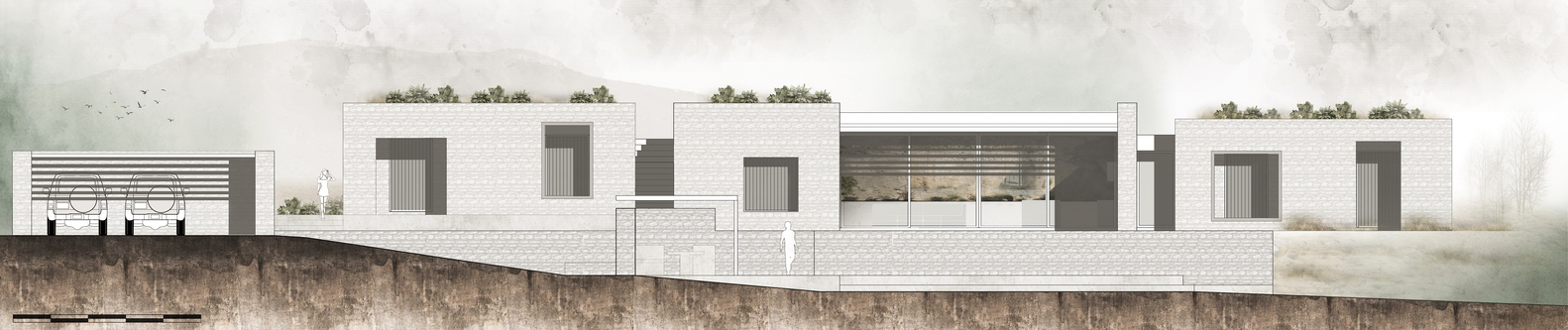 在这样的背景下,住宅逐渐成形,其建造使用了从挖掘过程中提取的石头。朝向景观的横向墙壁形成了通道、入口楼梯、纵向视觉轴线和活动空间。这些墙壁根据景观、场地和岩石来塑造建筑。传统的挡土墙(pezoules)沿着地形和地势延伸,而住宅的墙壁则深入土壤,从土壤中崛起,并在此基础上塑造居住空间。主入口位于地块的东部,即地势最高处。当墙壁穿过住宅时,在西侧形成封闭庭院,保护卧室并创造私密区域。
