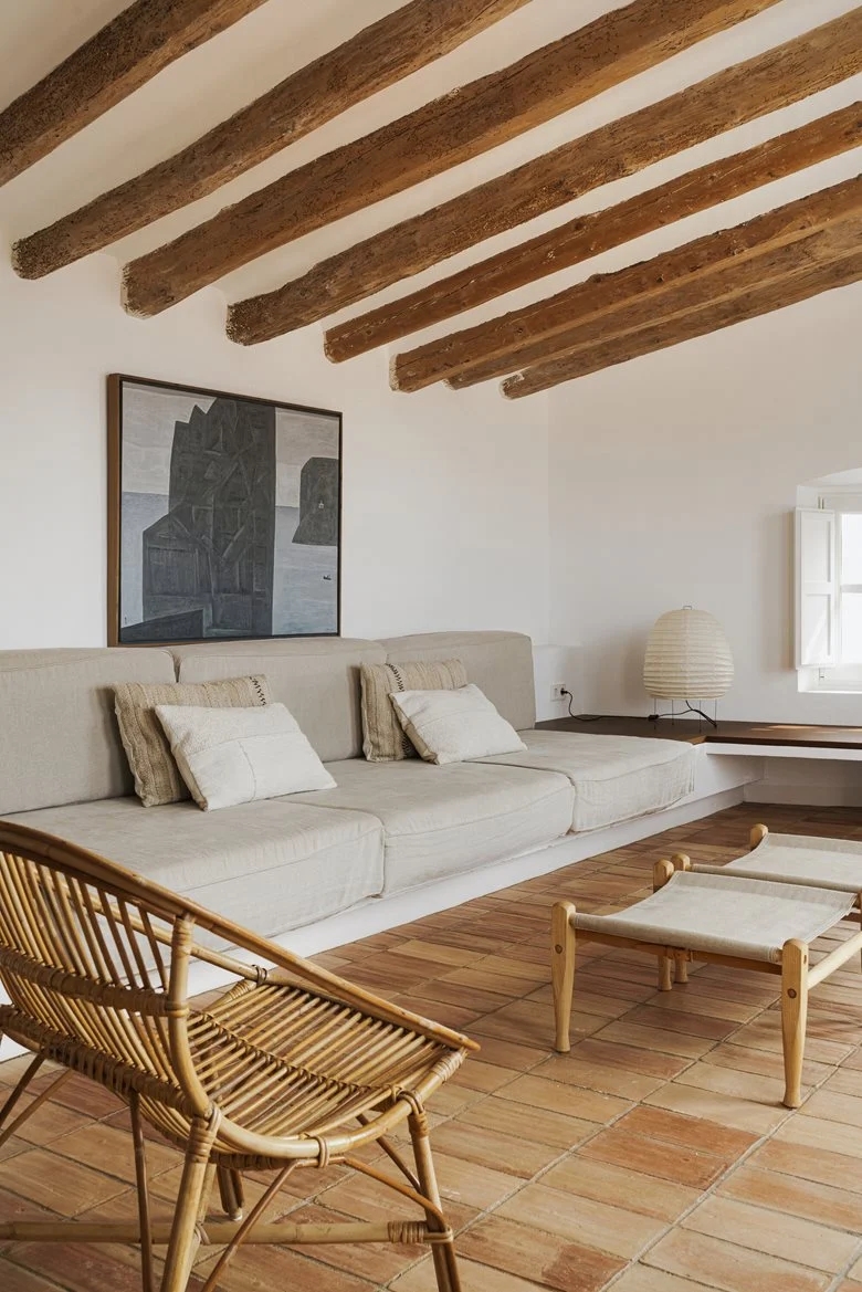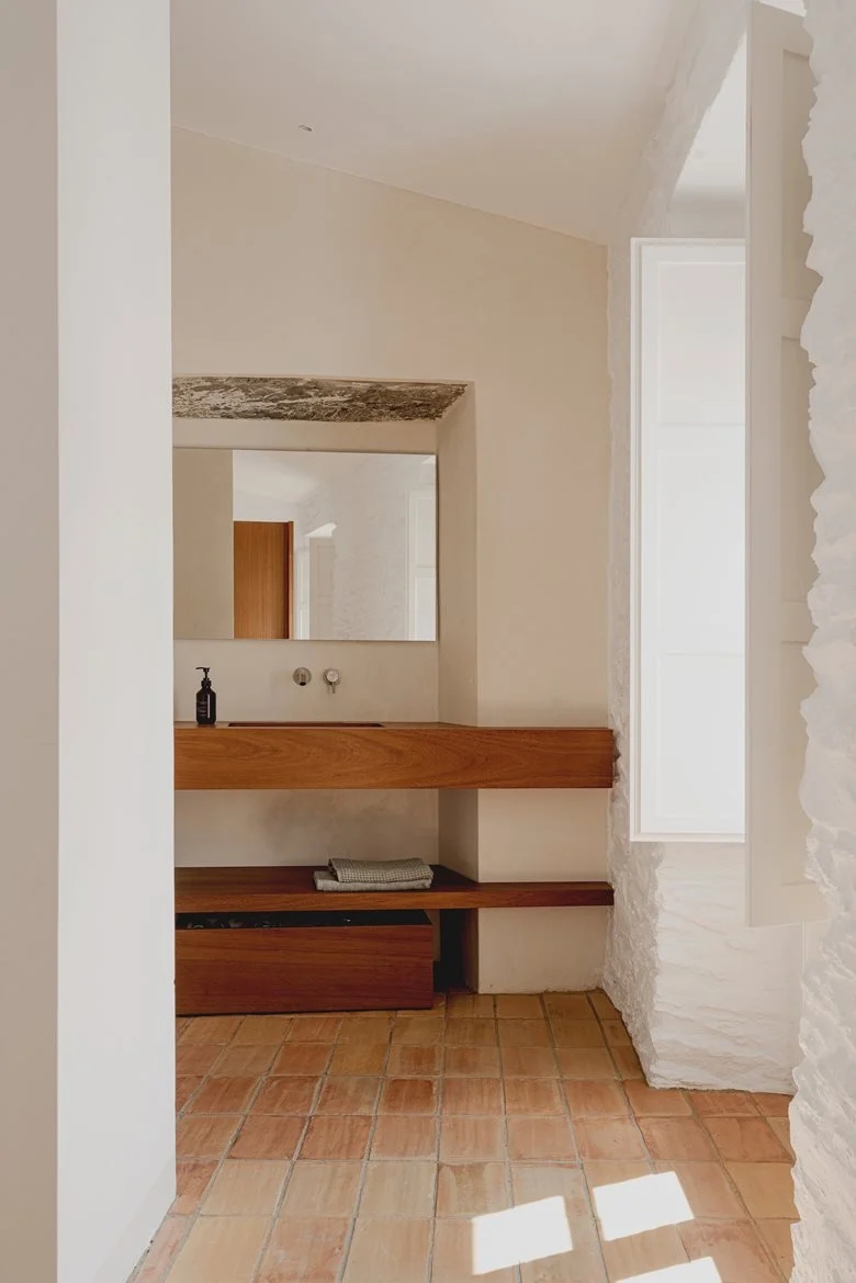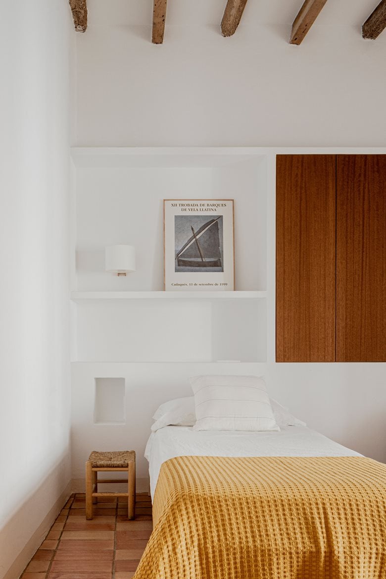 二层设有卧室与浴室 —— 这些私密空间以宁静、舒适与私密为设计核心。三层向地中海的阳光敞开怀抱,这里有一个沐浴在阳光中的露台,可眺望海景,为小屋画上点睛之笔,成为休憩与沉思的绝佳去处。项目的主要目标之一是将传统材质与现代美学相结合。改造中修复了原始的陶瓷砖,唤起人们对这片土地的记忆;而白色石灰抹灰墙面既强化了地中海氛围,又能让建筑 “呼吸”—— 这在恩波达(Empordà)海岸潮湿的气候中至关重要。